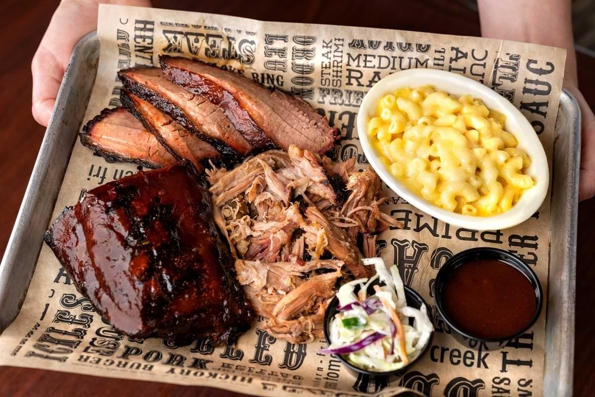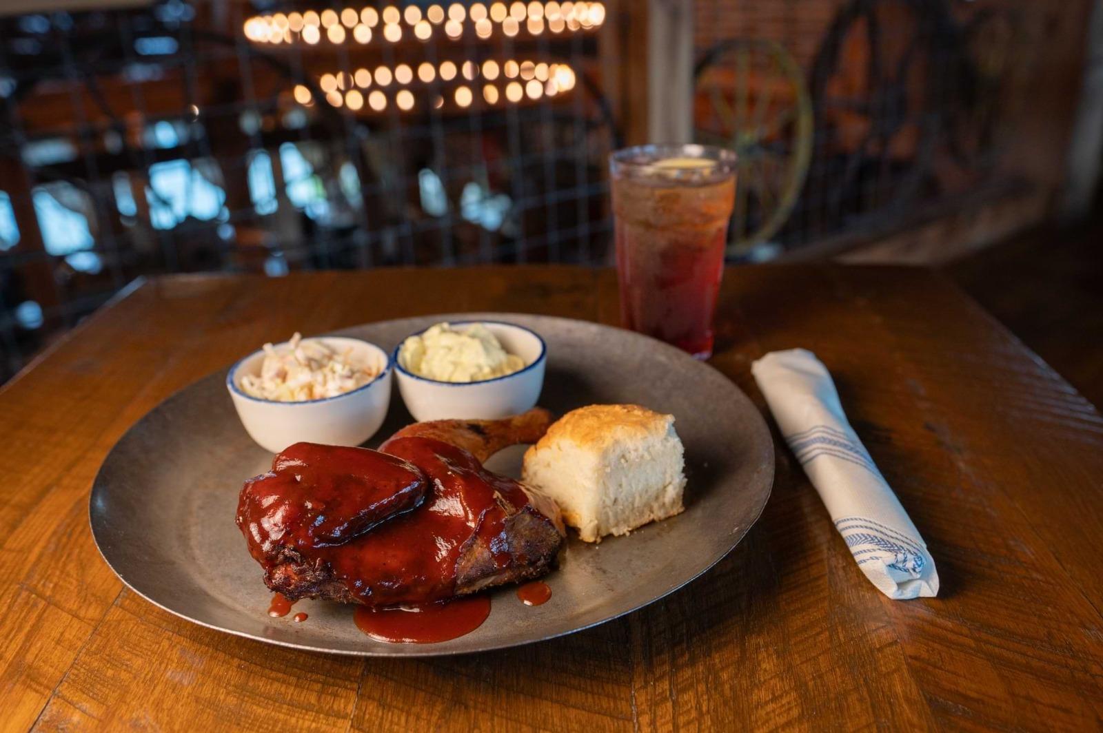 The Pigeon Forge location at 2480 Parkway serves cherry wood-smoked pulled pork, smoked half chicken, beef brisket, Southern fried chicken, smoked meatloaf, and fried catfish. The barbecue options pair with two sides and a signature Cajun corn cake, adding a slight Louisiana twist to traditional Tennessee preparations.
