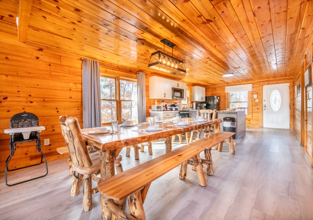 The fully-equipped kitchen boasts modern amenities making it easy to prepare delicious meals for your family or friends. Well-appointed with a full-sized refrigerator, stove, microwave, and other kitchen appliances perfect for making breakfast, lunch, or dinner throughout your stay! All pots, pans, glasses, plates, silverware, etc. are also there for you! Gather around the huge wooden dining table to share stories about the day's adventures.