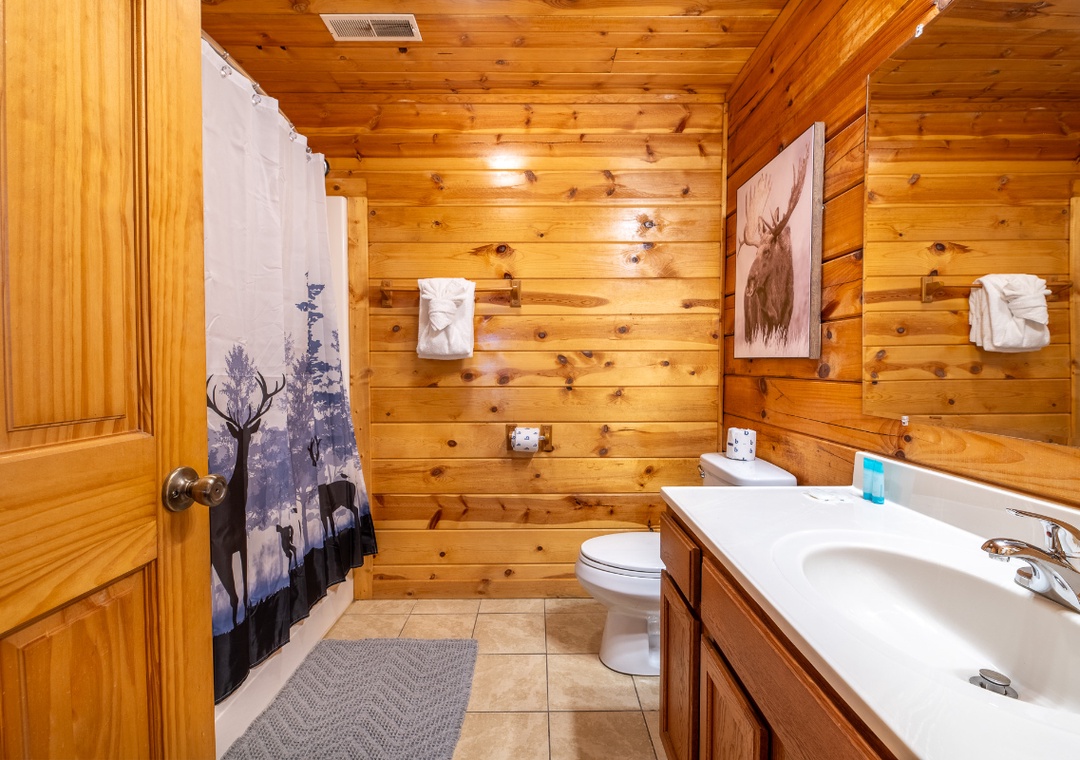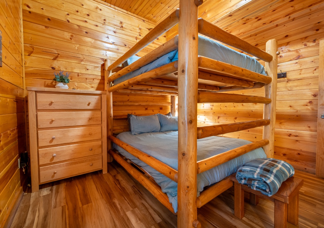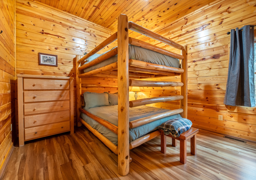 ✔ Bedroom #4 (Lower Level): Inviting Bedroom with a Queen-over-Queen Bunk Bed, Flat-screen TV (HULU+ Live TV, Disney+ and HBO MAX); Attached Full Bathroom with Shower/Tub Combo