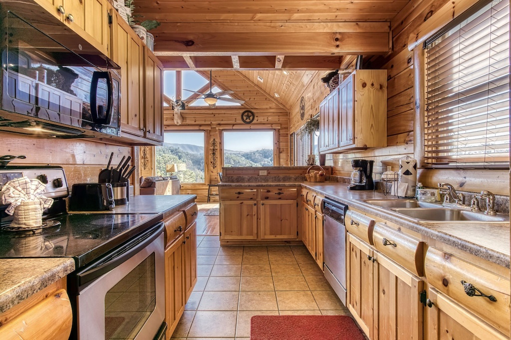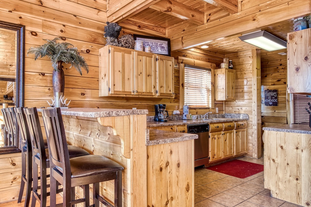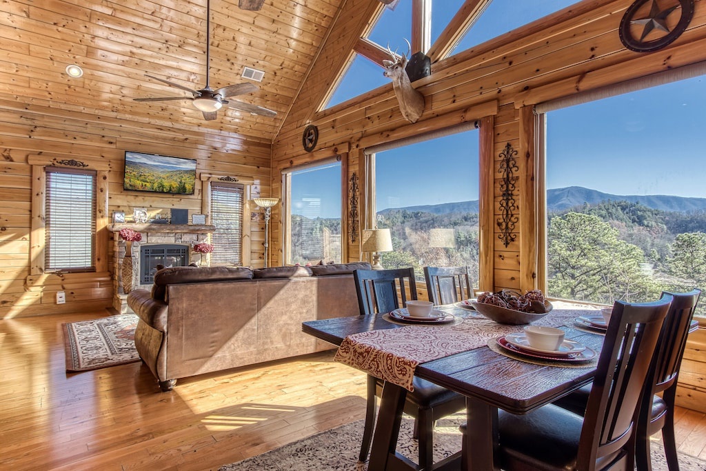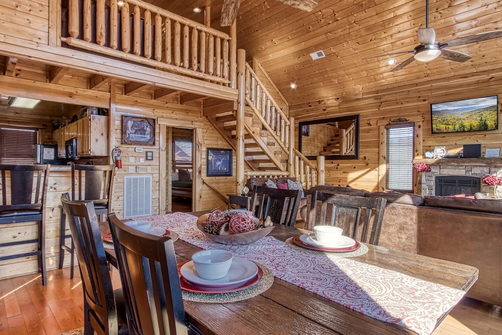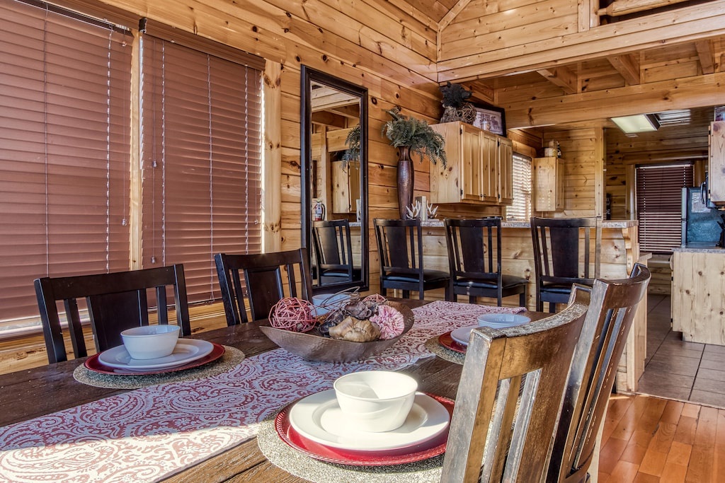 The cabin features a fully equipped kitchen, where you can channel your inner chef and prepare delicious meals for the family. Well-appointed with a full-sized refrigerator, dishwasher, stove, microwave, and other kitchen appliances perfect for making breakfast, lunch, or dinner throughout your stay! All pots, pans, glasses, plates, silverware, etc. are also there for you. The dining area provides a cozy setting for shared meals and additional seating on the bar, all while being surrounded by tons of natural light and incredible views!