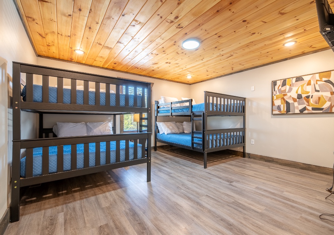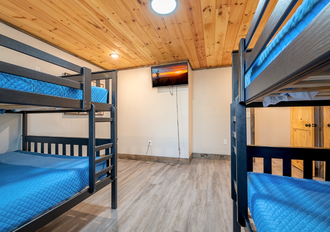 ✔ Bedroom 4 (Main Level): Spacious Bedroom with 2 Queen-over-Queen Bunk Beds and a flatscreen TV; Access to a Full Bathroom with Stand Up Shower