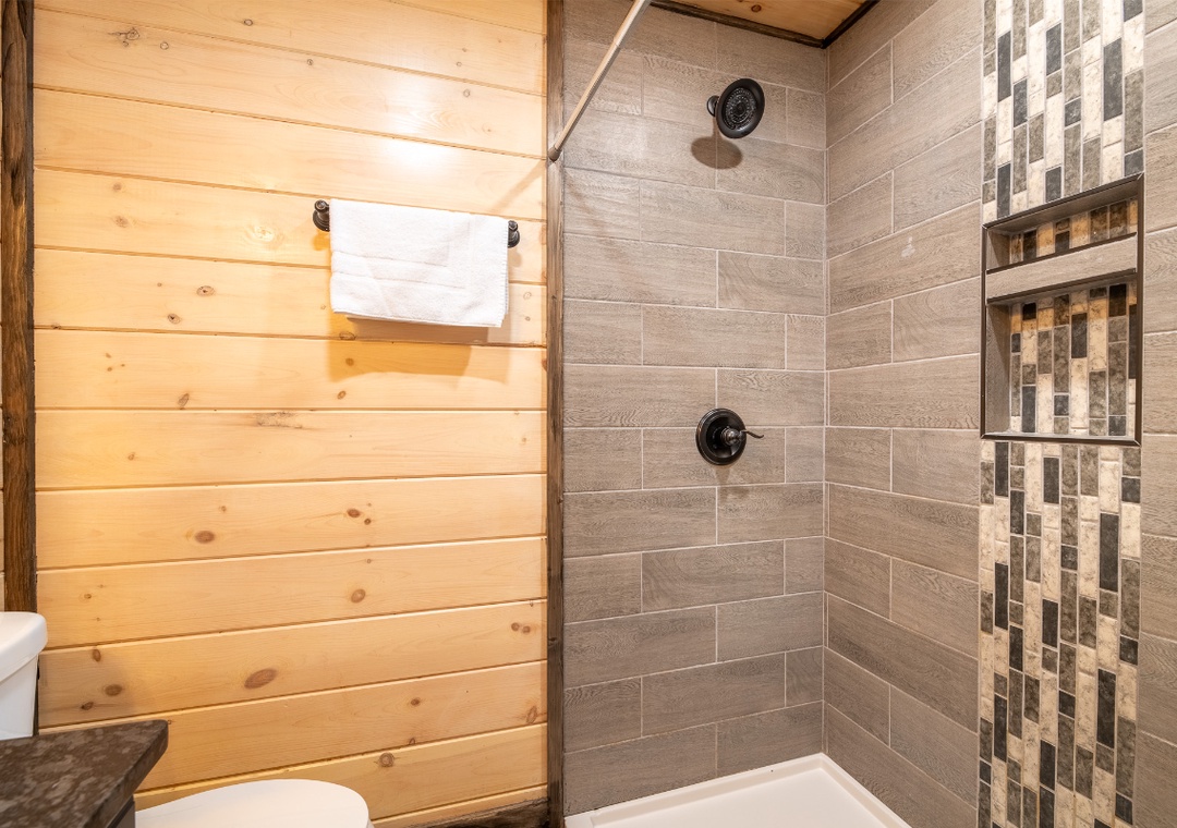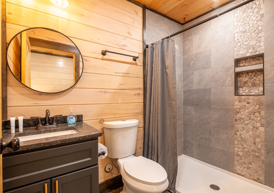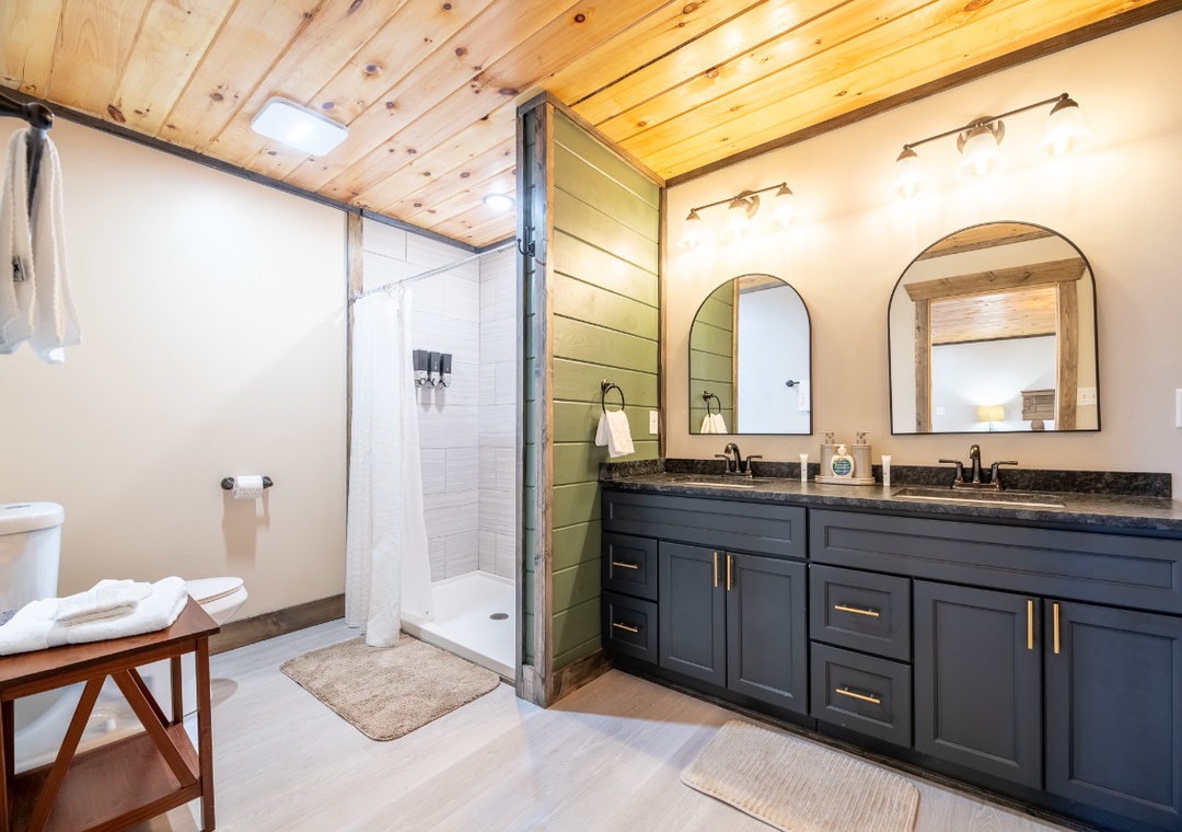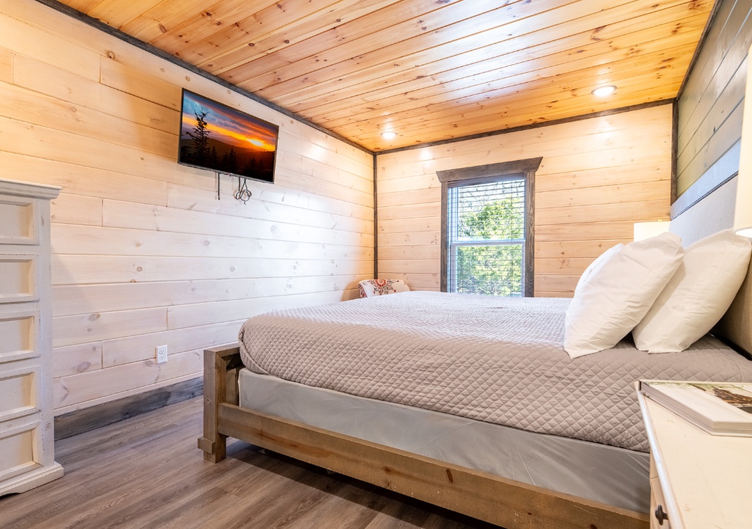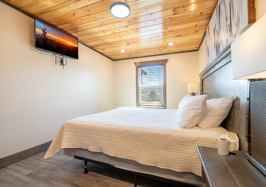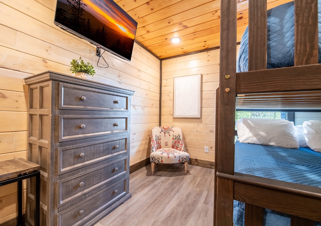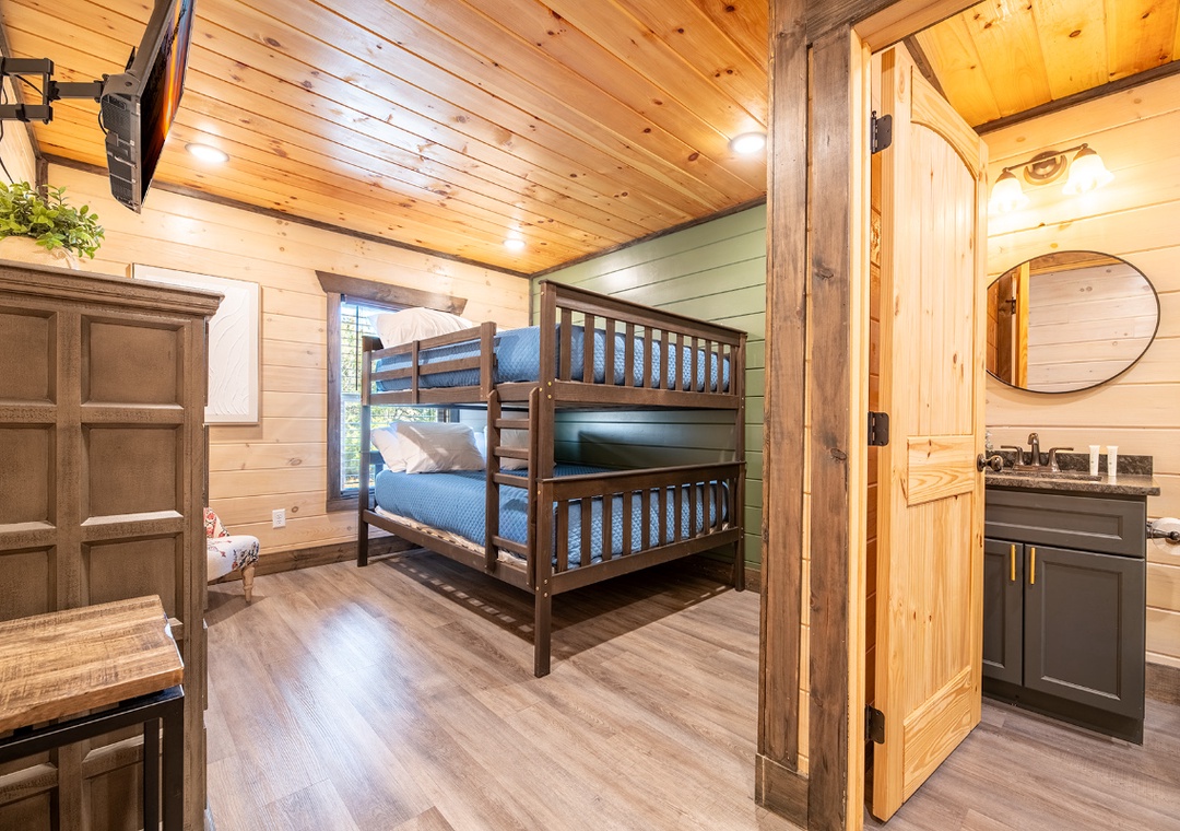 ✔ Bedroom 2 (Main Level): Spacious Bedroom with a Queen-over-Queen Bunk Bed and a flatscreen TV; Attached Full Bathroom with Stand Up Shower