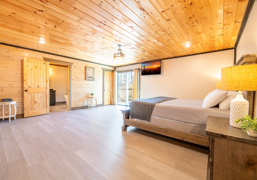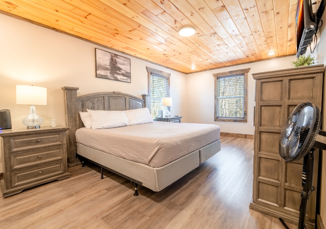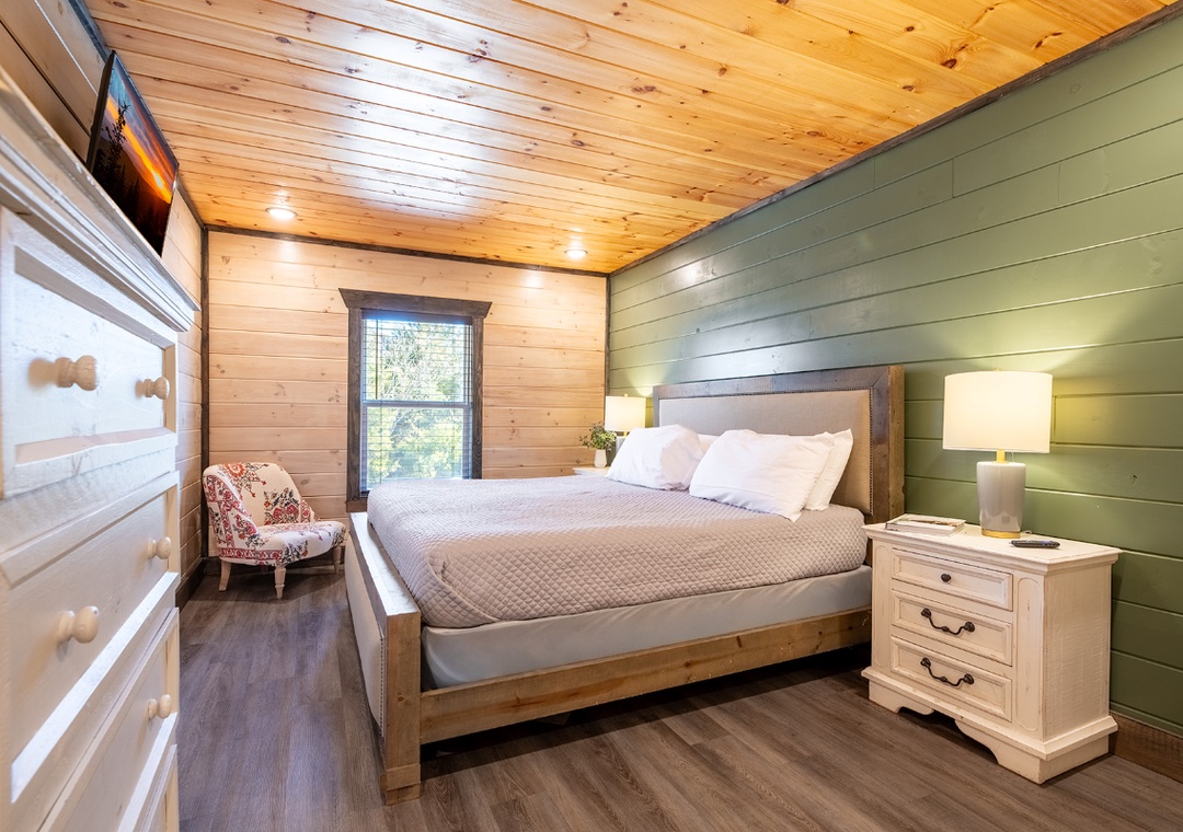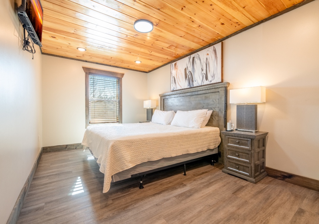 ✔ Bedroom 1 (Main Level): Spacious Bedroom with a King-Bed and a flatscreen TV; Access to a Full Bathroom with Stand Up Shower