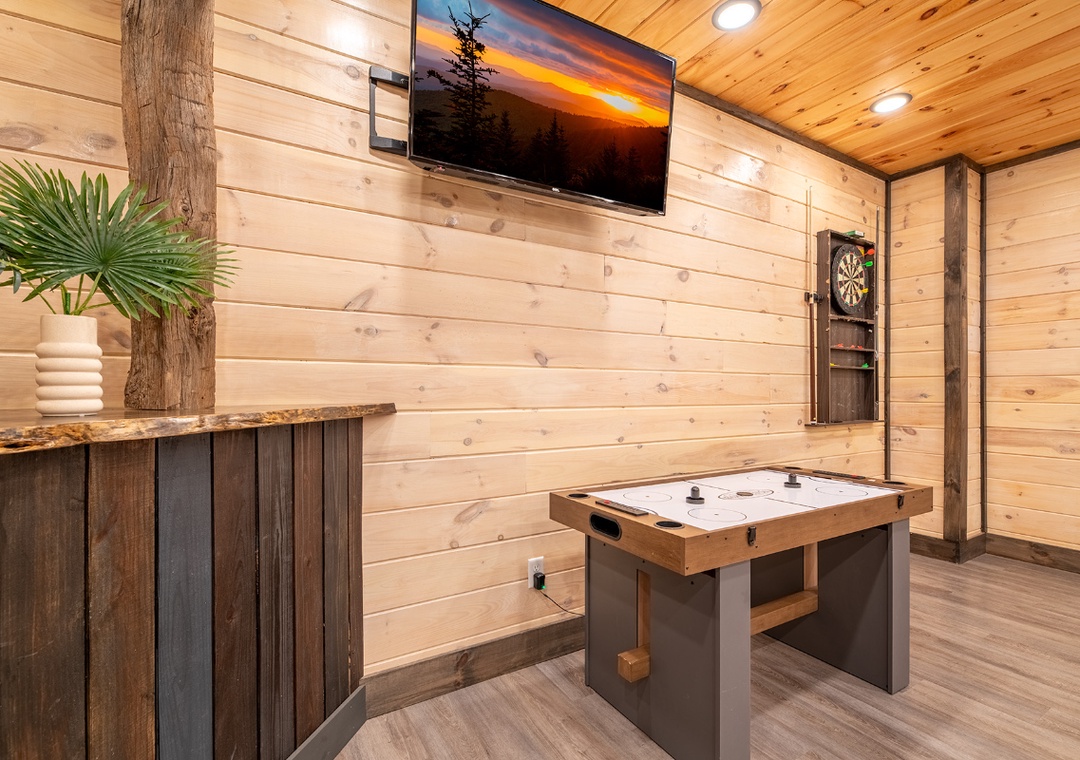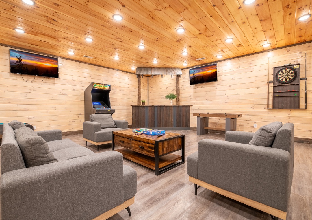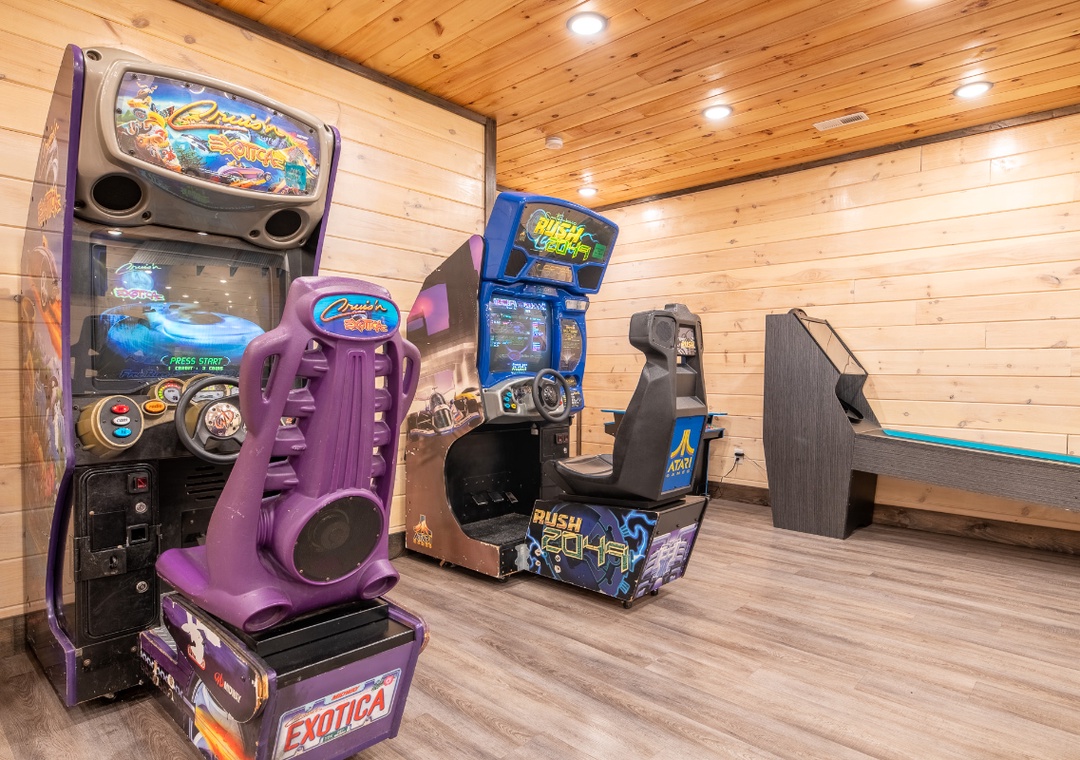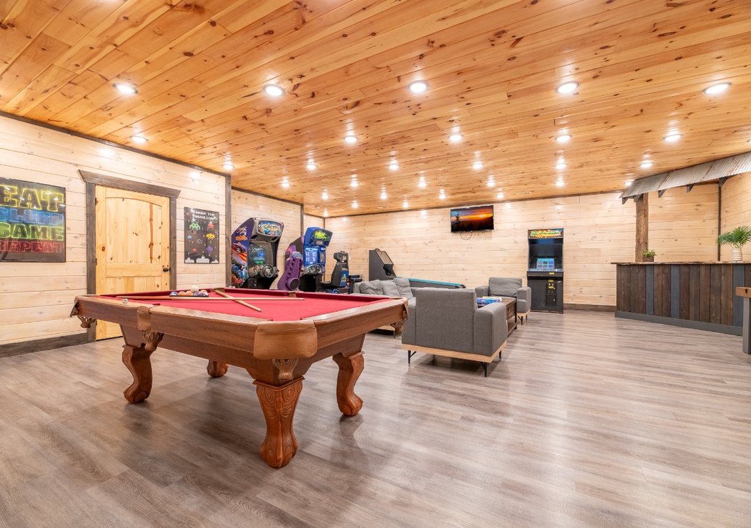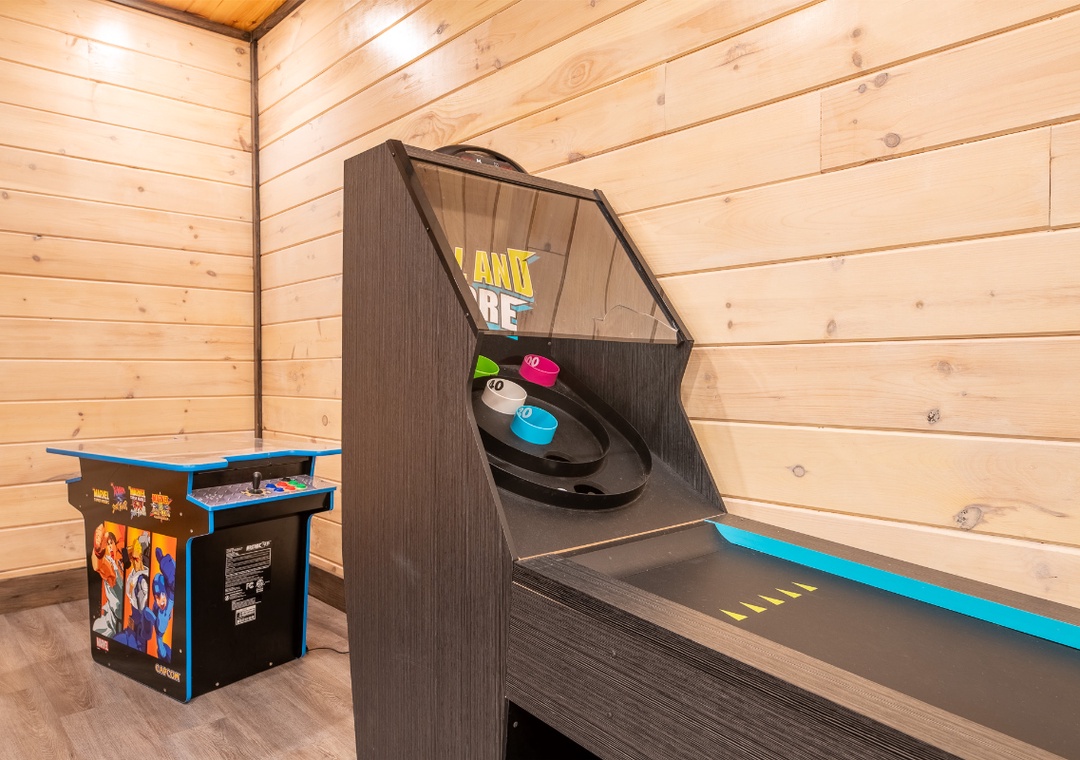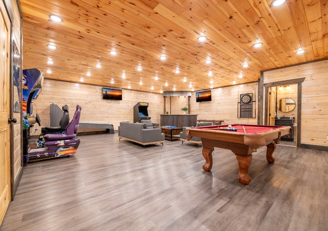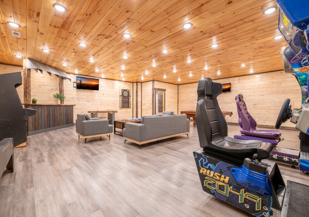 The fun starts the moment you walk in. The main living room sets the tone with an electric fireplace for cozy mountain vibes and a Roku TV that’s ready for streaming marathons or winding down after hours of play. Downstairs is where “Ain’t Life Grand” truly shines. The private heated indoor pool gives you year-round swimming without sharing space with anyone else, perfect for morning laps, afternoon splashing, or late-night swims no matter the weather. Just outside at the back of the property, the private hot tub offers a relaxing contrast to the action, while the nearby propane firepit creates the ideal hangout for evening drinks, laughter, and storytelling under the mountain sky. Movie nights are taken seriously here with a dedicated theater room featuring a massive 75” Google TV that turns any film, show, or sporting event into a true cinematic experience. Nearby, the game room offers a full-scale arcade and competition zone designed to keep everyone entertained for hours. Shoot pool, test your aim on the dart board, or jump into classic arcade action with a multicade and a dedicated classic arcade machine. Racing fans will love the two driving arcade games that let players go head-to-head, while the multitable delivers endless variety by switching between foosball, ping pong, and air hockey whenever the mood changes.