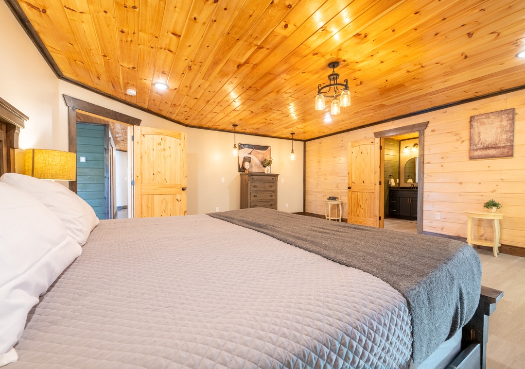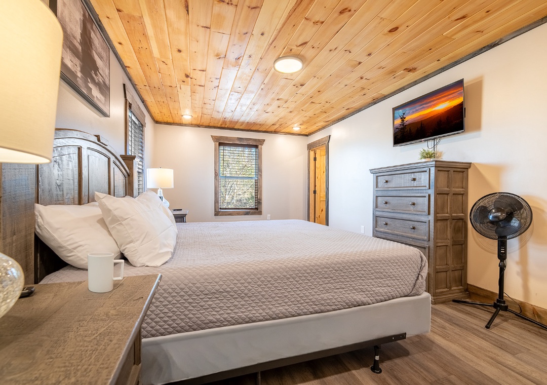✔ Bedroom 3 (Main Level): Spacious Bedroom with a King-Bed and a flatscreen TV; Attached Full Bathroom with Stand Up Shower