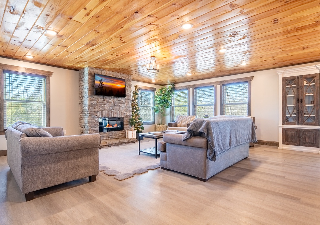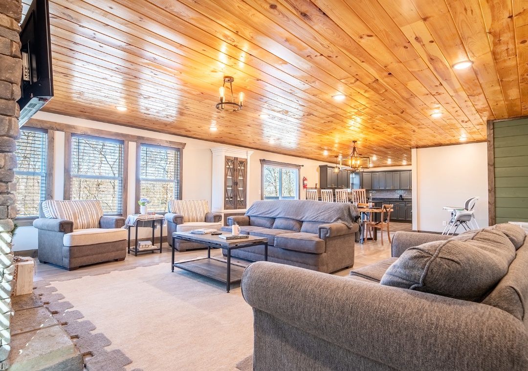 The heart of the home is the main living area, where an electric fireplace sets a cozy tone and invites you to slow down and settle in. Plush seating surrounds a Roku TV, making it the perfect spot for movie nights or watching the big game. The open layout flows effortlessly into the kitchen and dining area, creating an ideal space for shared meals and late-night laughter. The private heated indoor pool downstairs allows you to swim year-round. Nearby, the dedicated theater room takes movie nights to the next level with a massive 75-inch Google TV, immersive sound, and a setting that feels like your own private cinema. Still downstairs, the massive game room keeps the fun going for guests of all ages. Free WiFi is also available throughout the property.