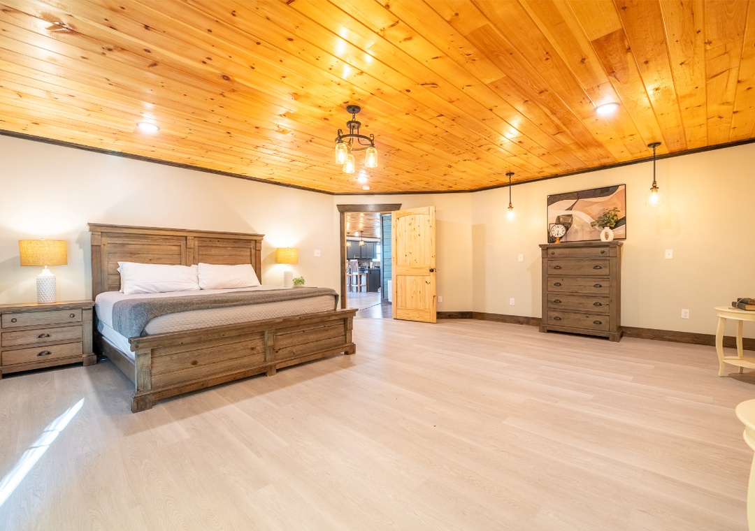 ✔ Bedroom 5 (Main Level): Spacious Bedroom with a King-Bed and a flatscreen TV; Attached Full Bathroom with Stand Up Shower