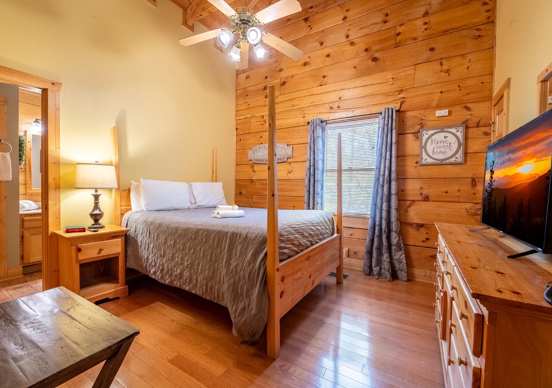 ✔ Bedroom #1 (Main Level): Comfortable Bedroom with a Queen-sized Bed and a Flat-screen TV; Attached Full Bathroom with Shower/Tub Combo