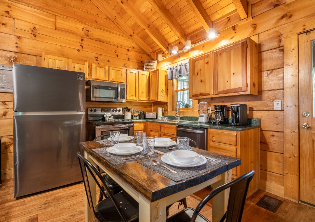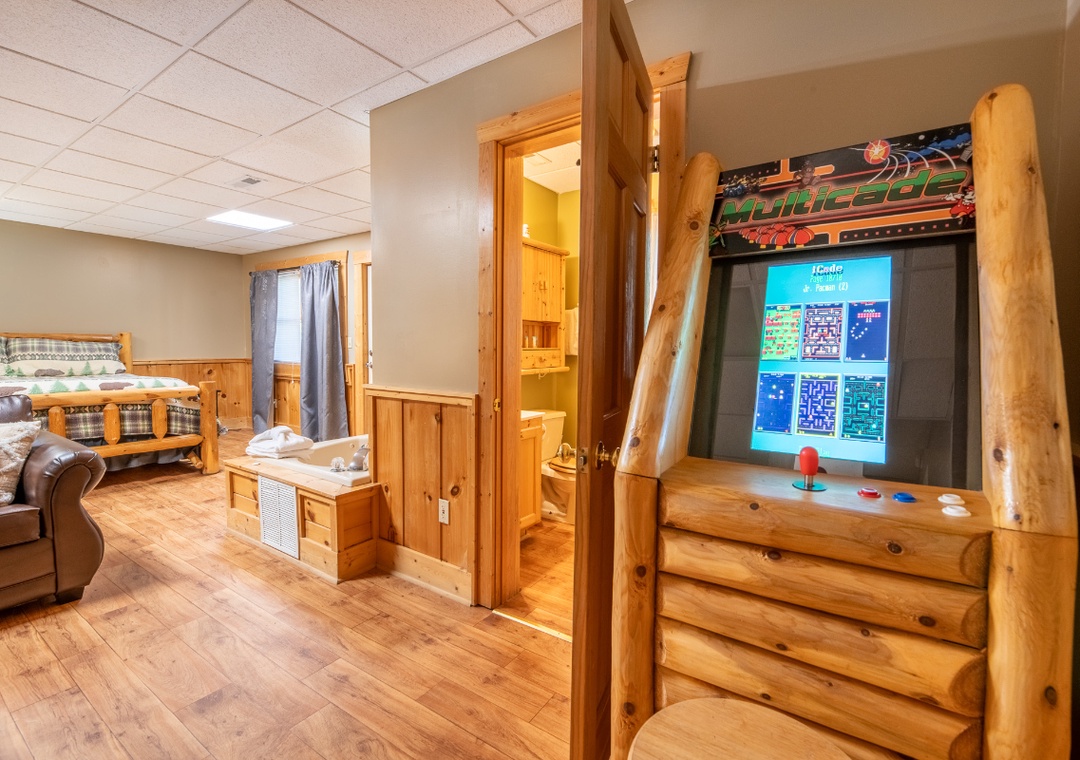 The main level features an open-concept living area that serves as the heart of the cabin. A gas fireplace creates the perfect ambiance during cooler mountain nights, while a 55" ONN Roku TV and DVD player offer hours of entertainment. Just steps away, the kitchen and dining area flow seamlessly into the main living space, making it easy to prepare meals while still being part of the conversation. Downstairs, you’ll discover a second living area that adds even more space to spread out and relax. This area features plush seating and a 50" Philips Roku TV, so everyone can enjoy their favorite shows or movies in comfort. Another electric fireplace adds a gentle glow and extra warmth, creating a cozy atmosphere perfect for reading, napping, or simply enjoying the peace and quiet. The highlight of this floor is the multicade arcade, offering classic games that will delight guests of all ages and bring a little fun and nostalgia to your stay. Free WiFi is also available throughout the property.
