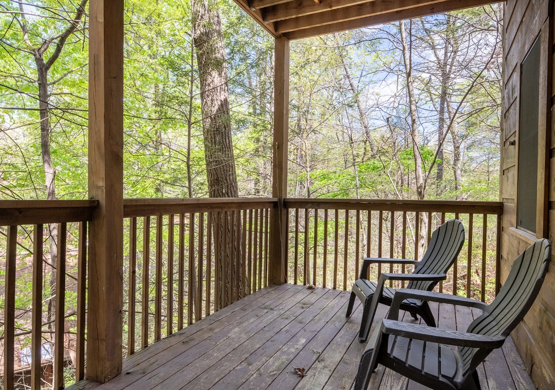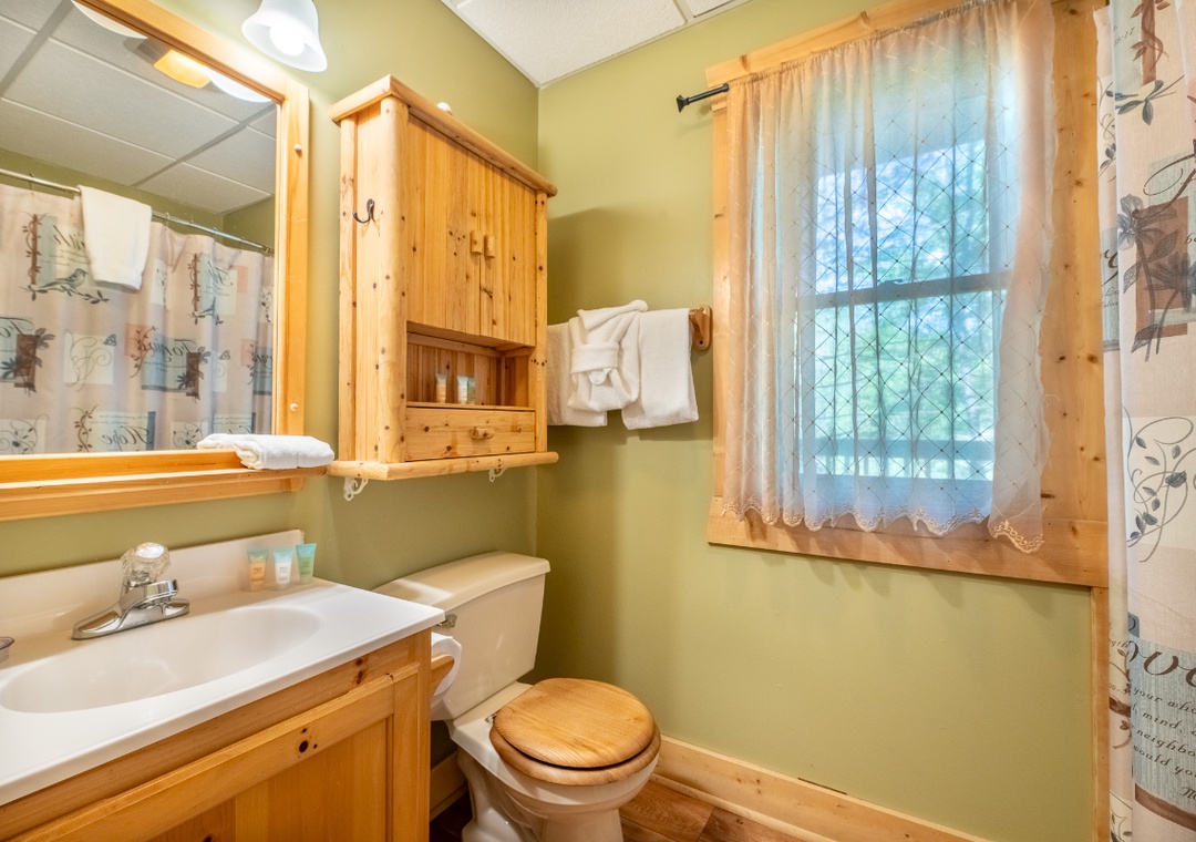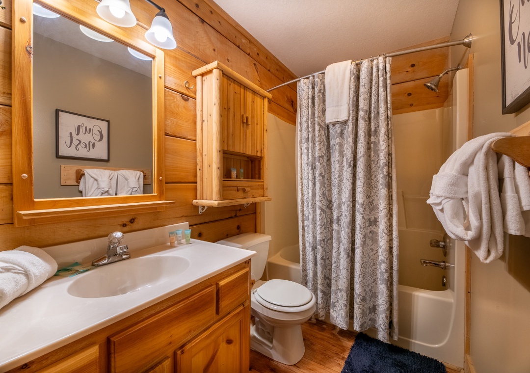 On the main level, the living room features a 55" ONN Roku TV with a DVD player, perfect for streaming your favorite shows or watching a classic movie by the cozy glow of the gas fireplace. The open-concept design makes it easy to relax, socialize, and stay connected with everyone in your group. Head downstairs to find a second, equally inviting entertainment zone. This level offers a comfy seating area with an electric fireplace and a 50" Philips Roku TV with a DVD player, ideal for movie marathons or just kicking back after a long day of exploring. Also find a multicade arcade machine offering hours of fun with classic games. When you’re ready to take the fun outdoors, the main level back deck offers a relaxing hot tub where you can soak your cares away while enjoying views of the resort surroundings. It’s the perfect place to unwind after a thrilling day in town. Fire up the propane grill for a backyard-style barbecue and dine al fresco while breathing in the fresh mountain air. In addition to the on-site amenities, you'll also have the option to enjoy the Honeysuckle Meadows Pool and Deli, located about 25 minutes (10 miles) away from the cabin. This off-site option offers a relaxed atmosphere with additional swimming space and a convenient deli for snacks or lunch. Simply walk up, give them the name of your cabin—Anglers Bend—and you’re welcome to enjoy the pool and facilities there during the open season. While the cabin itself feels like a private mountain hideaway, you’re only minutes from the action-packed downtown area. Explore world-famous attractions like Dollywood, The Island in Pigeon Forge, the Titanic Museum, and MORE!