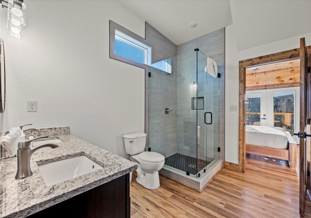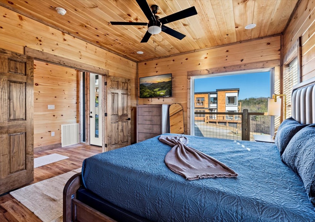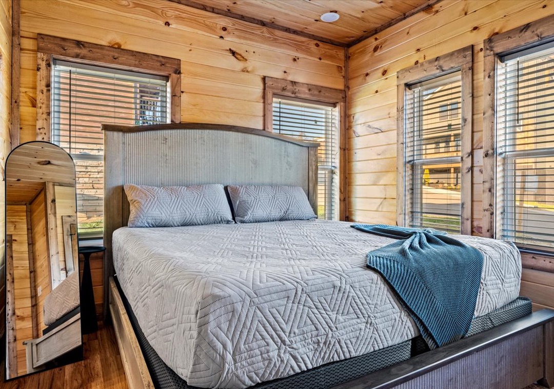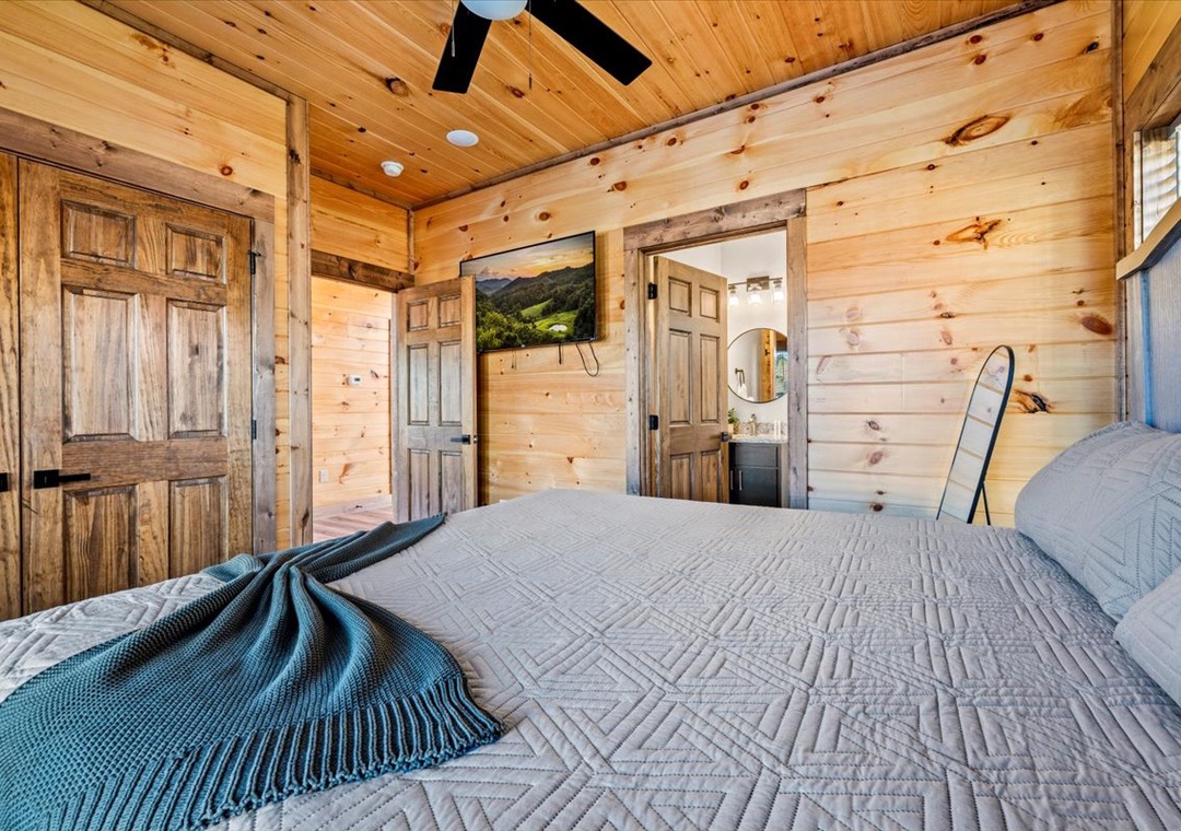 ✔ Bedroom 2 (Main Level): Comfortable Bedroom with a King-Bed and a flatscreen TV; Attached Full Bathroom with Stand Up Shower