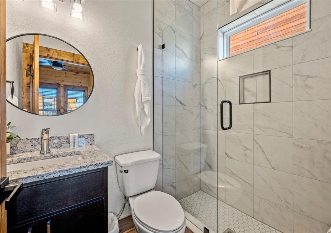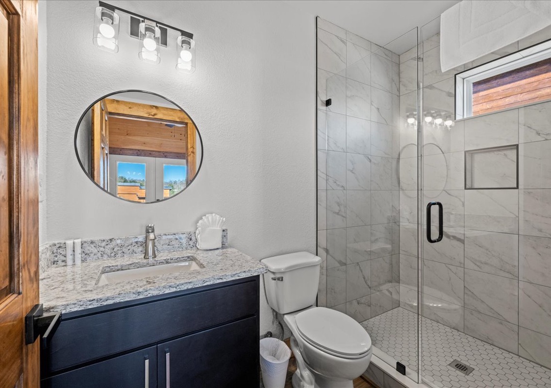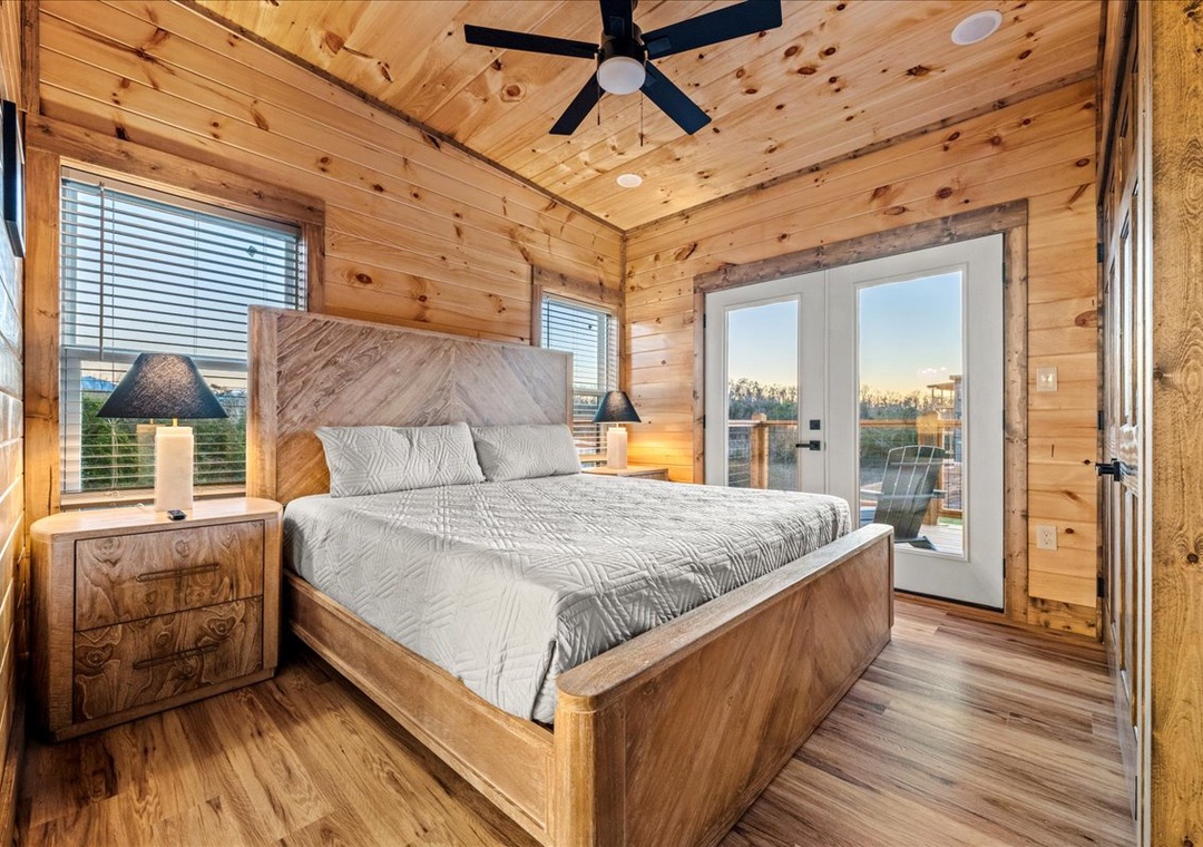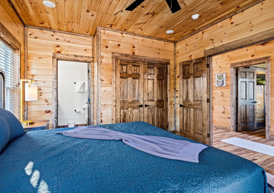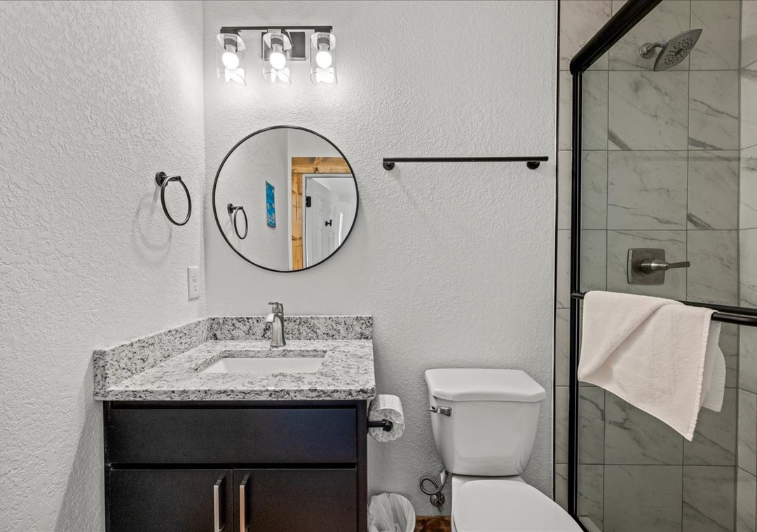 ✔ Bedroom 2 (Main Level): Comfortable Bedroom with a King-Bed and a flatscreen TV; Attached Full Bathroom with Stand Up Shower