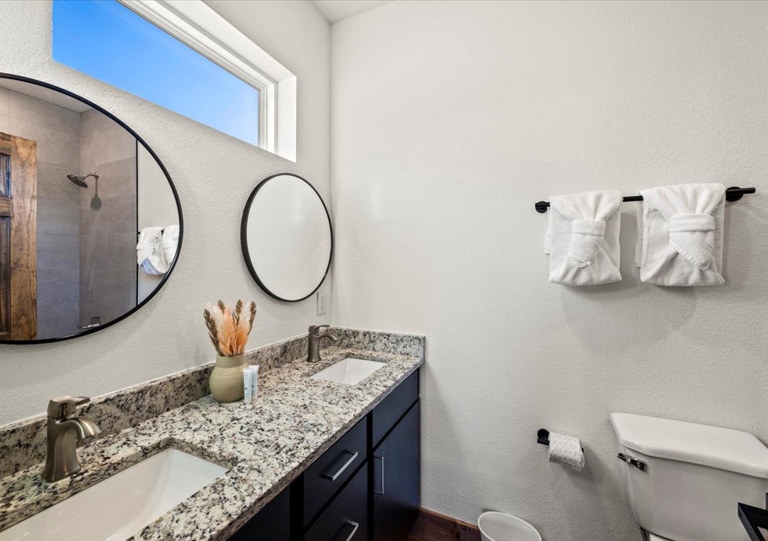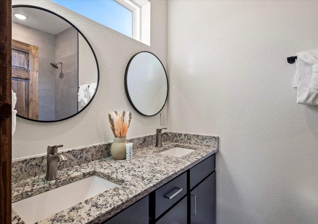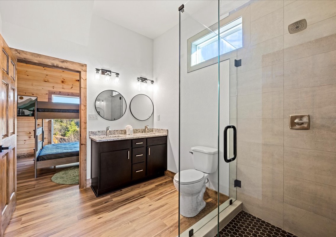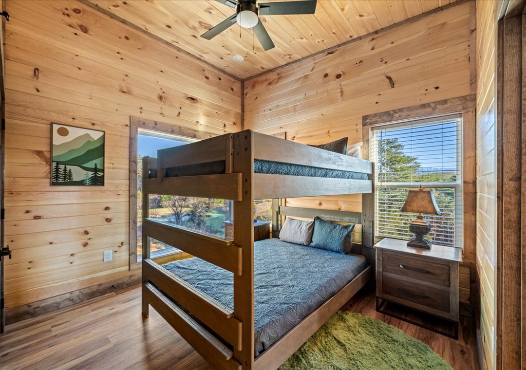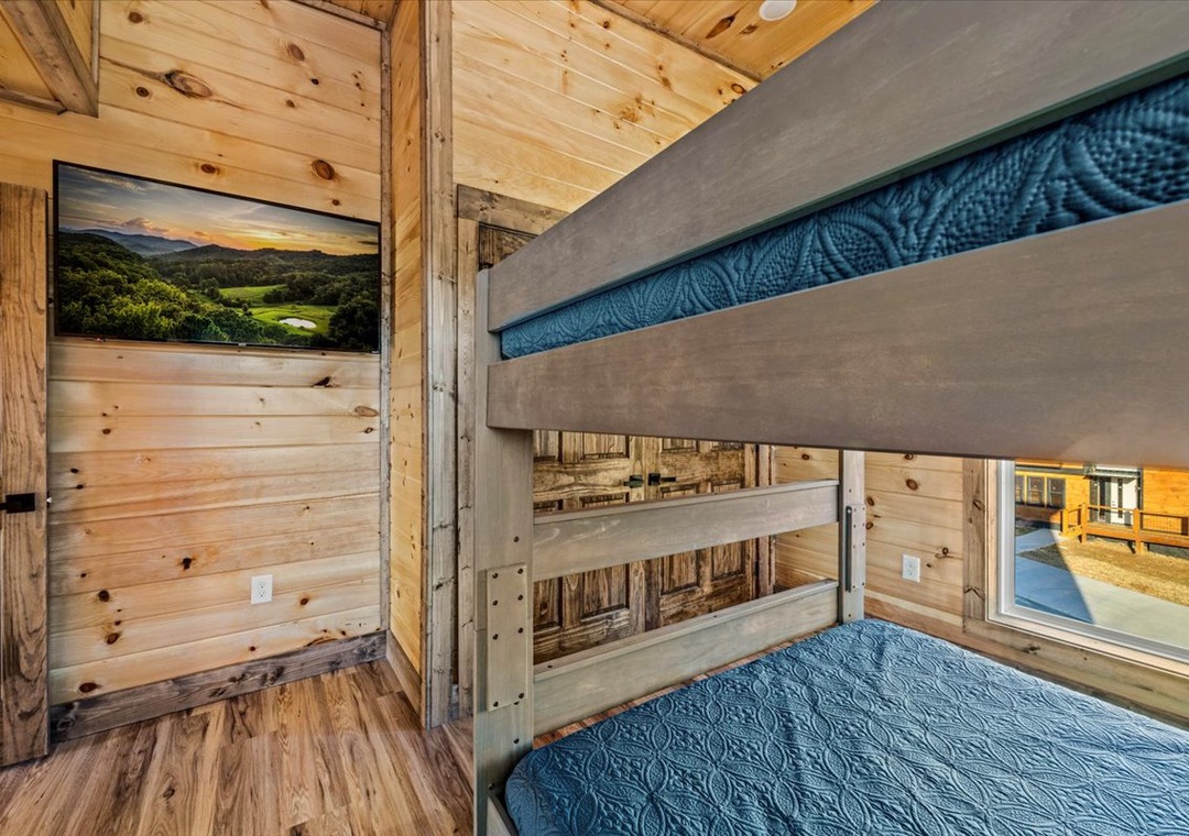 ✔ Bedroom 5 (Upper Level): Inviting Bedroom with a Queen-over-Queen Bunk Bed and a flatscreen TV; Access to a Full Bathroom with Stand Up Shower