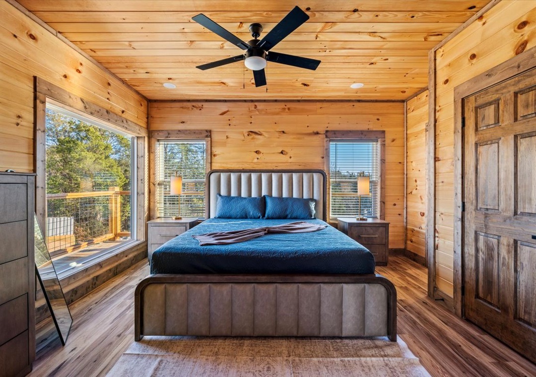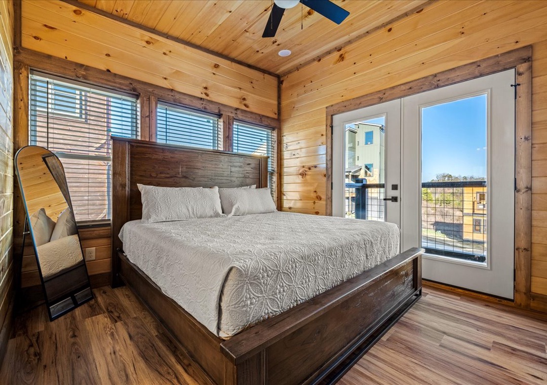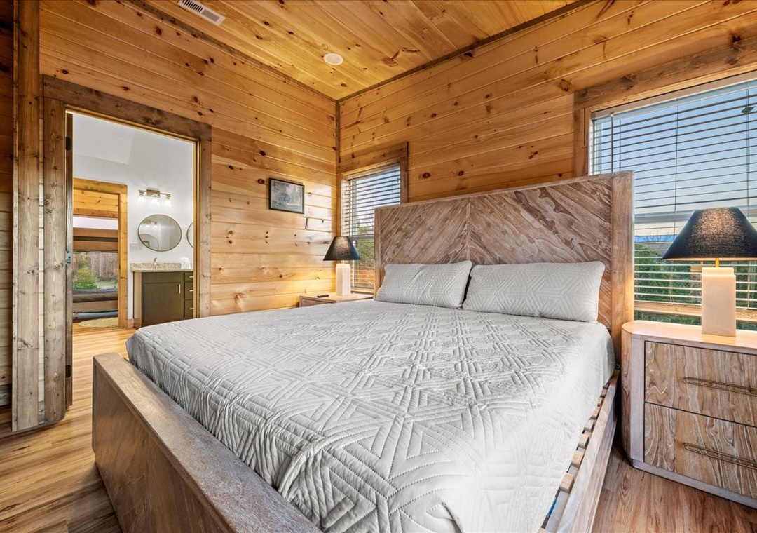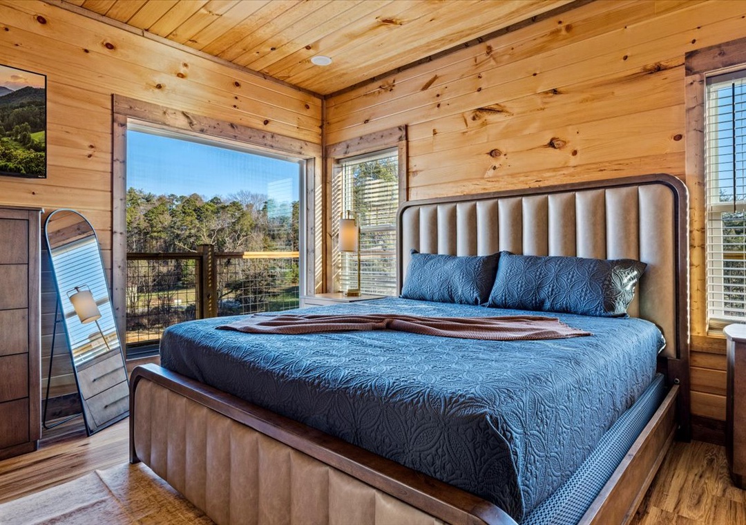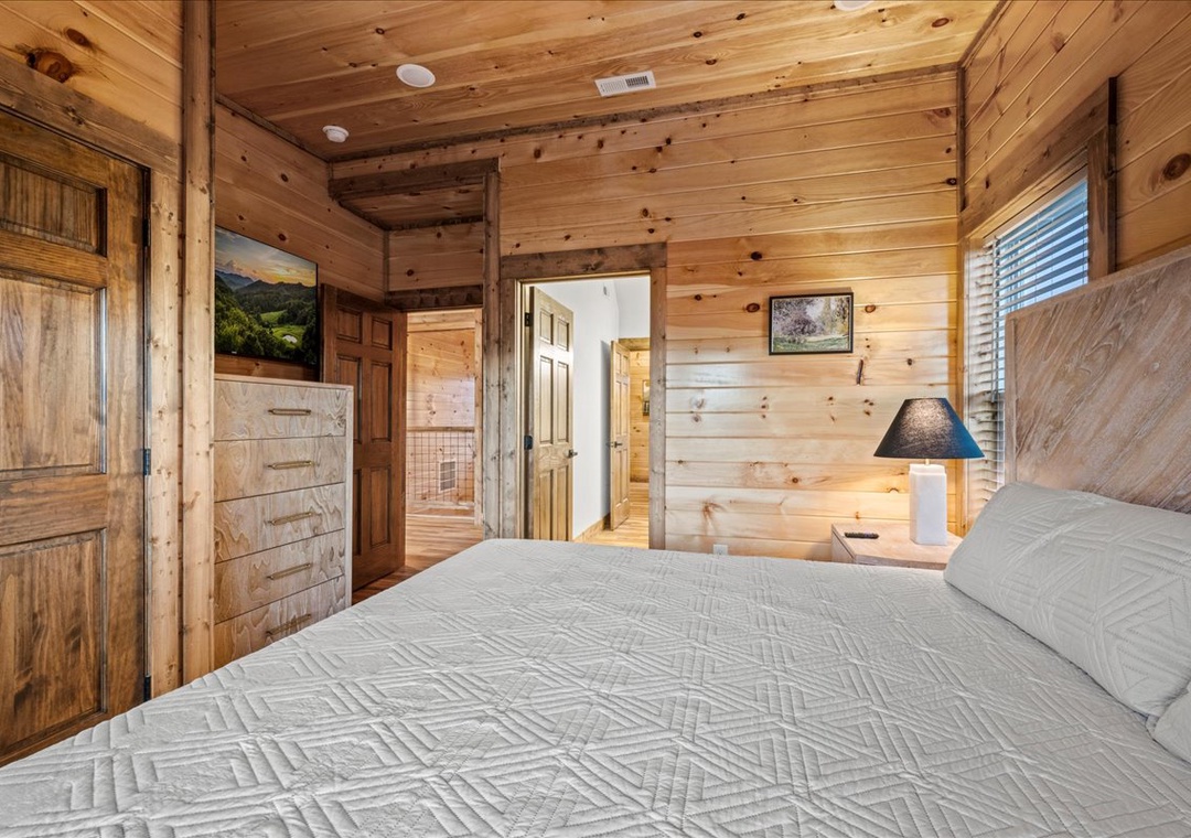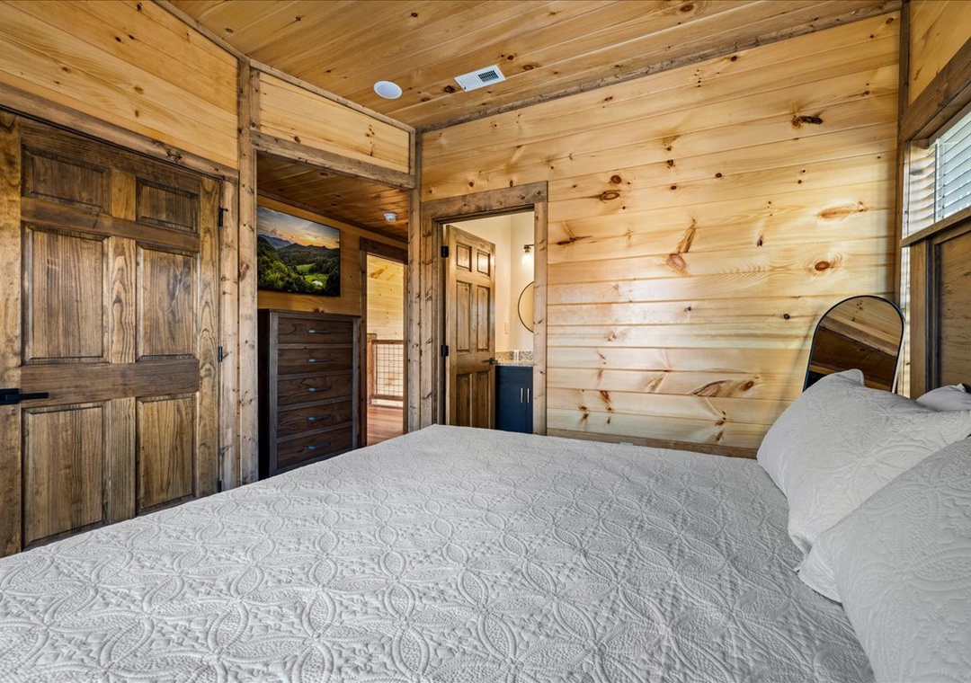 ✔ Bedroom 3 (Upper Level): Cozy Bedroom with a King-Bed and a flatscreen TV; Attached Full Bathroom with Stand Up Shower