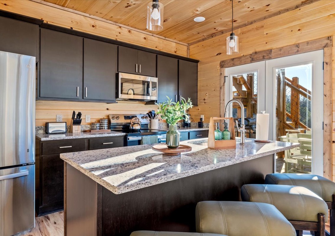 The main living area is the heart of Annamalai, offering a warm and stylish space to settle in. A huge Roku TV and a propane fireplace provide a cozy focal point, filling the room with soft ambiance that’s perfect for cool mountain evenings. Just steps away, the kitchen and dining area offer plenty of space for cooking, connecting, and enjoying meals together. The private heated indoor pool downstairs is a standout feature, offering a rare level of luxury and convenience. Just steps away, the theater and the game room continue the fun. A pool table, an arcade game, and another Roku TV make the lower level an ideal space for friendly competition, late-night entertainment, or relaxed afternoons spent indoors. Free WiFi is also available throughout the property.