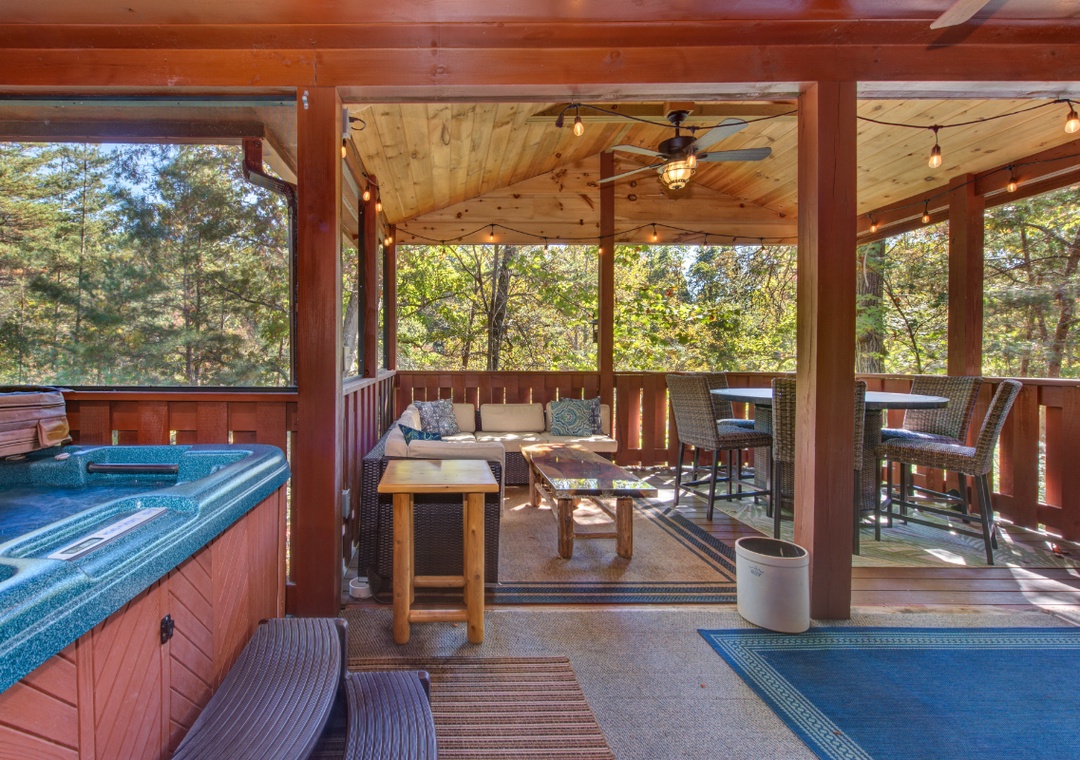 Inside, the cabin welcomes you with an inviting open-concept living space centered around a cozy propane fireplace and a smart TV with a DVD player. It’s the perfect spot to curl up with a movie or stream your favorite shows. If you enjoy a little friendly competition, head downstairs to the entertainment area where a foosball table awaits. Step outside, and Appalachian Joy offers even more opportunities for relaxation and entertainment in the great outdoors. The screened-in porch is a guest favorite, featuring a private hot tub and a propane fire pit that create the perfect combination of comfort and ambiance. Slip into the bubbling hot tub and let your worries melt away as you take in the peaceful sounds of the forest. When the evening chill sets in, gather around the fire pit with your favorite drink in hand and enjoy the warmth and flicker of the flames. If you prefer to cook outdoors, there’s a park-style grill in front of the cabin, ready for a classic Smoky Mountain cookout. As night falls, move over to the wood-burning fire pit on the right side of the property for a true mountain experience. There’s nothing quite like gathering around a crackling fire under the stars, roasting marshmallows, telling stories, and watching the firelight dance in the cool night air.