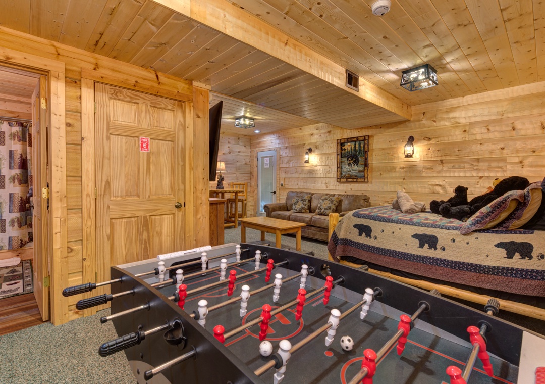 The heart of the cabin is the spacious open-concept living area, featuring a propane fireplace and plush sofa, and a Samsung Smart TV with Roku Box and BlueRay DVD Player, inviting you to sink in and unwind while the fire flickers warmly in the corner. The kitchen and dining area, open to the living room, provides everything you need to cook and dine at home. Also, find the first bedroom on the main level, which serves as a comfortable sanctuary designed for rest and rejuvenation. Upstairs, the loft serves as an additional bedroom that’s both relaxing and charming. The downstairs bedroom offers a foosball table and a queen bed designed for relaxation and fun. Free Starlink is also available throughout the property.