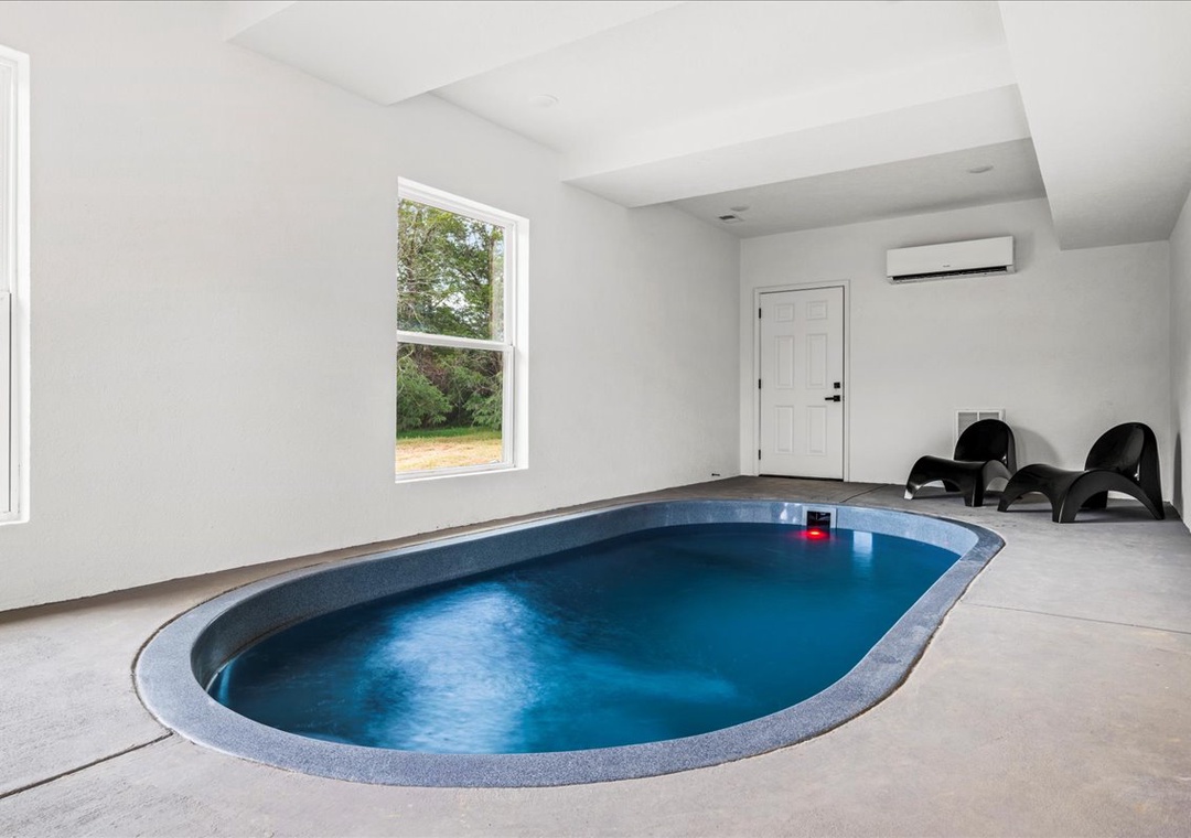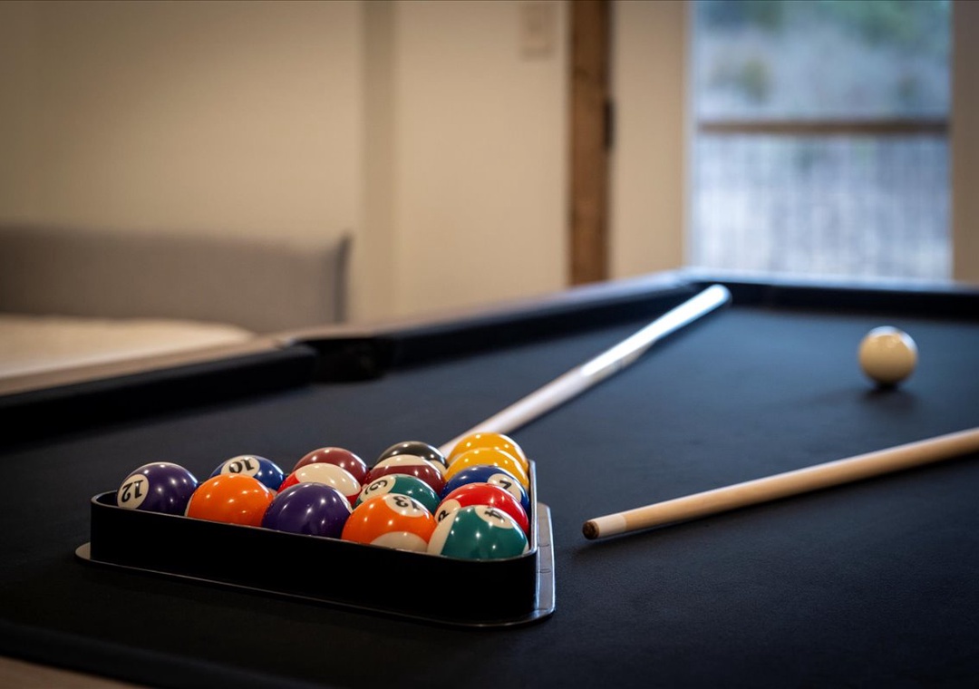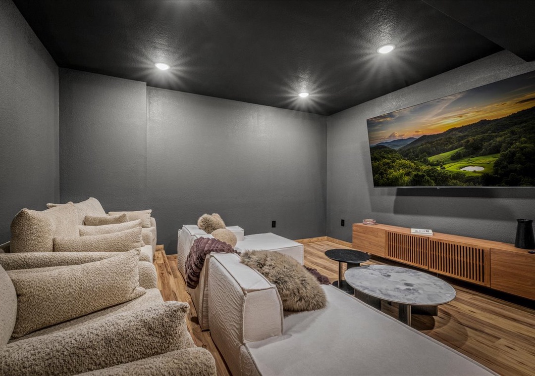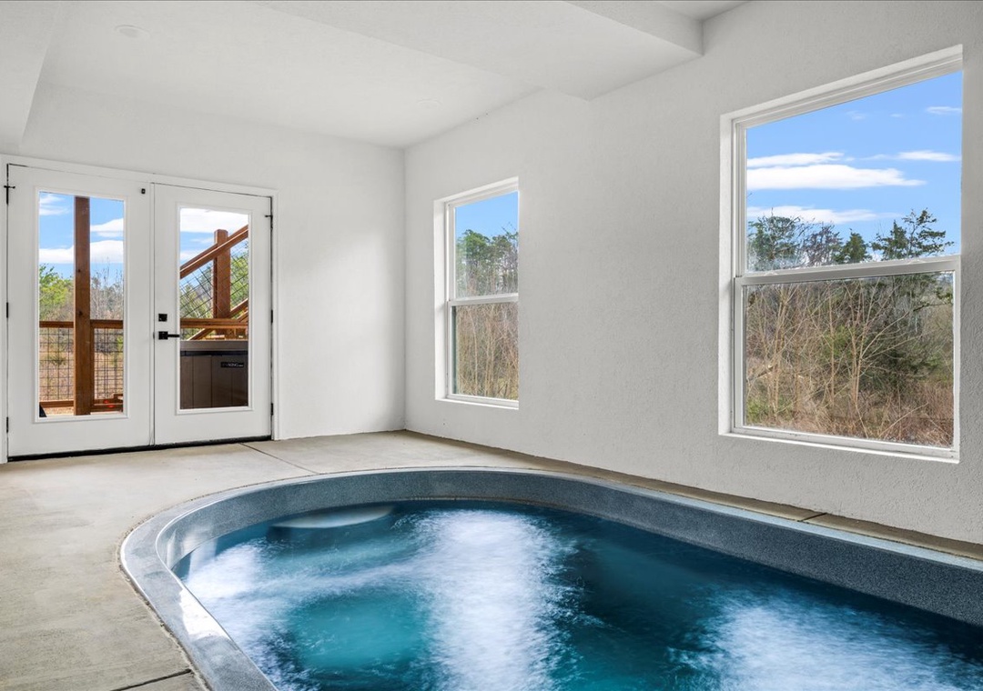 The main living area sets the tone with a welcoming propane fireplace and a large flatscreen TV, making it an ideal space for watching movies, streaming shows, or gathering everyone together for game nights. But the lower level is where “Arunachala” truly shines as an entertainment destination. A dedicated state-of-the-art theater room delivers a cinematic experience right inside the lodge, featuring an impressive 85-inch Fire TV and plush seating that invites you to settle in for movie marathons or family film nights. Just steps away, the pool table adds another layer of fun, giving guests a lively space for friendly competition and late-night laughs. The lower-level porch also offers a bubbling hot tub that’s perfect for unwinding while still staying connected with the group. Nearby, a propane firepit creates an inviting atmosphere for storytelling, conversation, and cozy evenings under the mountain sky. The highlight of the lodge’s entertainment is the private heated indoor pool, allowing everyone year-round swimming and play regardless of the weather.