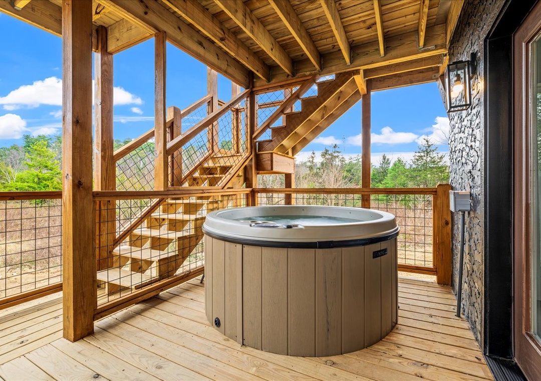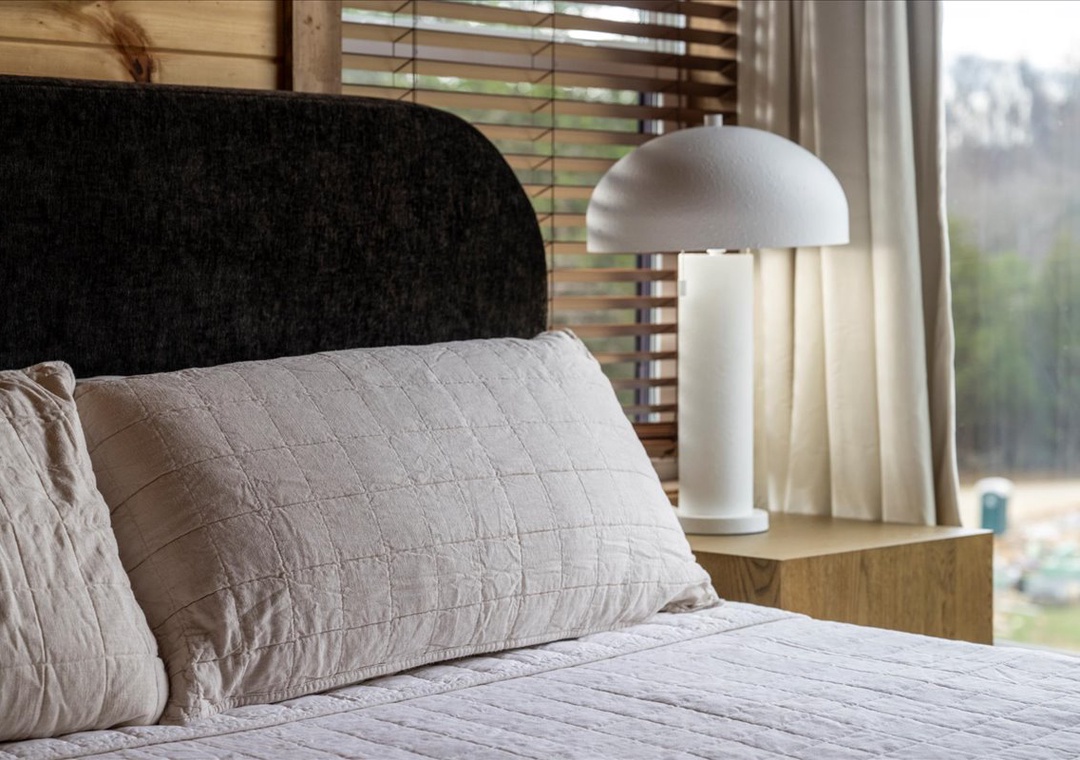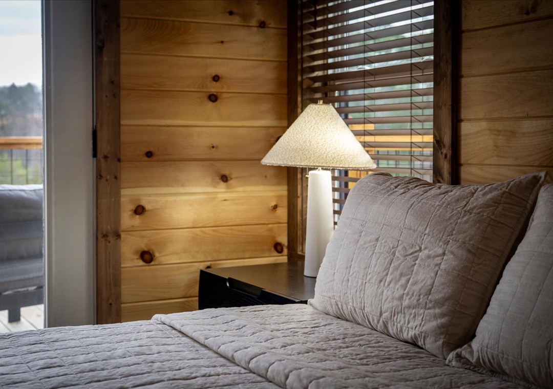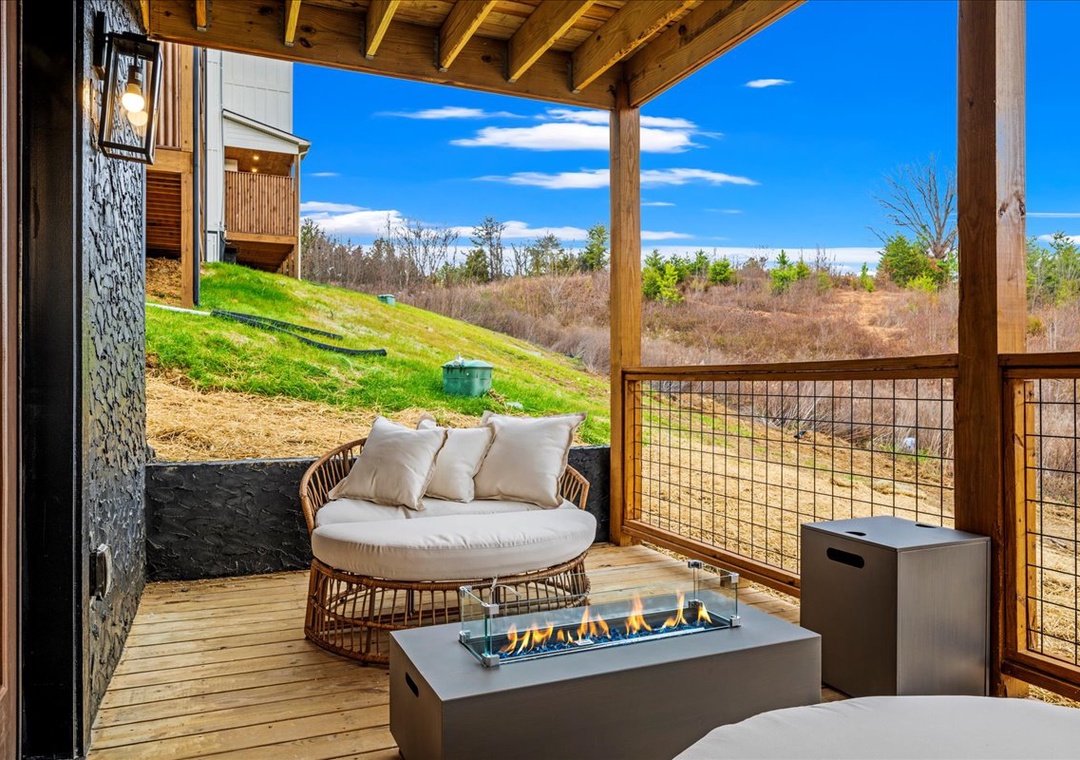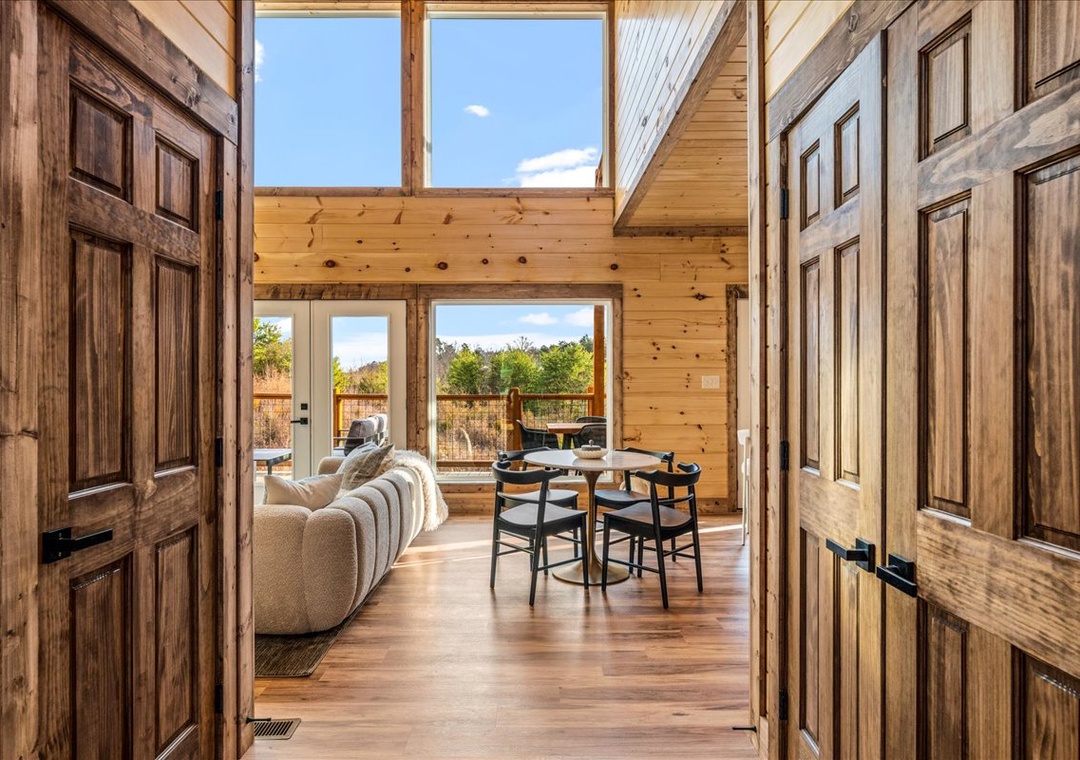 The main living area sets the tone with a welcoming propane fireplace and a large flatscreen TV, making it an ideal space for watching movies, streaming shows, or gathering everyone together for game nights. But the lower level is where “Arunachala” truly shines as an entertainment destination. A dedicated state-of-the-art theater room delivers a cinematic experience right inside the lodge, featuring an impressive 85-inch Fire TV and plush seating that invites you to settle in for movie marathons or family film nights. Just steps away, the pool table adds another layer of fun, giving guests a lively space for friendly competition and late-night laughs. The lower-level porch also offers a bubbling hot tub that’s perfect for unwinding while still staying connected with the group. Nearby, a propane firepit creates an inviting atmosphere for storytelling, conversation, and cozy evenings under the mountain sky. The highlight of the lodge’s entertainment is the private heated indoor pool, allowing everyone year-round swimming and play regardless of the weather.
