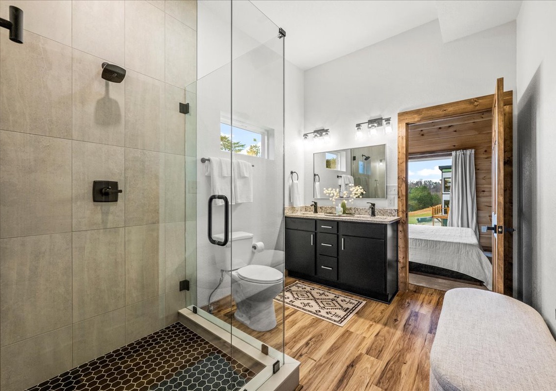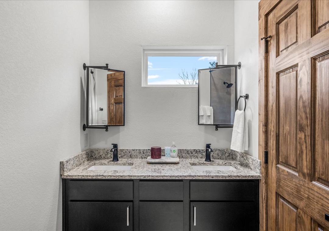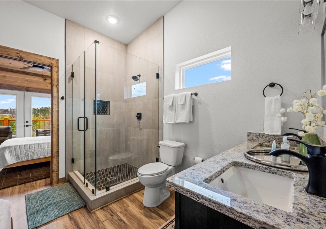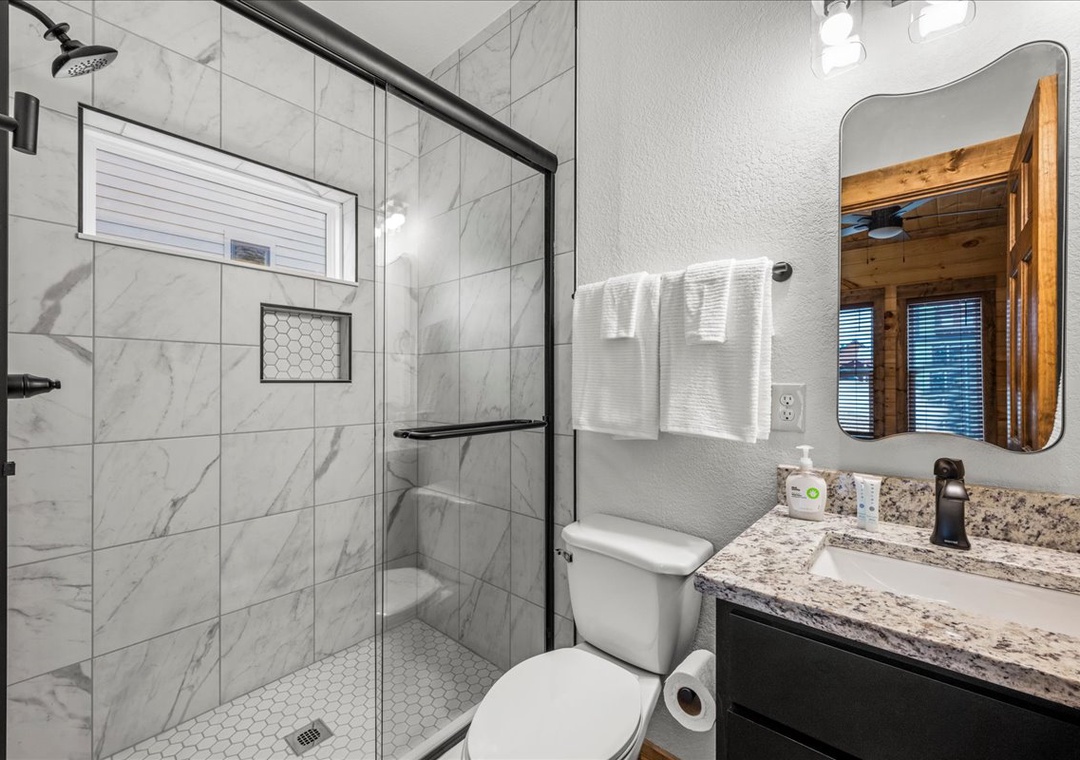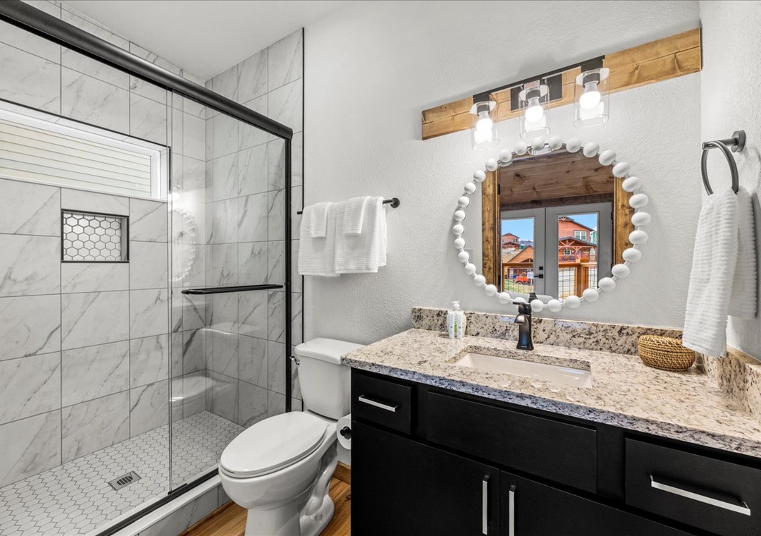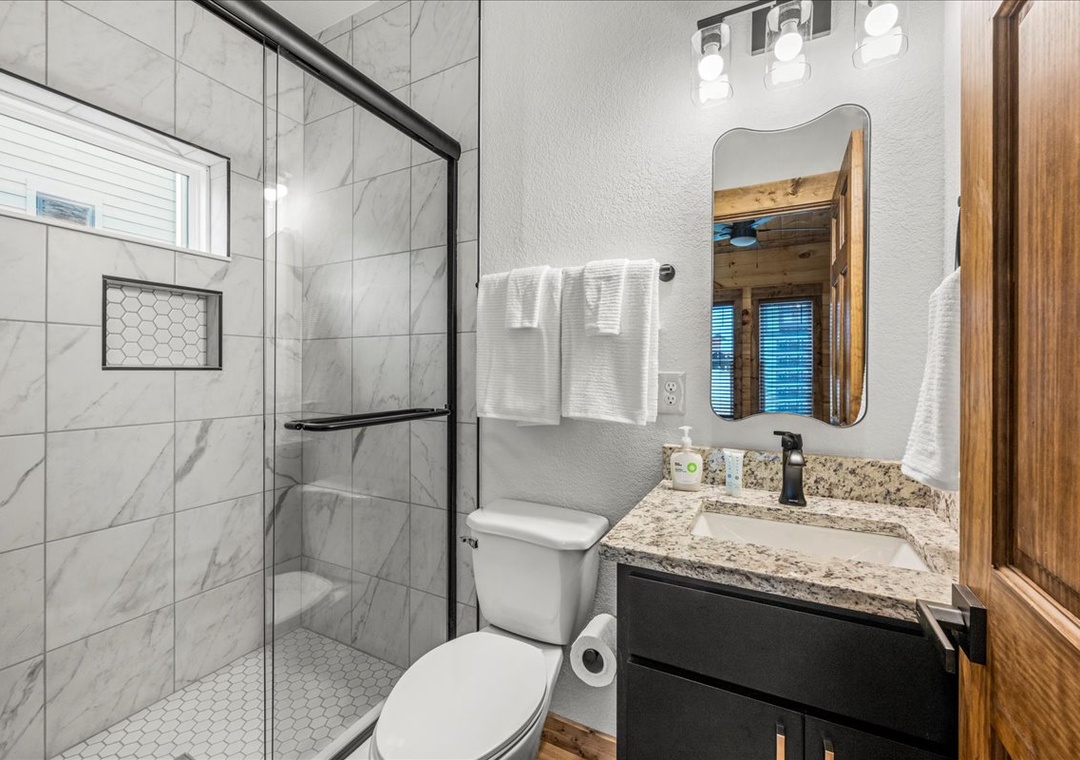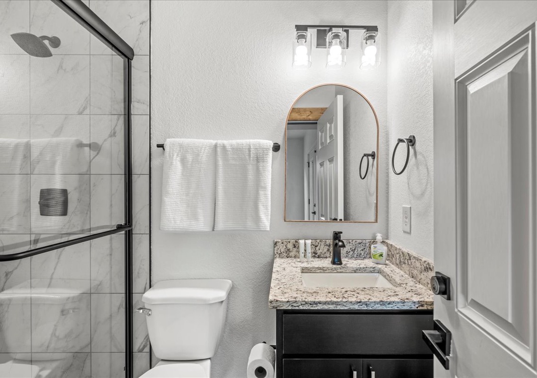 ✔ Bedroom 2 (Main Level): Comfortable Bedroom with a Full-size Bed; Attached Full Bathroom with Stand Up Shower