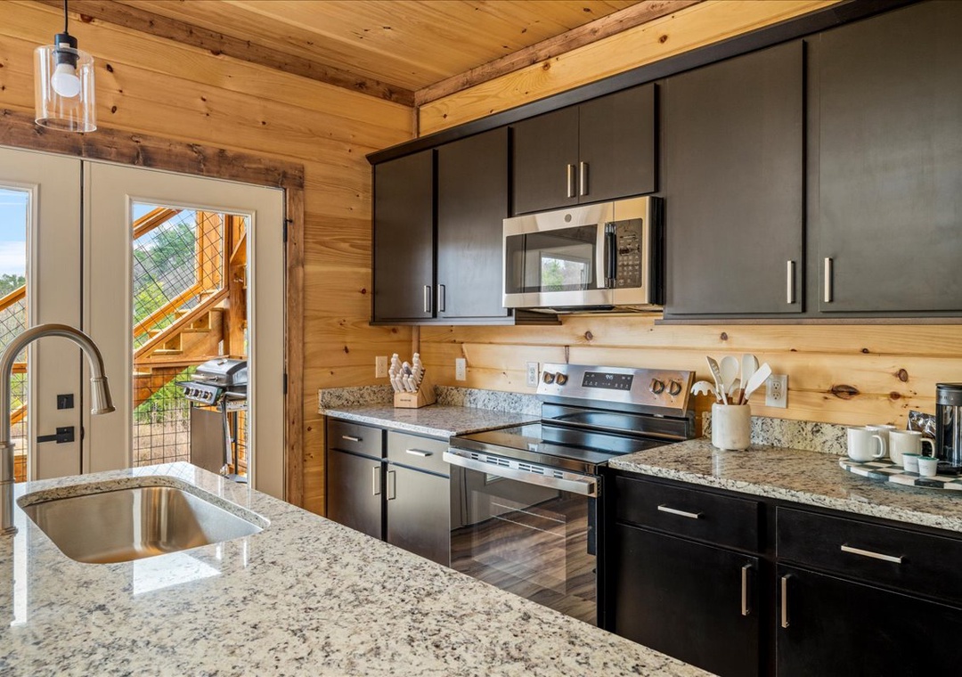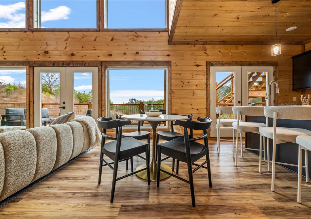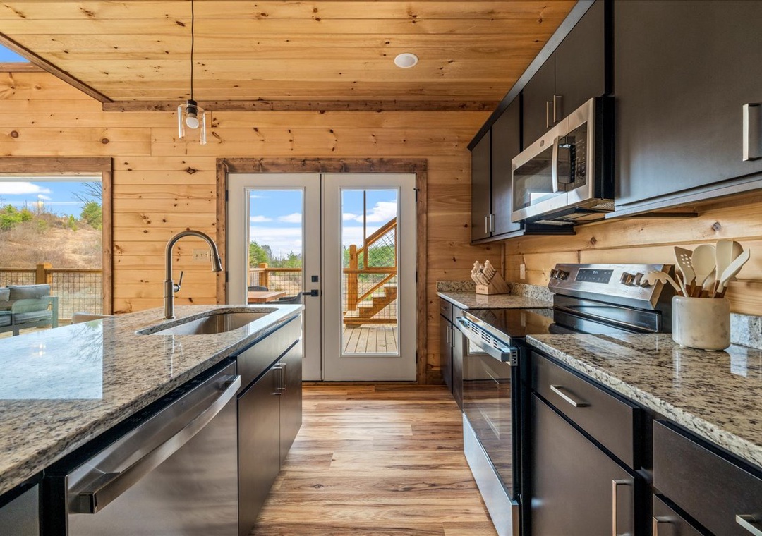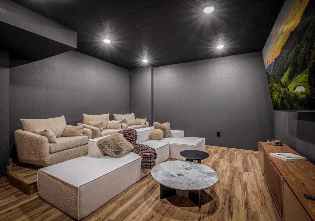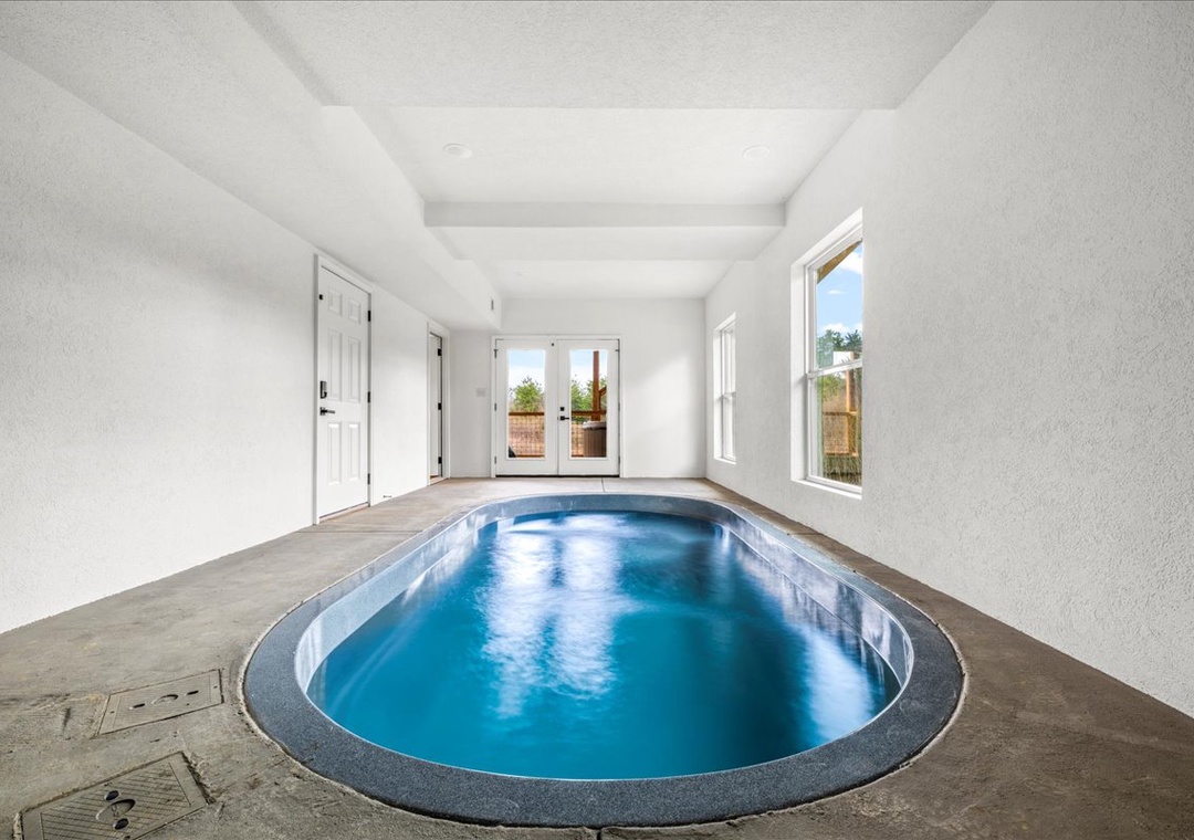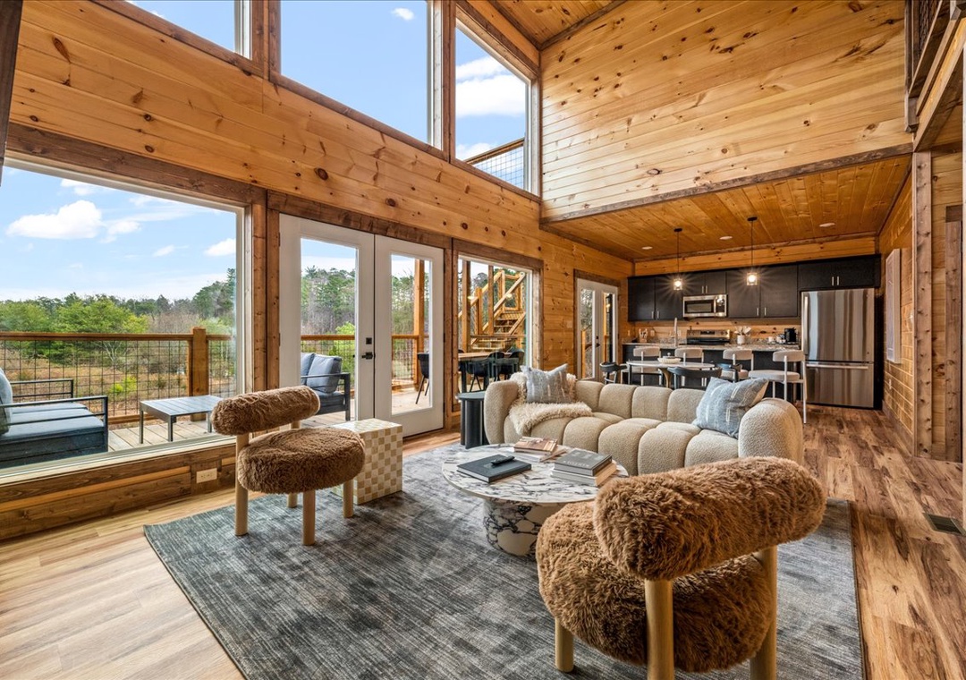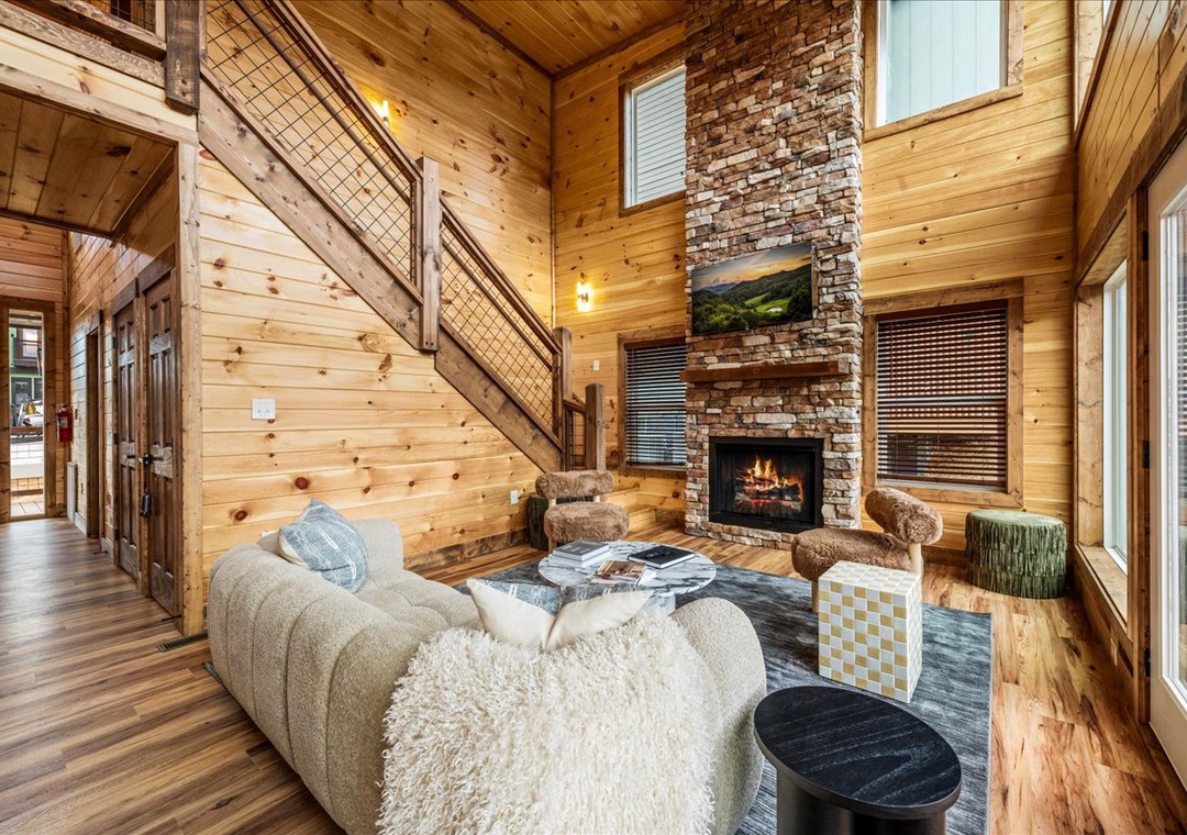 The main living boasts soaring ceilings and oversized windows, creating a bright, open atmosphere while still keeping you cozy indoors. The living room is anchored by a large flatscreen TV and a propane fireplace that adds warmth and ambiance throughout the space. Just a few steps away, you’ll find the fully-equipped kitchen featuring appliances and countertops that make meal preparation a breeze. Downstairs, a dedicated theater room offers a true cinematic experience. Nearby, the pool table adds another layer of indoor enjoyment, while the indoor pool offers the rare luxury of swimming in complete comfort and privacy regardless of the weather.