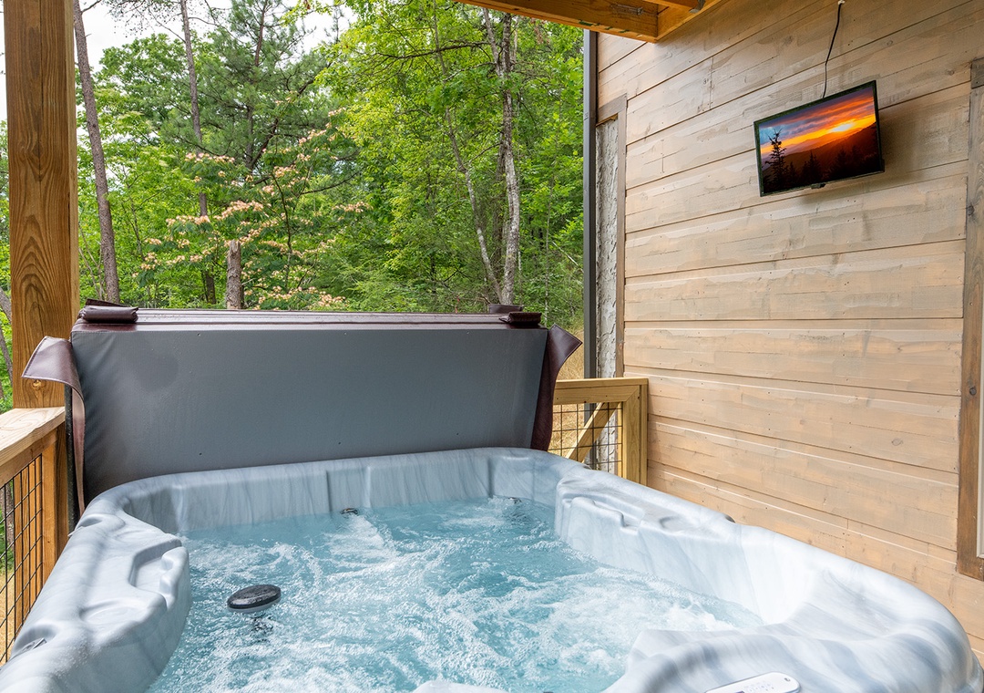 "Away From It All" offers an array of entertainment options that promise to make your stay as thrilling as it is relaxing. Start off at the living room, where a sleek electric fireplace creates a warm and cozy ambiance. The plush seating area is perfect for gathering with friends and family to enjoy casual conversations, play board games, or watch your favorite shows on the large flat-screen TV. Downstairs you’ll find a private theater room, designed to deliver an unparalleled viewing experience. With a HUGE 86" LG Smart TV as the centerpiece, you'll feel as if you've brought the cinema right into your cabin. Sink into the sumptuous theater seating and immerse yourself in the latest blockbuster movies or binge-watch your favorite TV series. A Pac-Man arcade also awaits, ready to transport you back in time. Challenge your friends and family to high-score battles, relive childhood memories, and enjoy endless hours of classic arcade fun. For those who love a blend of relaxation and recreation, the downstairs deck features a private hot tub that offers a perfect end to an adventurous day in the mountains. Soak in the warm, bubbling waters while taking in the relaxing surroundings.