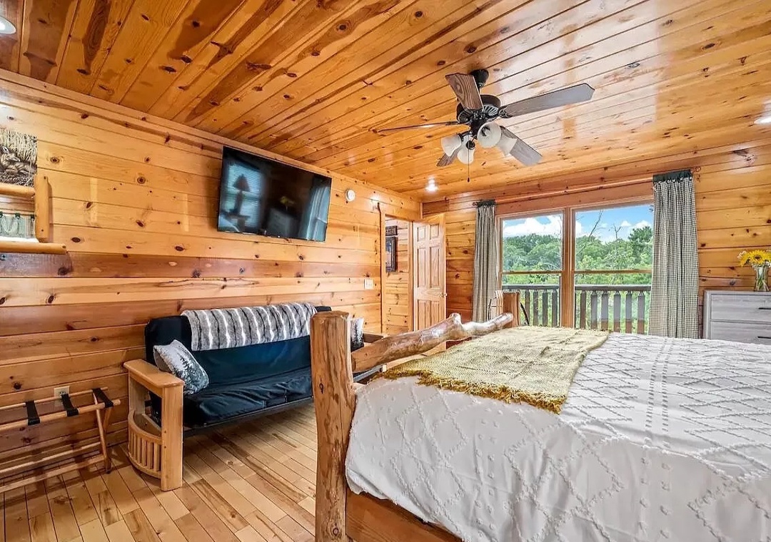 ✔ Deer Bed (Main Level): Cozy King Bedroom with a Futon and Flat screen TV; Attached Full Bathroom with Shower/Jacuzzi Combo