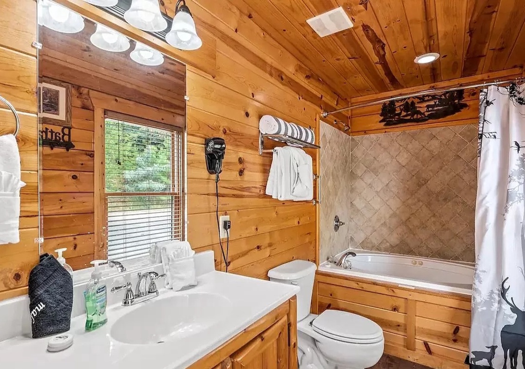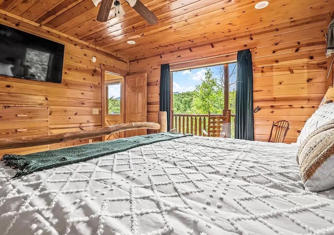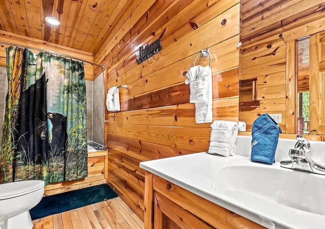 ✔ Bear Den (Lower Level): Cozy King Bedroom with a Flat screen TV; Attached Full Bathroom with Shower/Jacuzzi Combo