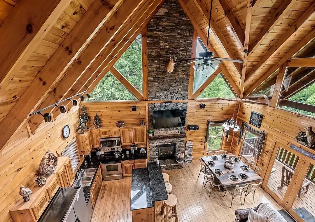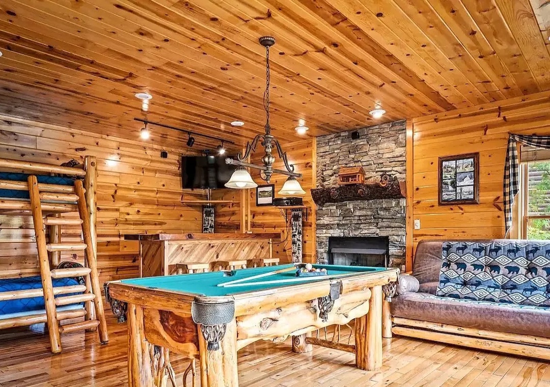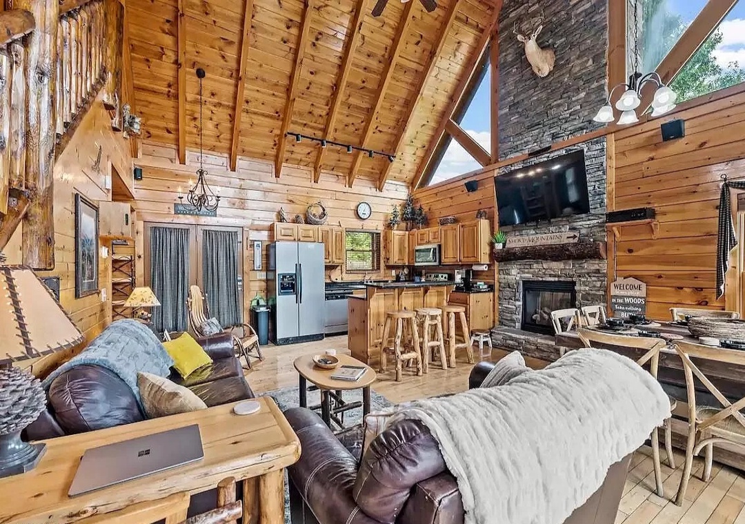 As you step inside, you're immediately welcomed by the expansive, open-concept living area. High, vaulted ceilings create a sense of grandeur, while large windows frame the breathtaking mountain views and flood the space with natural light. The living room is a cozy haven, featuring plush seating and a grand stone fireplace, perfect for gathering around on chilly evenings. The adjacent fully equipped kitchen is a chef’s delight, boasting modern stainless-steel appliances, ample counter space, and all the cookware and utensils you need to prepare delicious meals. For those looking for entertainment and fun, the cabin’s game room is filled with a variety of activities to keep everyone engaged. And when it’s time to rest, find each of the three beautifully decorated bedrooms designed to provide maximum comfort and tranquility. Free WiFi is also available throughout the property.