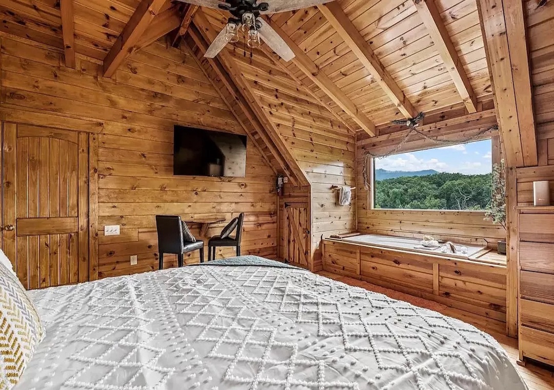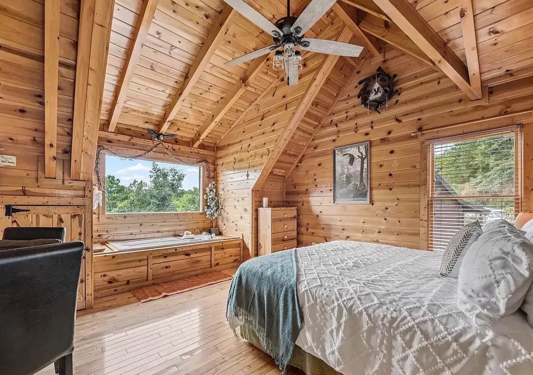 ✔ Eagle’s Nest (Upper Level): Cozy King Bedroom with a Flat screen TV; Attached Full Bathroom with Shower/Tub Combo and a Separate Jacuzzi