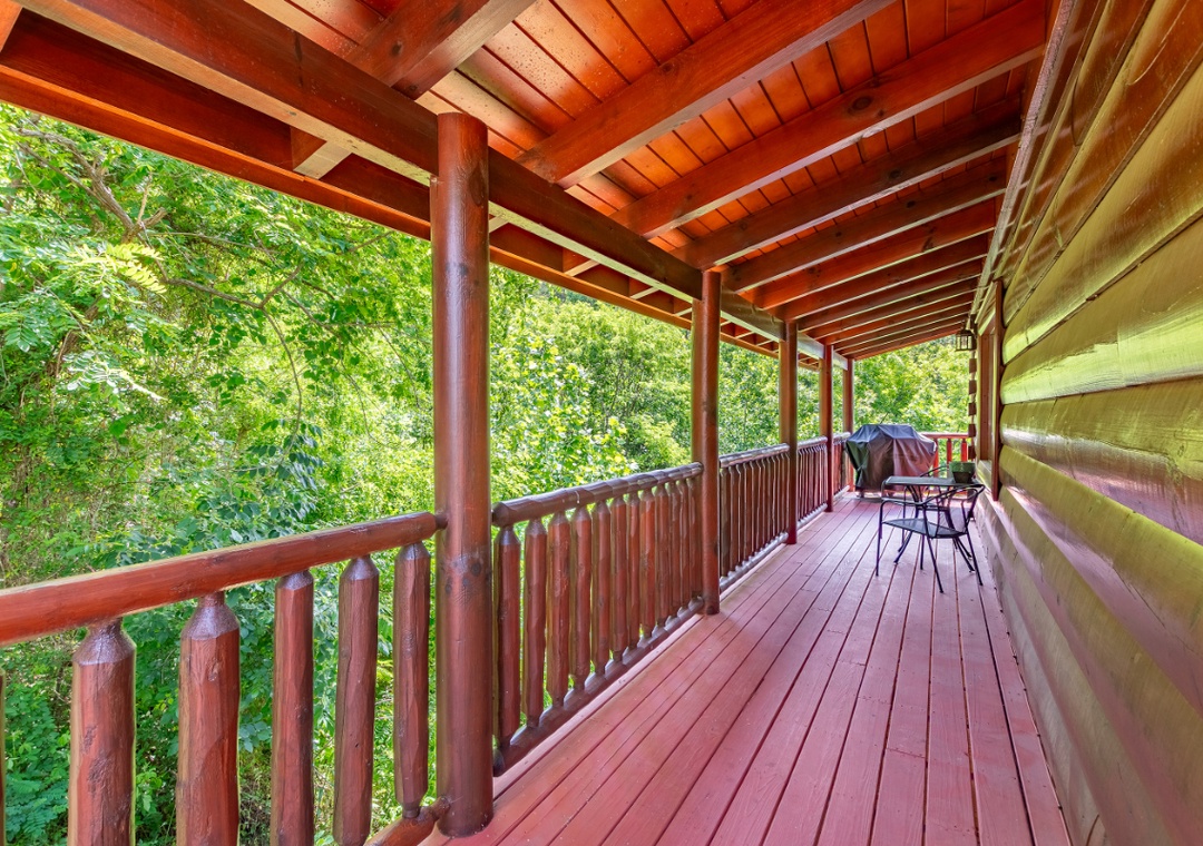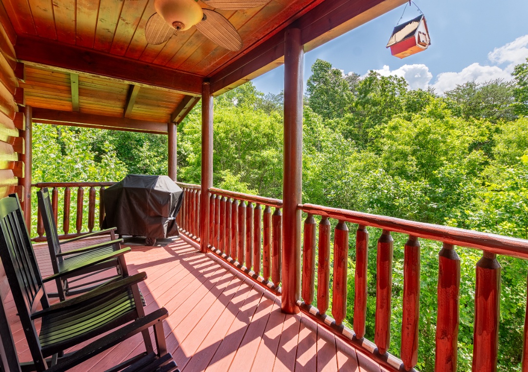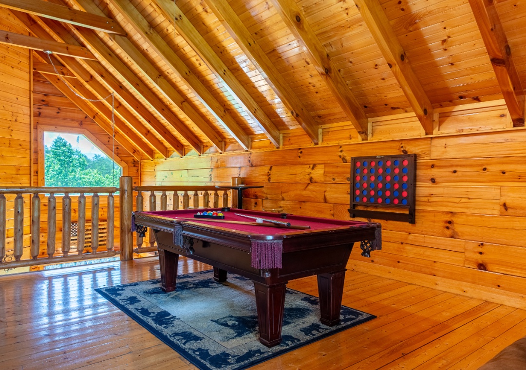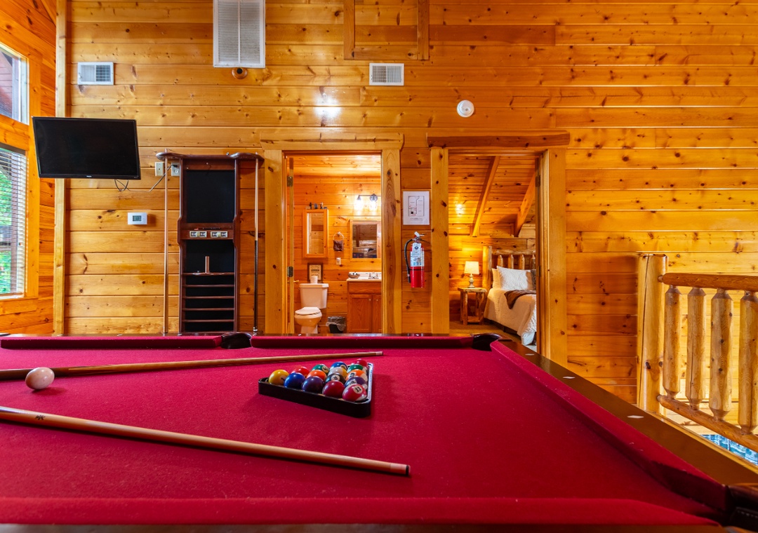 Bear Essentials Lodge is the ideal vacation destination for those who want to both relax and play! Enjoy family movie night in the spacious living room while cuddled up on the leather couches while the fireplace roars in the distance. Step upstairs into the loft game room and you are met with hours and hours of entertainment “ from the pool table to the arcade, no one will be bored! Or relax in one of the two separate jacuzzi tubs after a long day of hiking or shopping. And outside, you are greeted with a bubbling hot tub that overlooks the scenic views. Step out onto the covered balcony and sit back and relax while you sip your morning cup of coffee or evening glass of wine while taking in the fresh Smoky Mountain air. Or enjoy dinner on the patio after grilling up a yummy feast on the propane grill. During the warmer months, feel free to take a dip in the community pool!