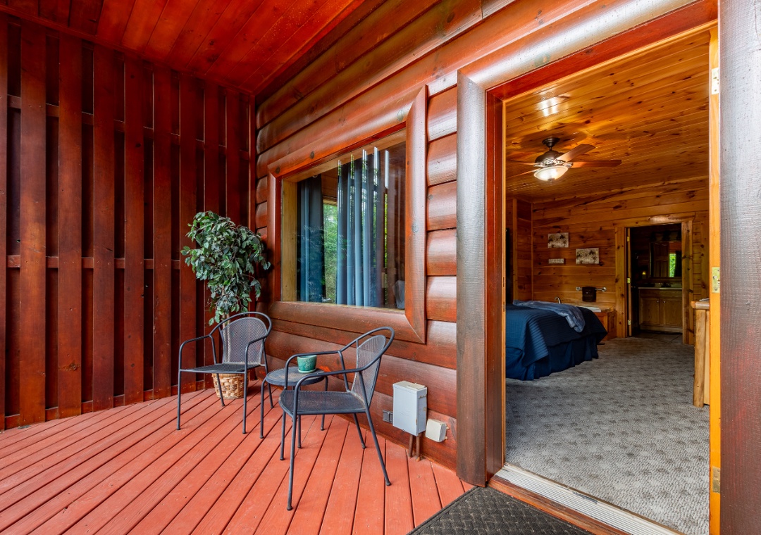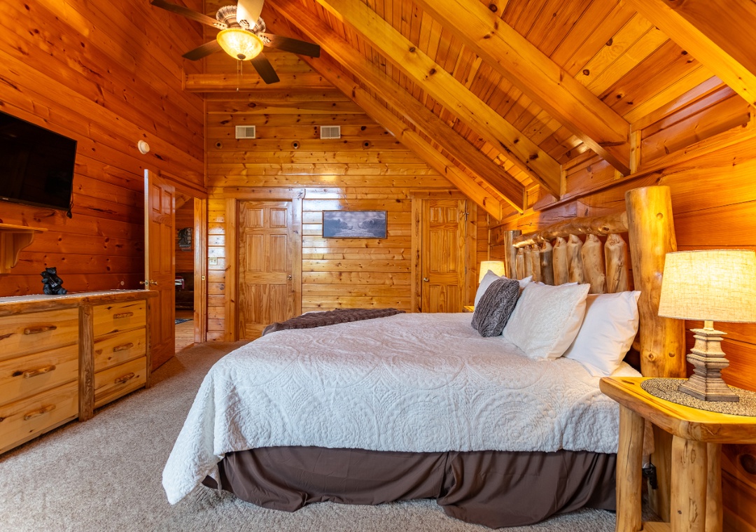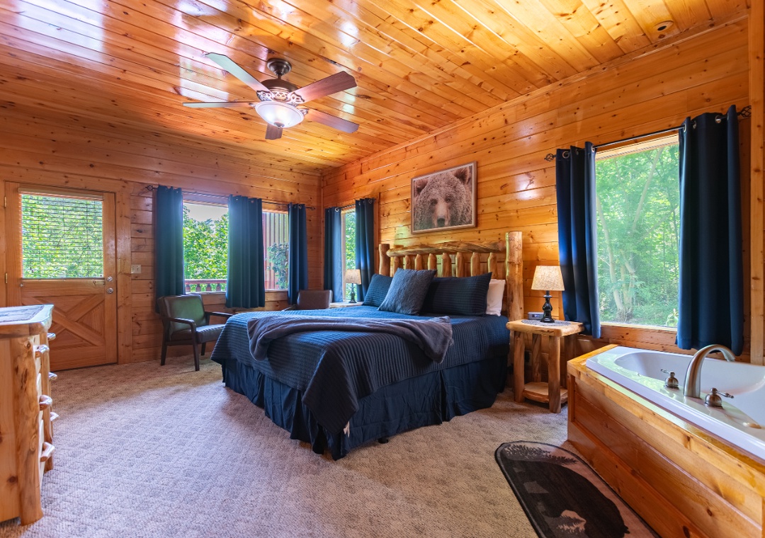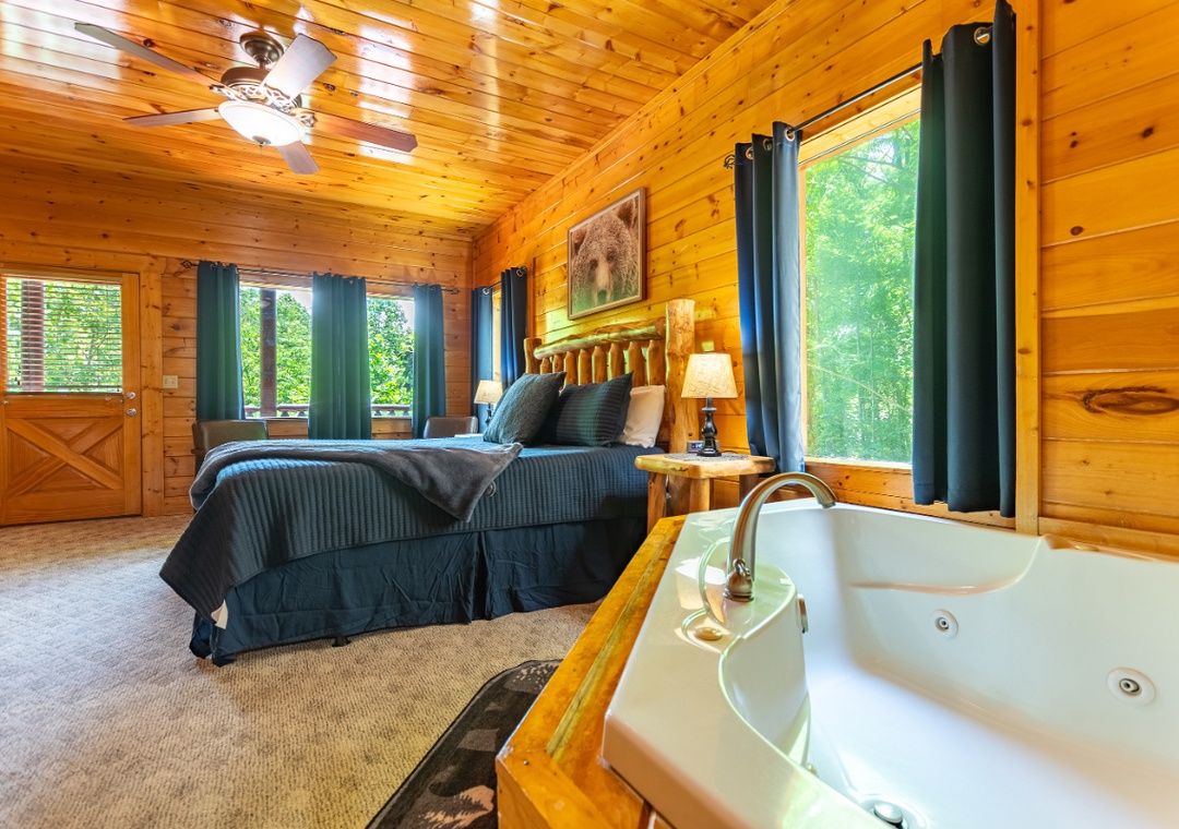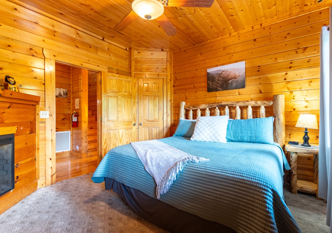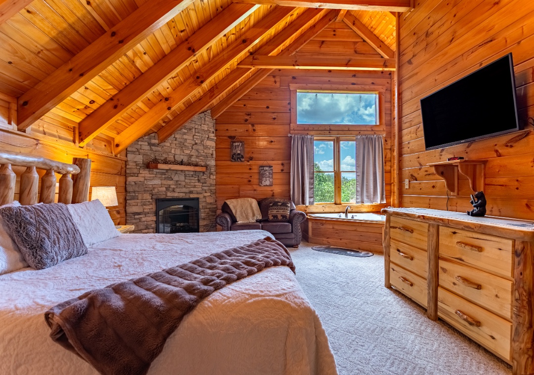 Bedroom #1 (upstairs): Spacious bedroom retreat with King-sized bed, private fireplace and your own soaking jacuzzi tub looking out over the mountains; Private attached bathroom with shower