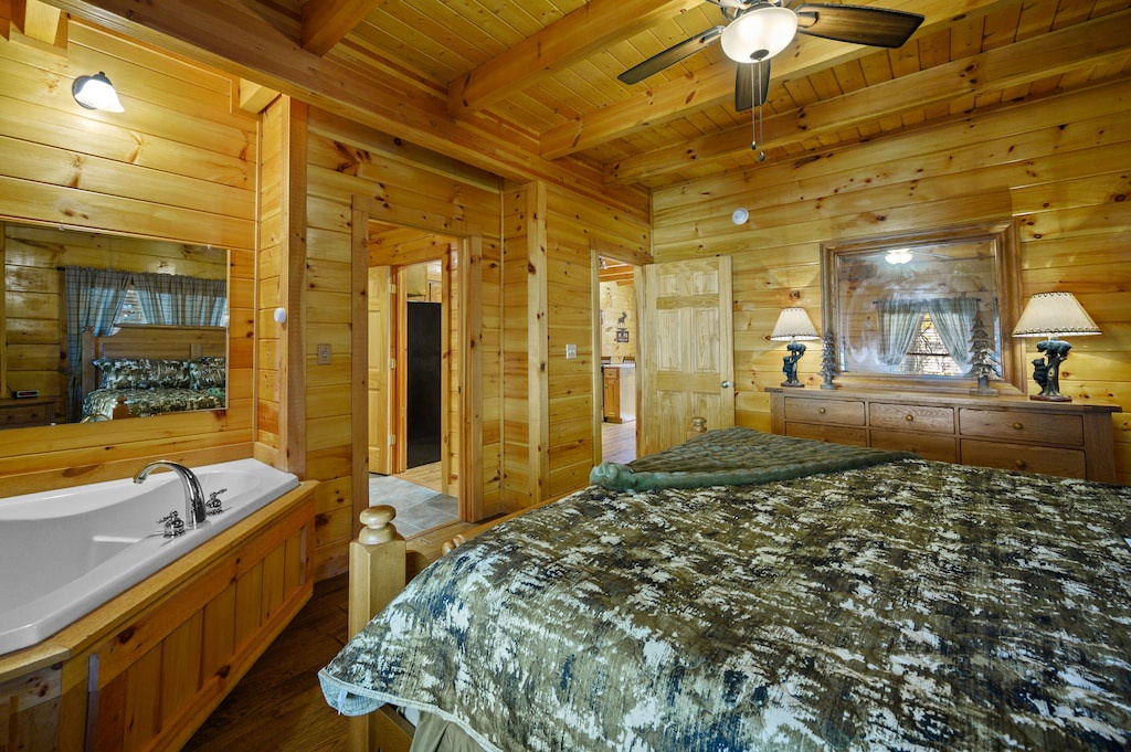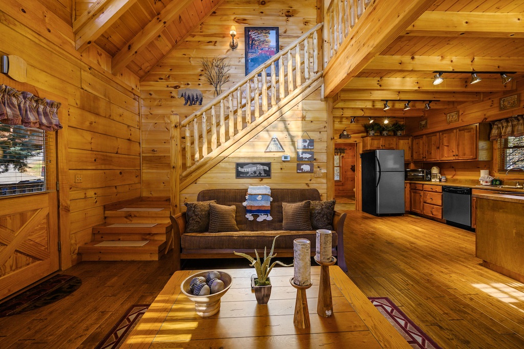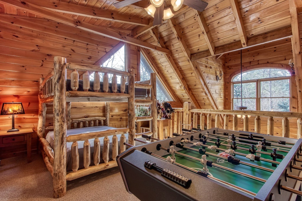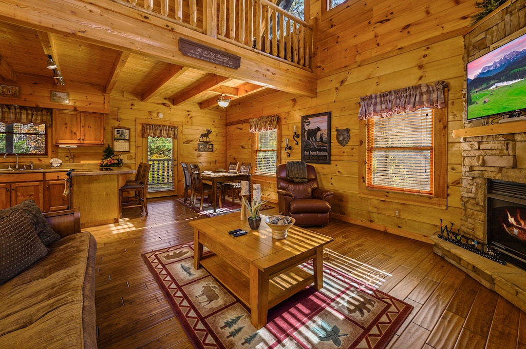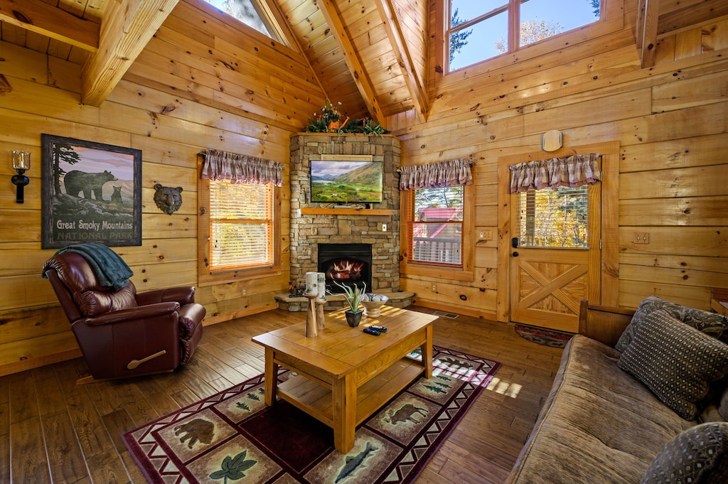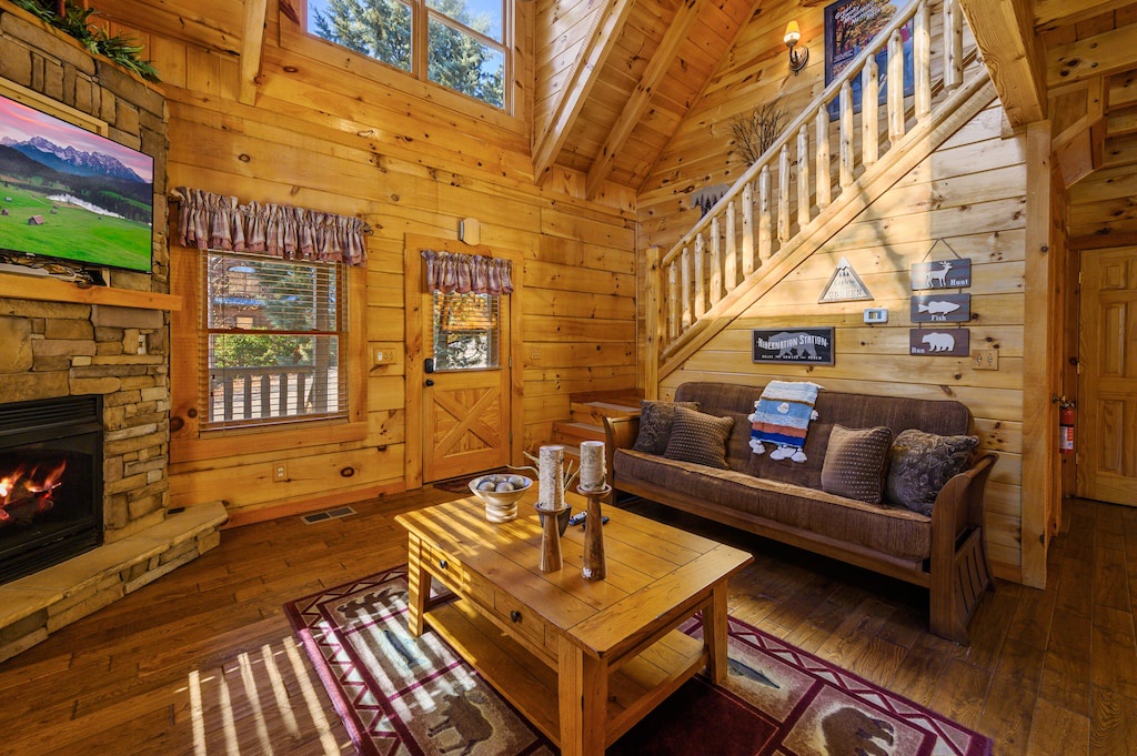 Fully furnished cabin, high ceilings and stone stacked fireplace, spacious second living area downstairs with comfortable couches and huge TV, loft game area with foosball ; arcade game, jacuzzi bath tub, free Wifi, spacious bedrooms and living spaces