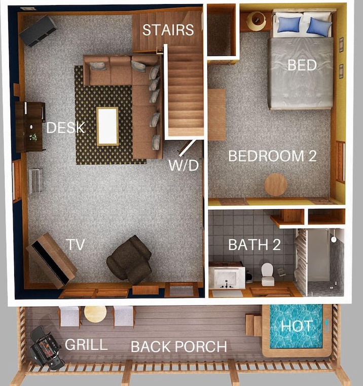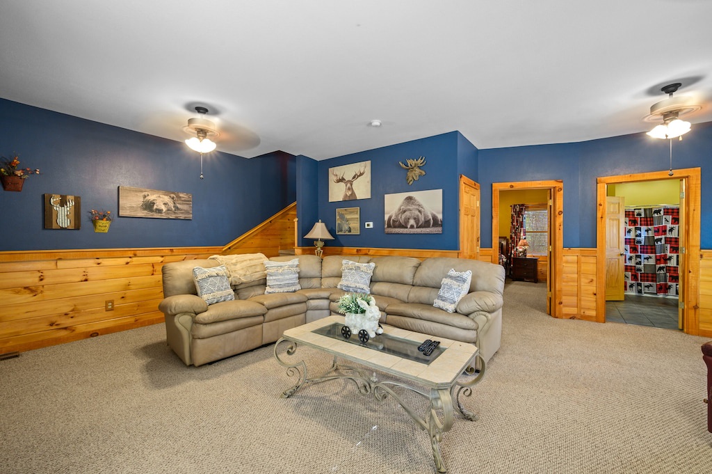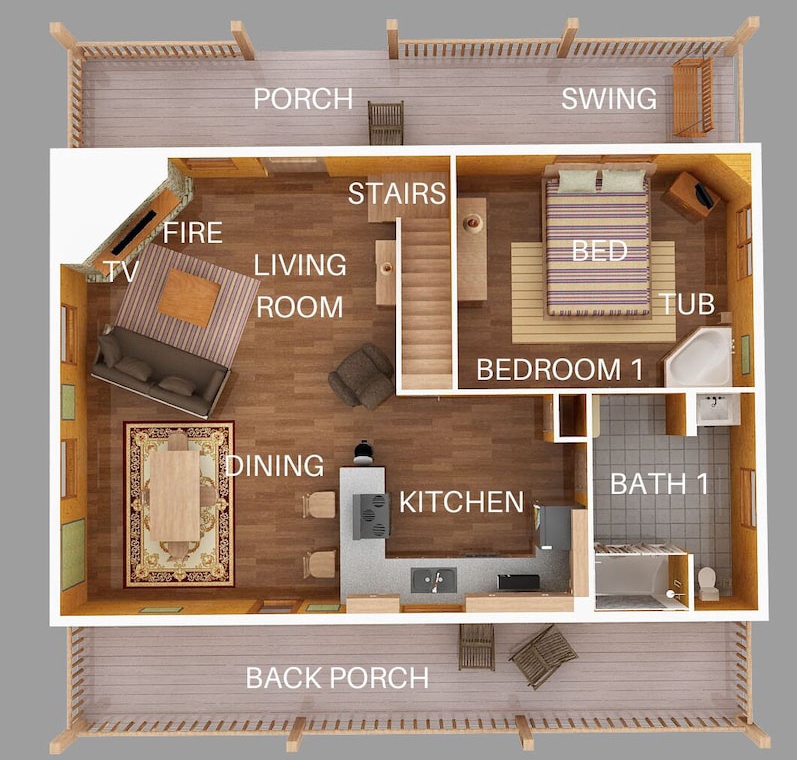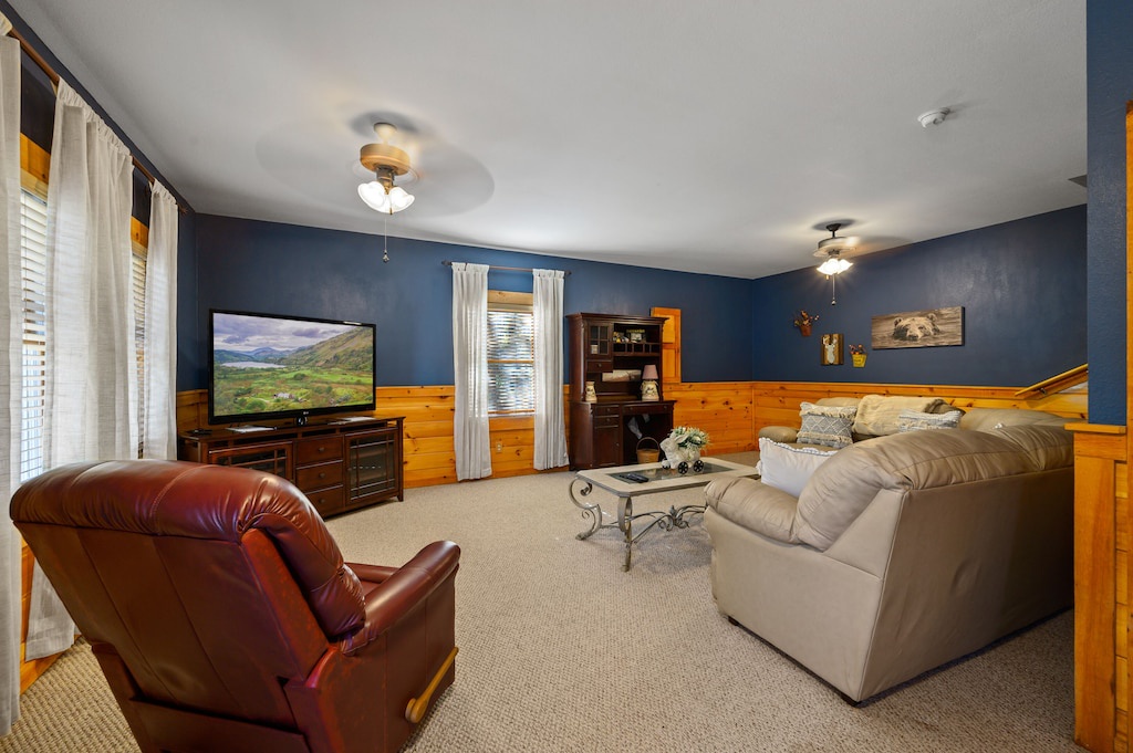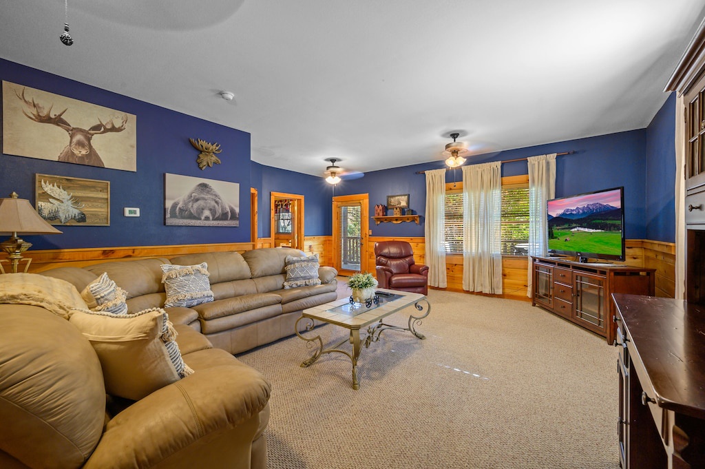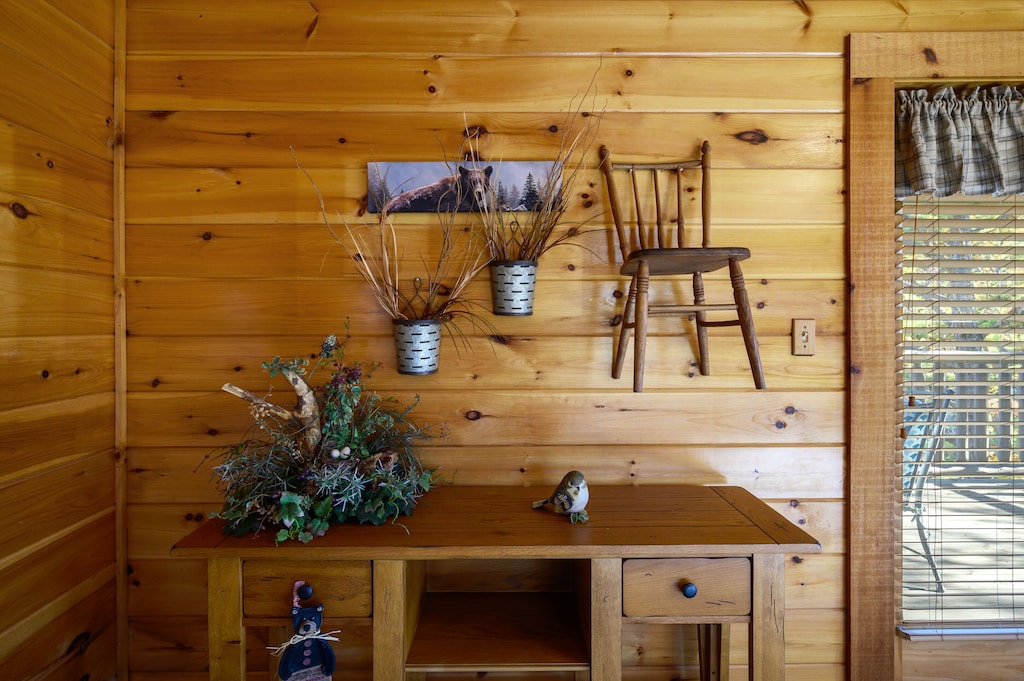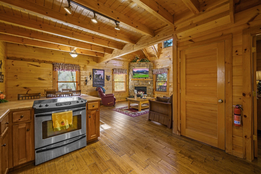 Fully furnished cabin, high ceilings and stone stacked fireplace, spacious second living area downstairs with comfortable couches and huge TV, loft game area with foosball ; arcade game, jacuzzi bath tub, free Wifi, spacious bedrooms and living spaces