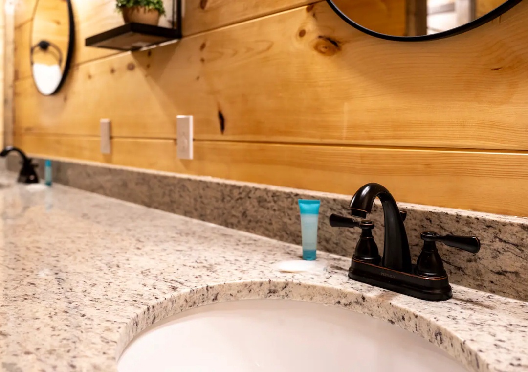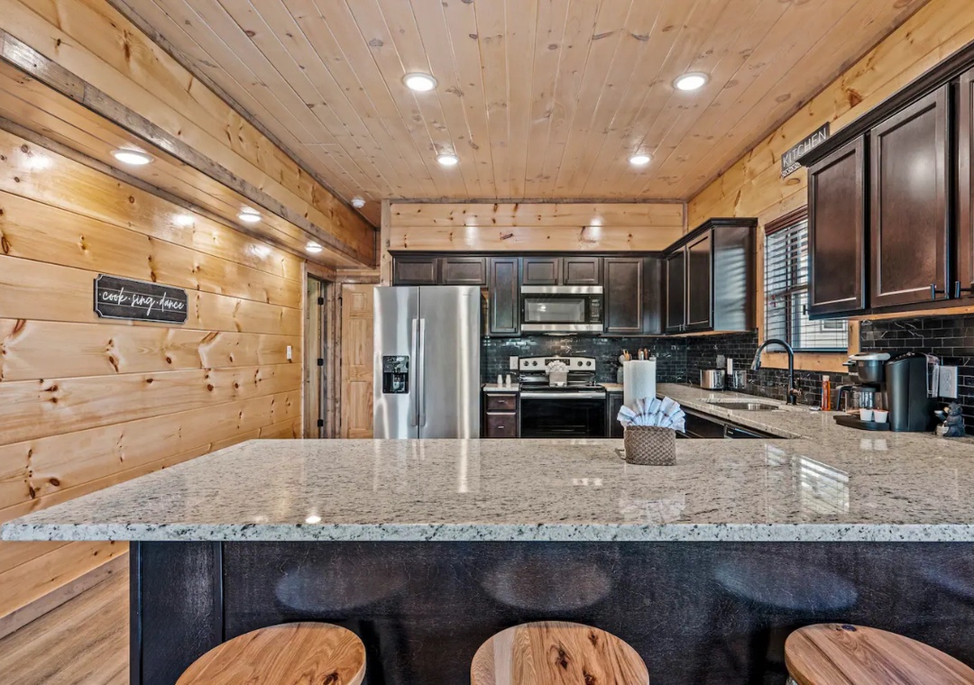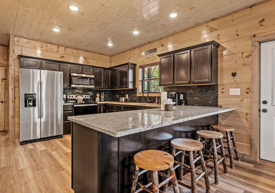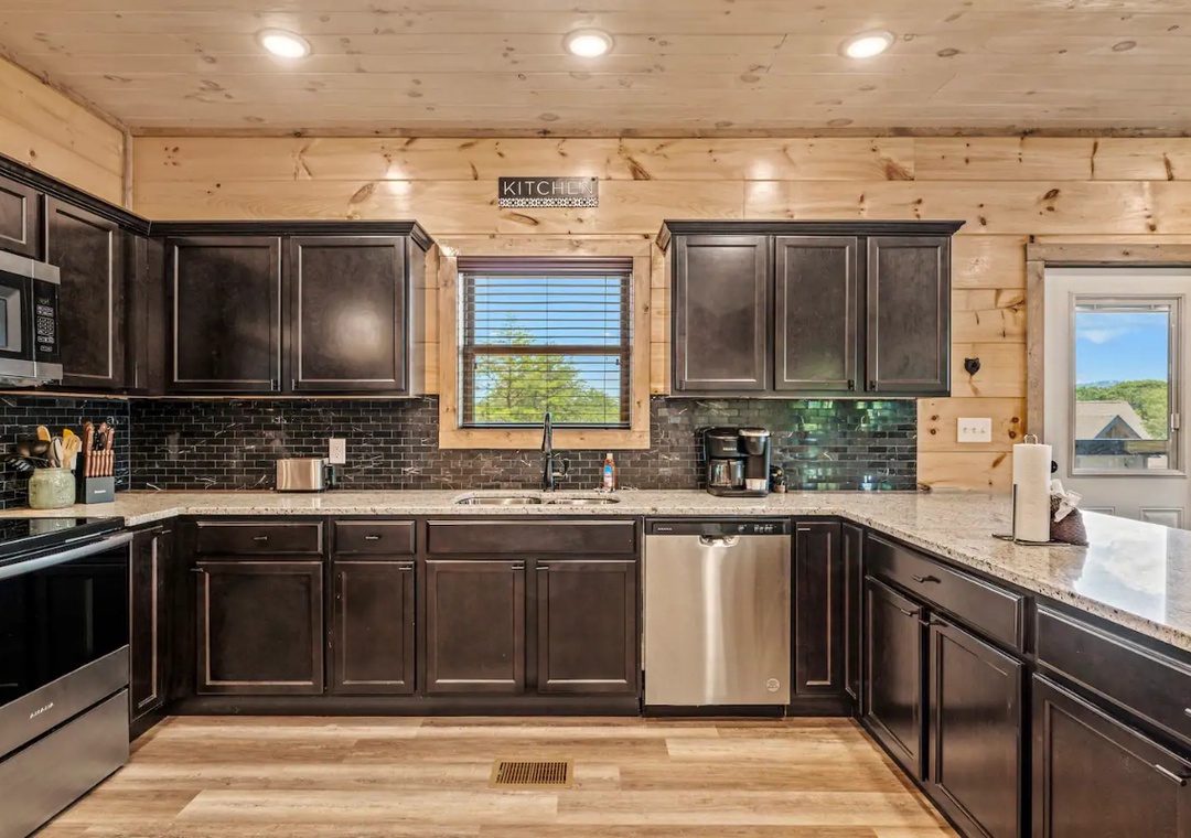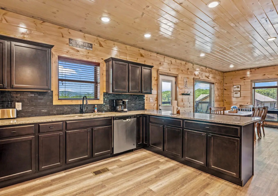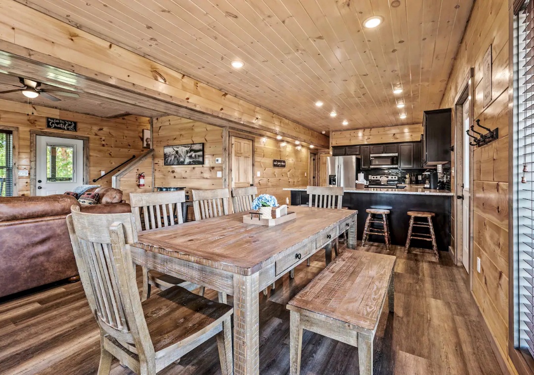 Our gourmet kitchen is well-equipped with modern appliances and has everything you need to prepare delicious meals while on your vacation! From gorgeous countertops to a full-sized refrigerator, dishwasher, stove, microwave, and other kitchen appliances, our kitchen is perfect for making breakfast, lunch, or dinner throughout your stay! All pots, pans, glasses, plates, silverware, etc. are also there for you. Gather around the dining table with your loved ones and savor home-cooked dishes while enjoying the breathtaking natural ambiance that surround you.