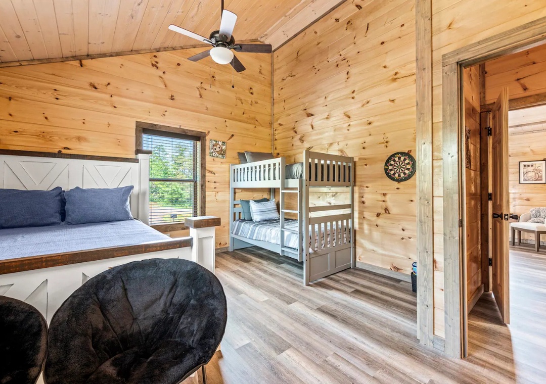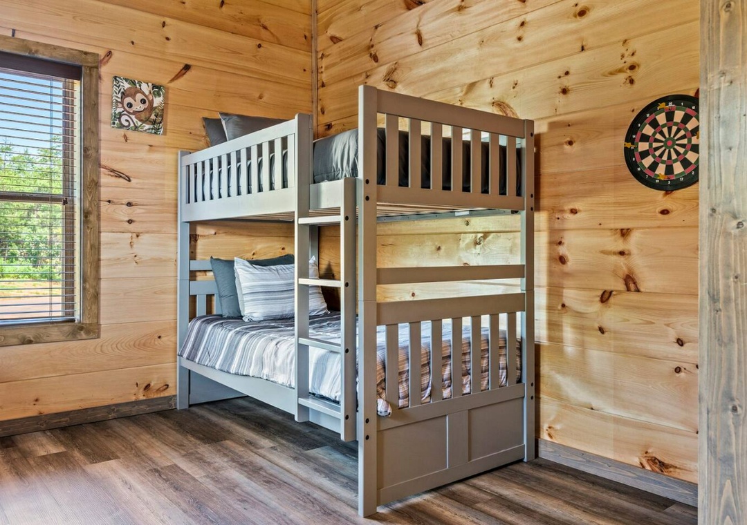 ✔ Bedroom #4 (upper level): Comfy bedroom with a twin over twin bunk bed + Queen-sized bed and flat-screen TV; Access to full-sized bathroom located off the hallway with shower/tub combination