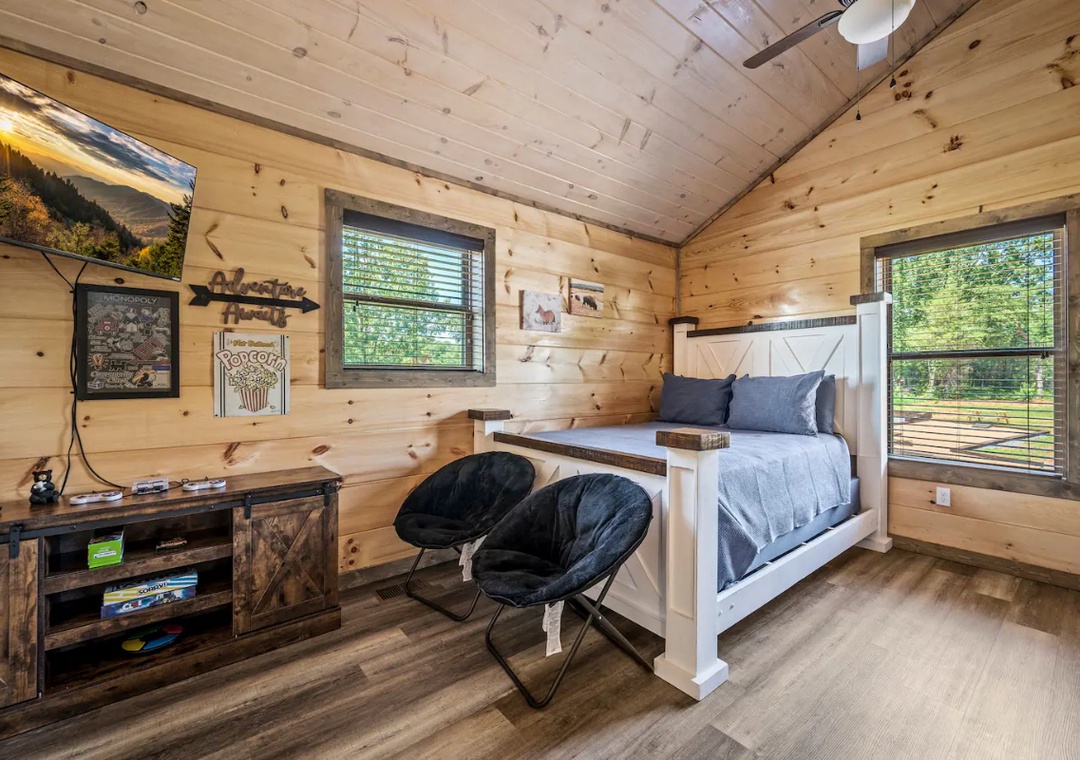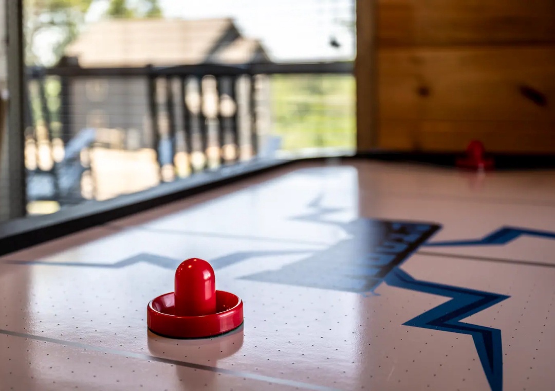 As you venture outside onto the expansive decks, the allure of the outdoor space continues to captivate. Take a seat in the rocking chairs surrounding the outdoor fireplace and let the warmth and crackling flames embrace you. Whether you're sipping your morning coffee or unwinding with a glass of wine at sunset, this outdoor sanctuary is the perfect place to reconnect. Grill up some dinner on the outdoor BBQ grill. Soak all your worries away in the outdoor hot tub too! Inside, the kids (and adults alike!) will love the arcade, air hockey table AND nintendo gaming system! Here at Bear Monkey Lodge there is something for everyone!
