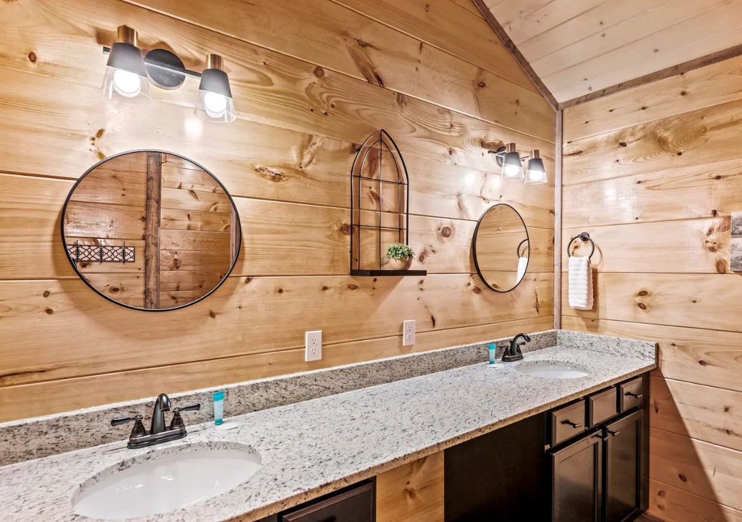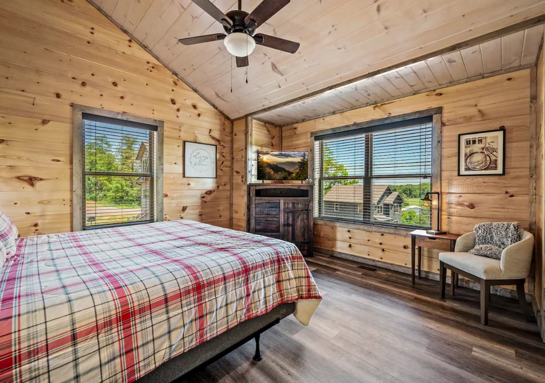 ✔ Bedroom #2 (upper level): Comfy bedroom with King-sized bed and flat-screen TV; Full-sized bathroom with separate shower and tub; Dual sinks