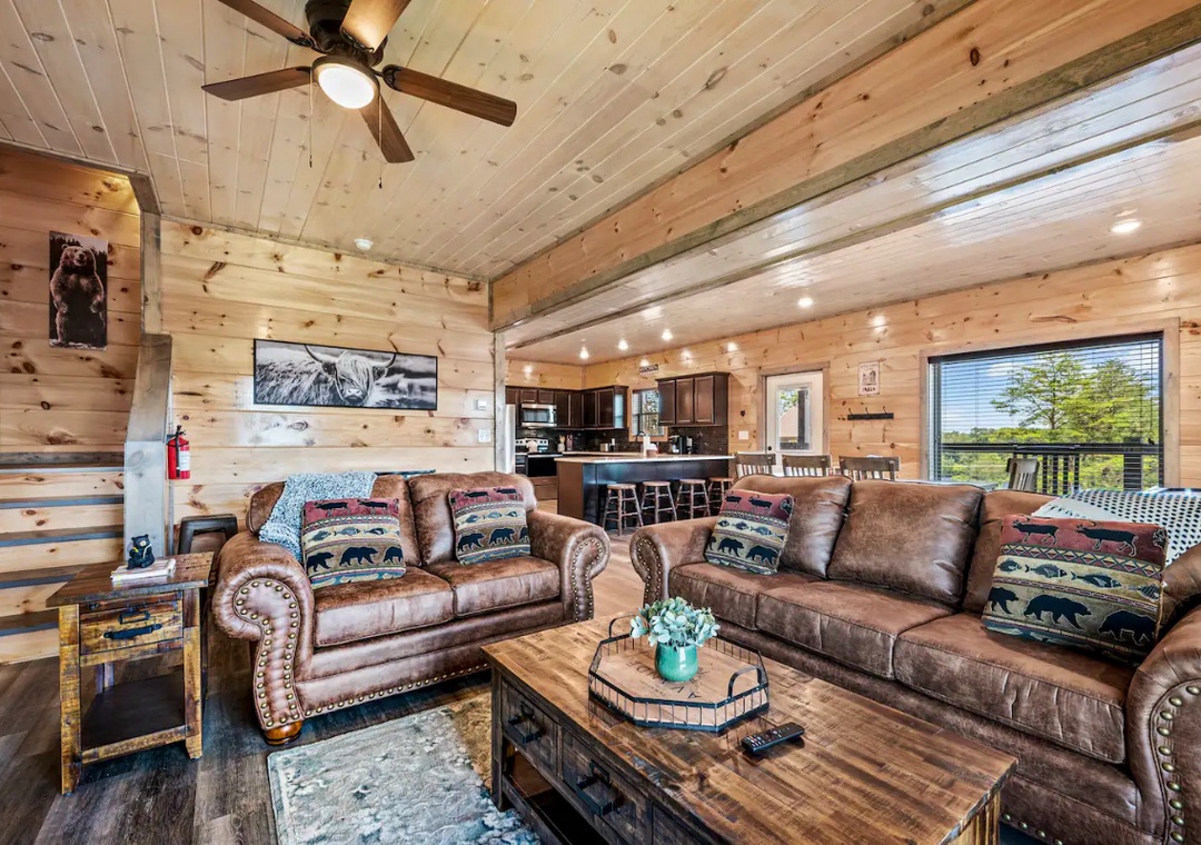 “Bear Monkey Lodge” offers an escape from the ordinary and invites you to immerse yourself in a world of natural beauty and refined comforts. Surrounded by nature's beauty, our spacious mountain lodge is the perfect destination for those seeking tranquility or adventure! . Our floorplan is ideal for both families and couples alike and is the perfect get-a-way. So, pack your bags – because the mountains are calling!