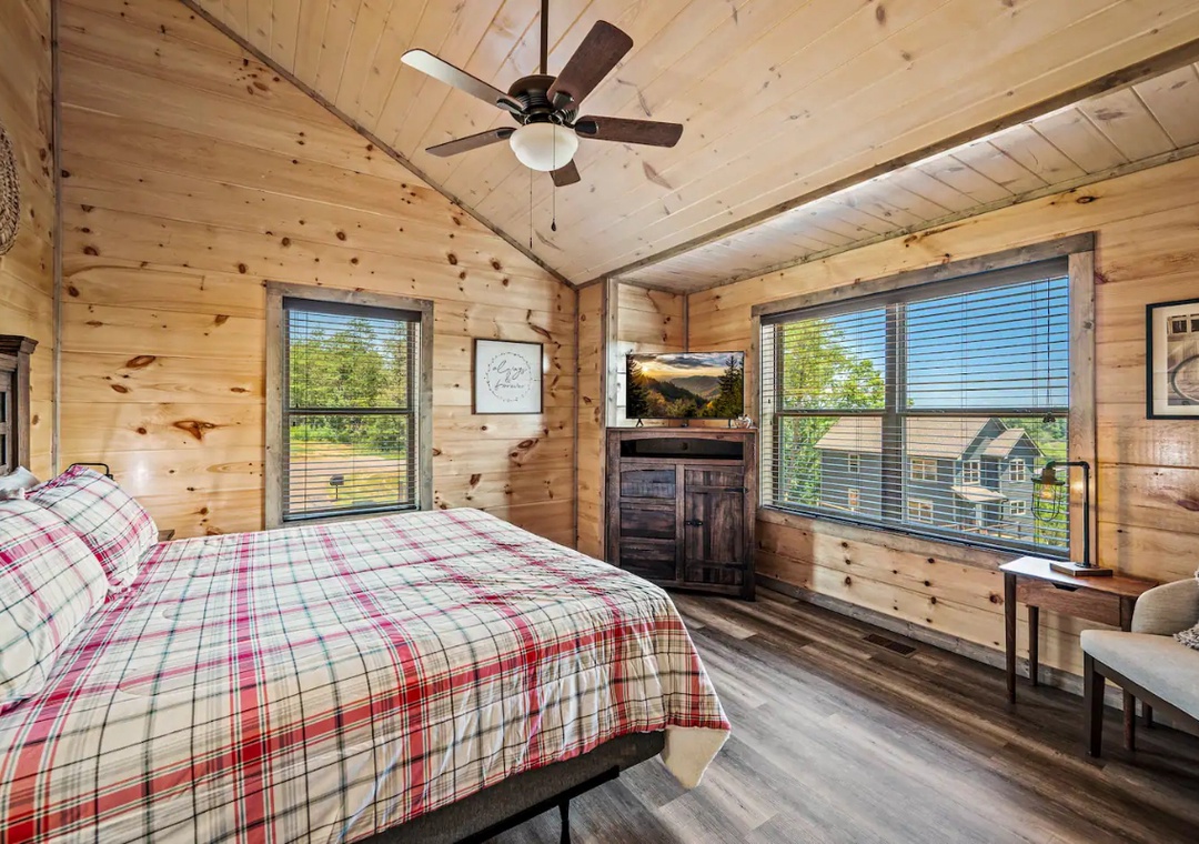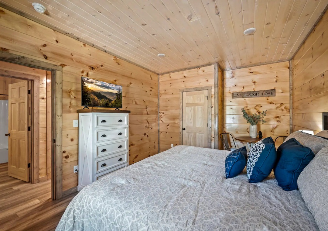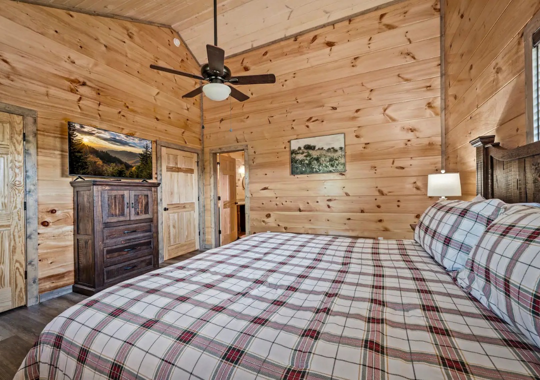 ✔ Bedroom #1 (main level): Spacious bedroom with King-sized bed and flat-screen TV; Access to a full-sized bathroom with shower/tub combination