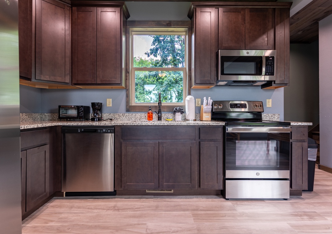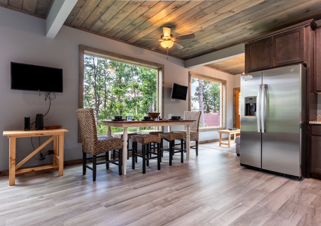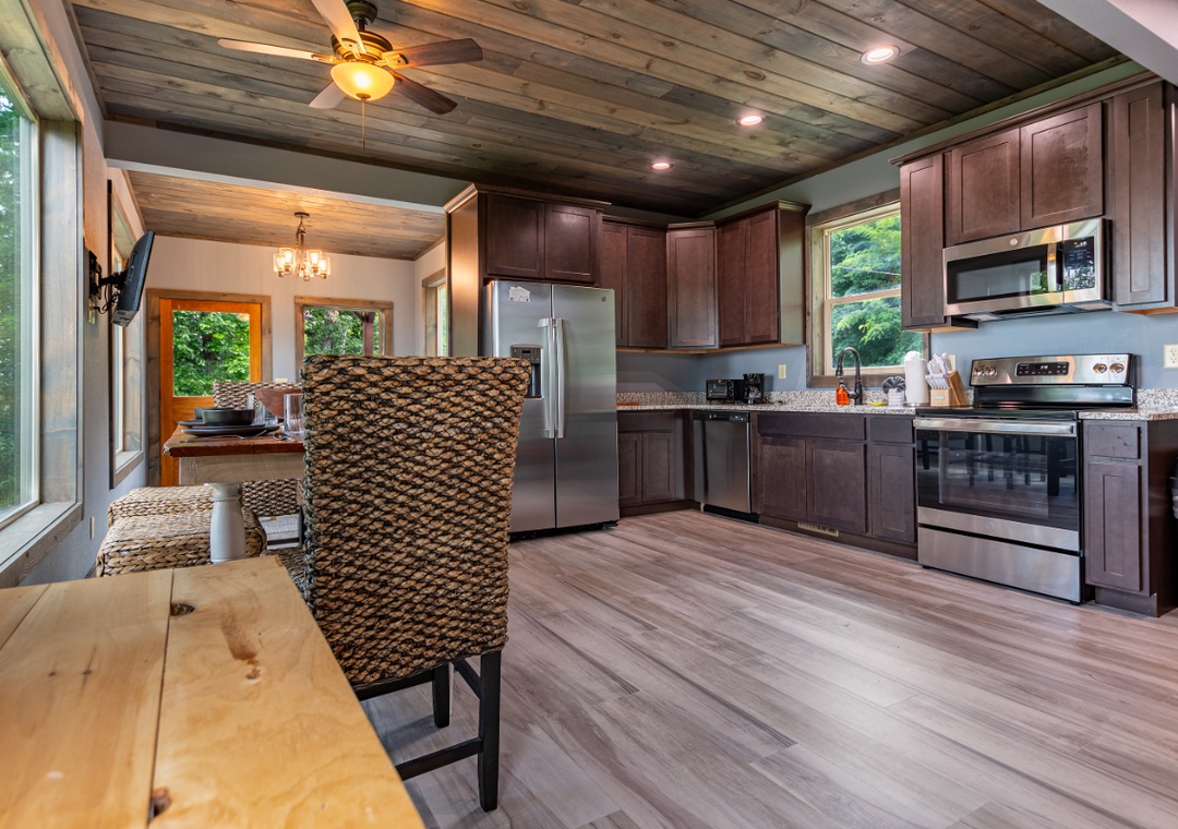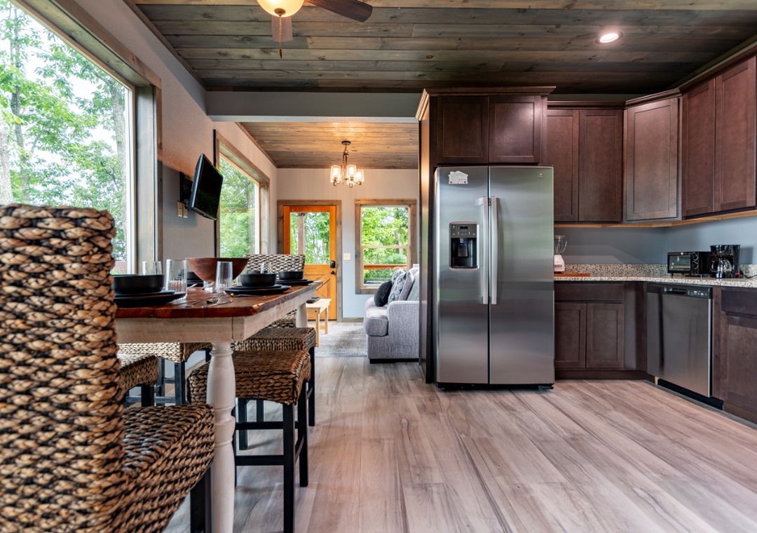 The fully equipped kitchen stands ready to fulfill all your culinary desires. Complete with a full-sized refrigerator, dishwasher, stove, microwave, and other kitchen appliances perfect for making breakfast, lunch, or dinner throughout your stay! All pots, pans, glasses, plates, silverware, etc. are also there for you! Enjoy your creations on the inviting dining table creating the perfect setting for shared meals and laughter.