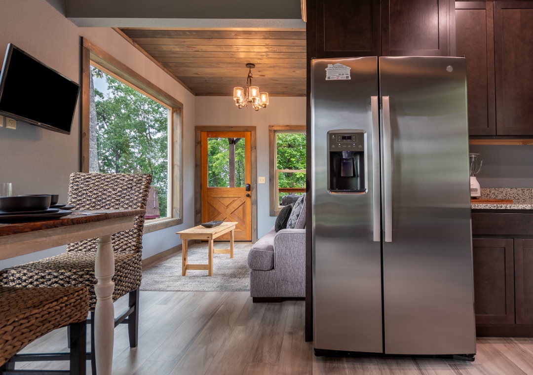 Upon entering, you'll be captivated by the elegant design and cozy atmosphere. The spacious living area features tasteful furnishings, with a plush sofa and armchairs that invite you to relax and unwind. The highlight of the living area is the expansive wall-sized windows, providing stunning views of the Gatlinburg City Lights and the surrounding mountains. Whether you're enjoying a quiet evening or watching for bears, this space offers a front-row seat to nature's splendor. The open-concept layout seamlessly connects the living area to the fully equipped kitchen, where modern appliances and ample counter space make meal preparation a breeze. Share intimate meals at the dining table, where you can savor delicious food while taking in the breathtaking scenery. Also find the luxurious bedroom - a sanctuary of comfort and relaxation. Here, you'll find a Jacuzzi tub, offering a private and indulgent bathing experience. Free Wifi is also available throughout the property.