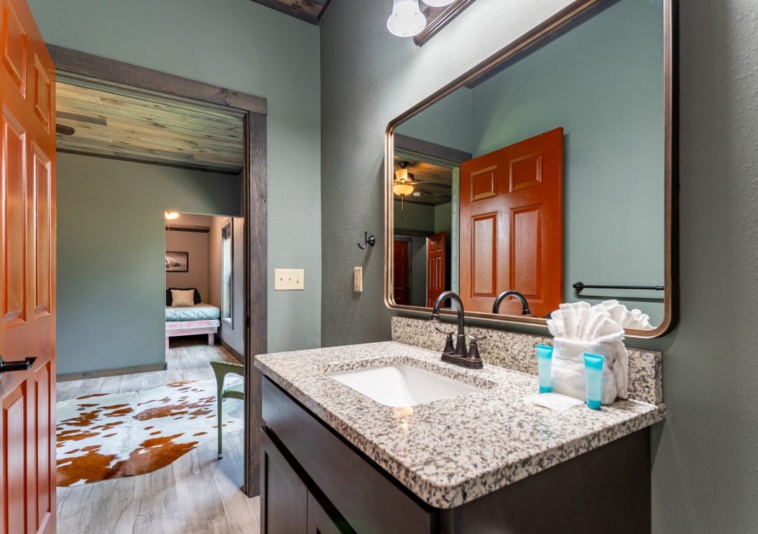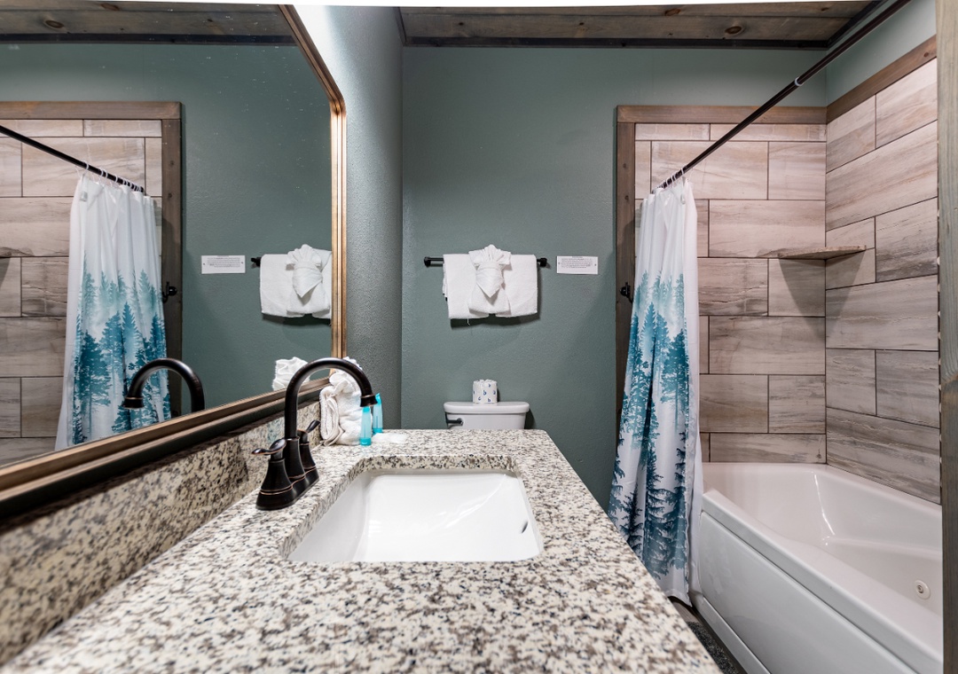 ✔ Bedroom #1 (Lower Level): Spacious bedroom with King-sized bed, a Twin Bed, Flatscreen TV and Attached Full Bathroom with Shower/Jacuzzi Combo