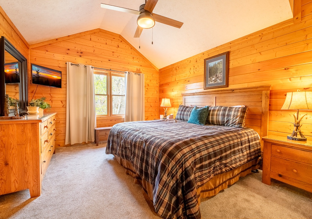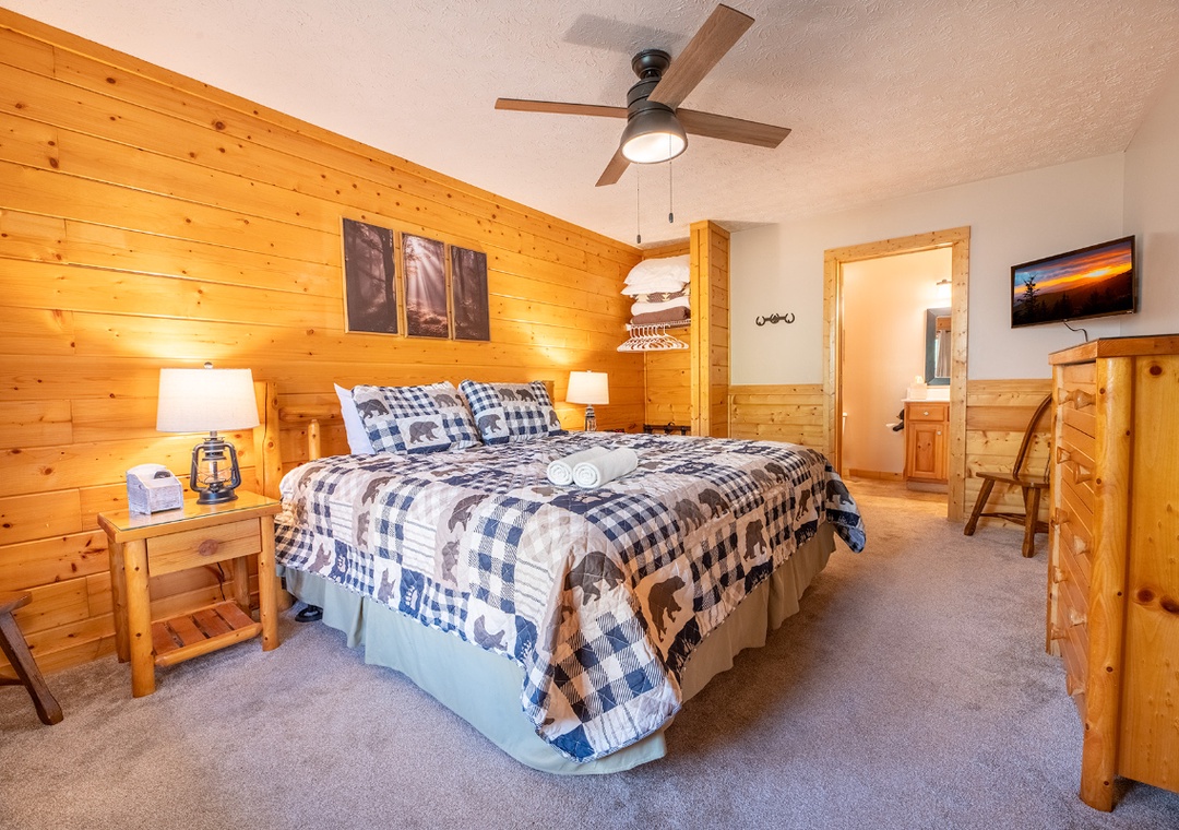 ✔ Bedroom #2 (Upper Level): Comfy Bedroom with a King-sized Bed and a Flat-screen TV; Attached Full Bathroom with Stand Up Shower