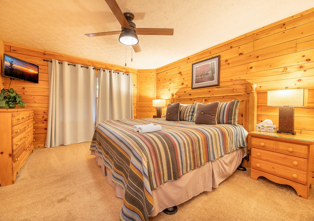 ✔ Bedroom #1 (Main Level): Spacious Bedroom with a King-sized Bed and a Flat-screen TV; Attached Full Bathroom with Shower/Tub Combo