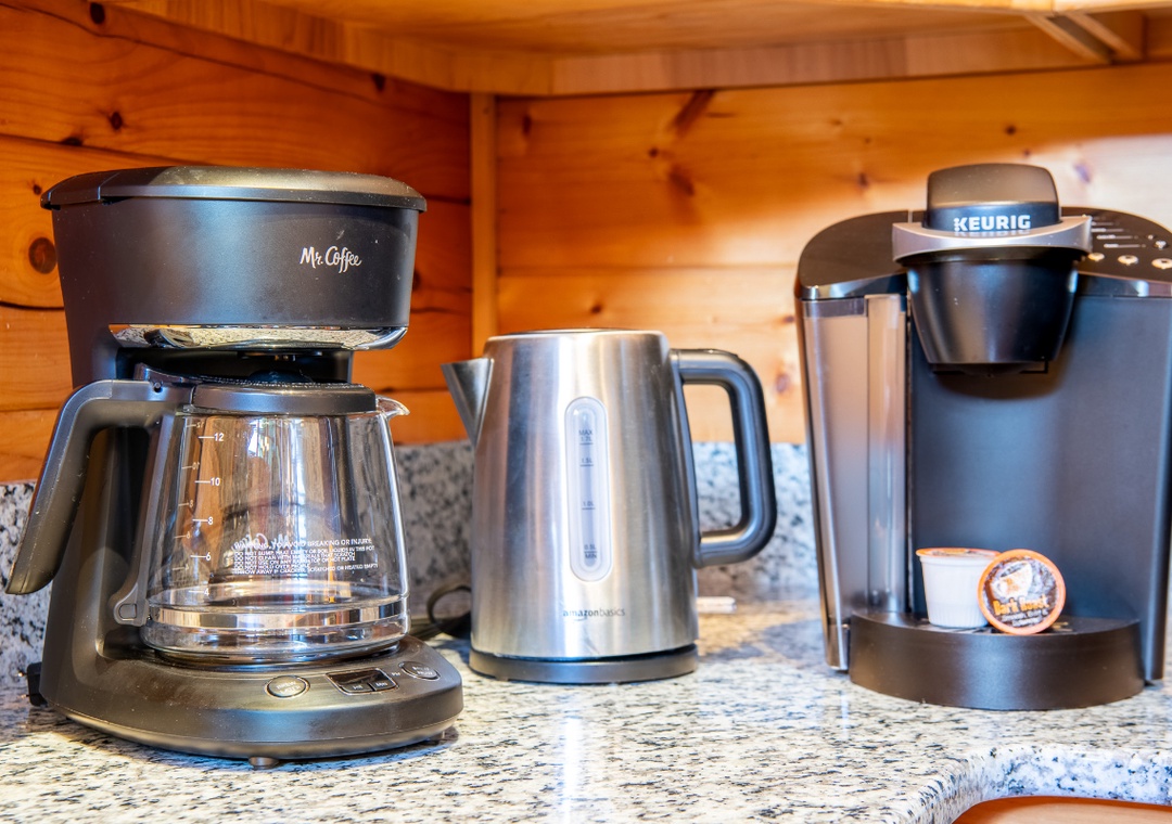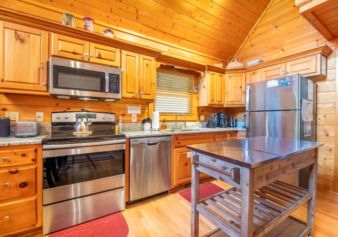 The fully-equipped kitchen boasts modern amenities, making it easy to prepare delicious meals for your family or friends. Well-appointed with a full-sized refrigerator, dishwasher, stove, microwave, and other kitchen appliances perfect for making breakfast, lunch, or dinner throughout your stay! All pots, pans, glasses, plates, silverware, etc., are also there for you! Gather around the inviting dining table to share stories and laughter. The side deck also offers an al fresco dining area that’s perfect for meals with a view, as it invites you to savor each bite while taking in the natural beauty of the surroundings.