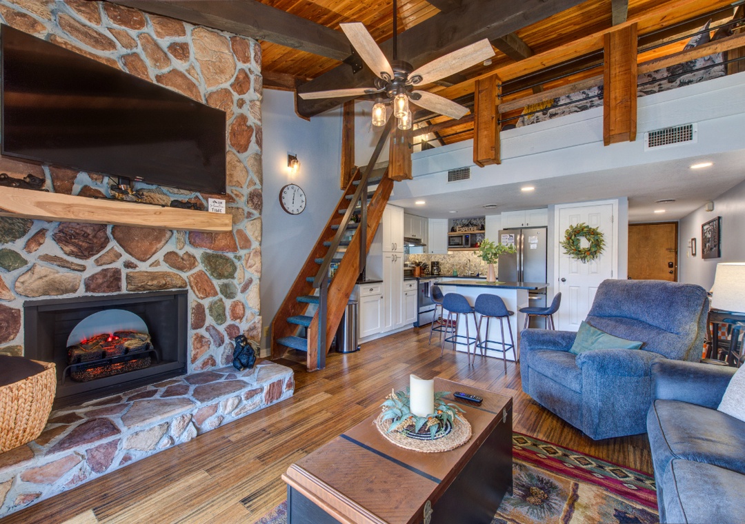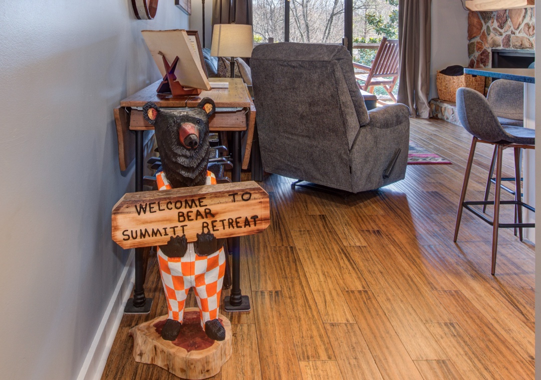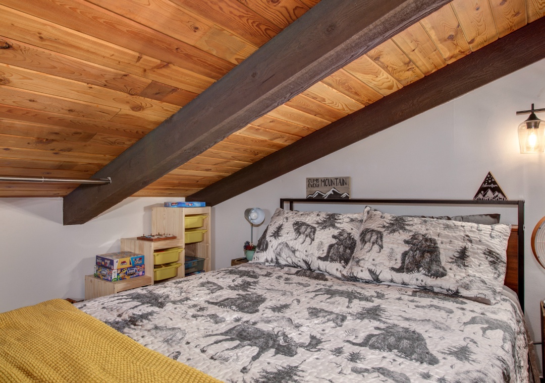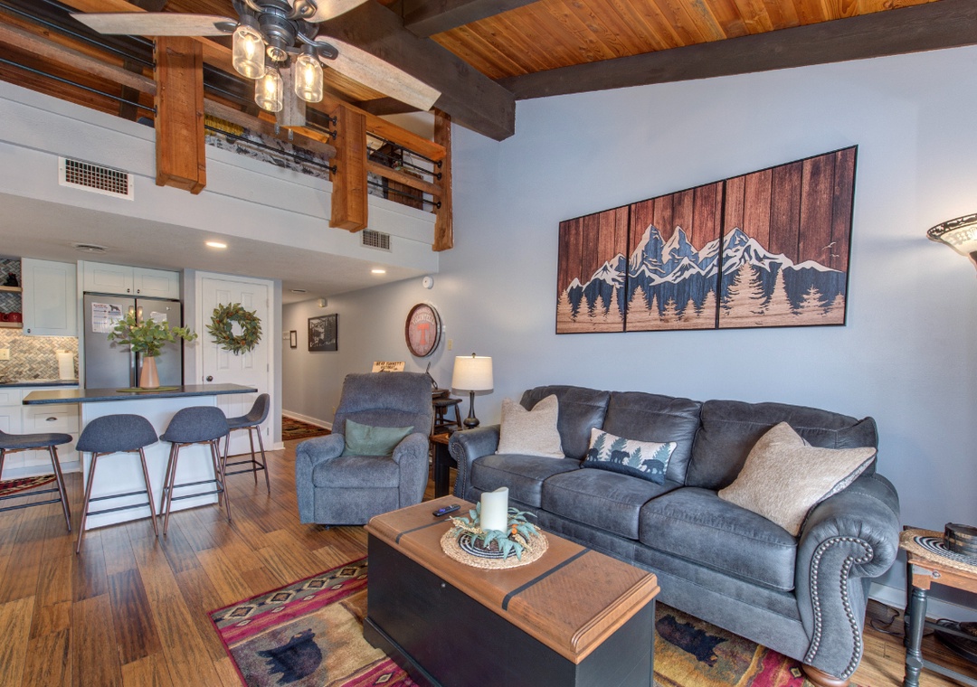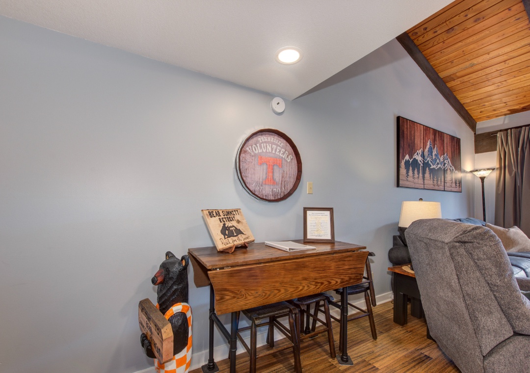 The living room is designed for comfort and connection. Plush seating invites you to kick back and unwind. The electric fireplace paired with a Roku TV adds a soft glow and cozy ambiance while you enjoy family movie marathons, streaming your favorite shows, or simply relaxing after a full day of exploring the Smokies. The open layout allows the living room to flow effortlessly into the kitchen and dining area, creating a space that feels both spacious and intimate. The bedroom on the main level offers a quiet, comfortable retreat designed for restful nights and relaxed mornings. Upstairs, the loft adds another layer of indoor comfort and versatility, making “Bear Summitt Retreat” ideal for families. Free WiFi is also available throughout the property.