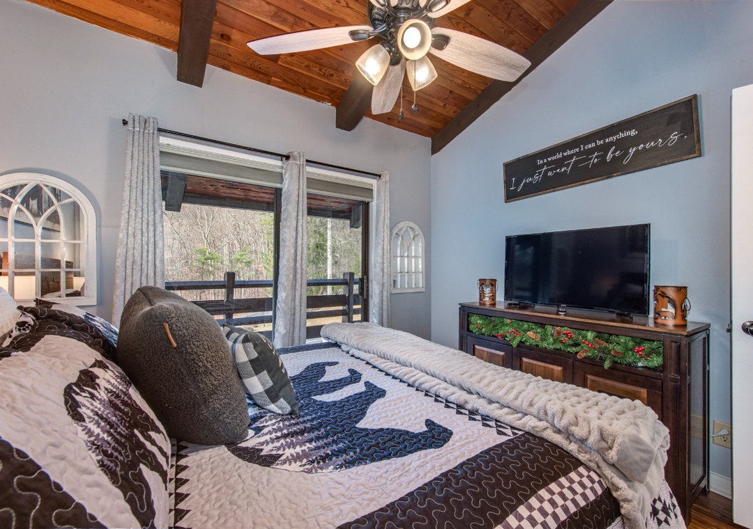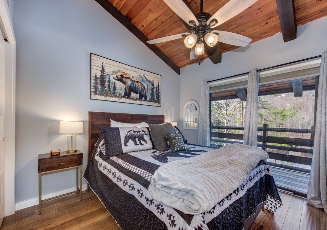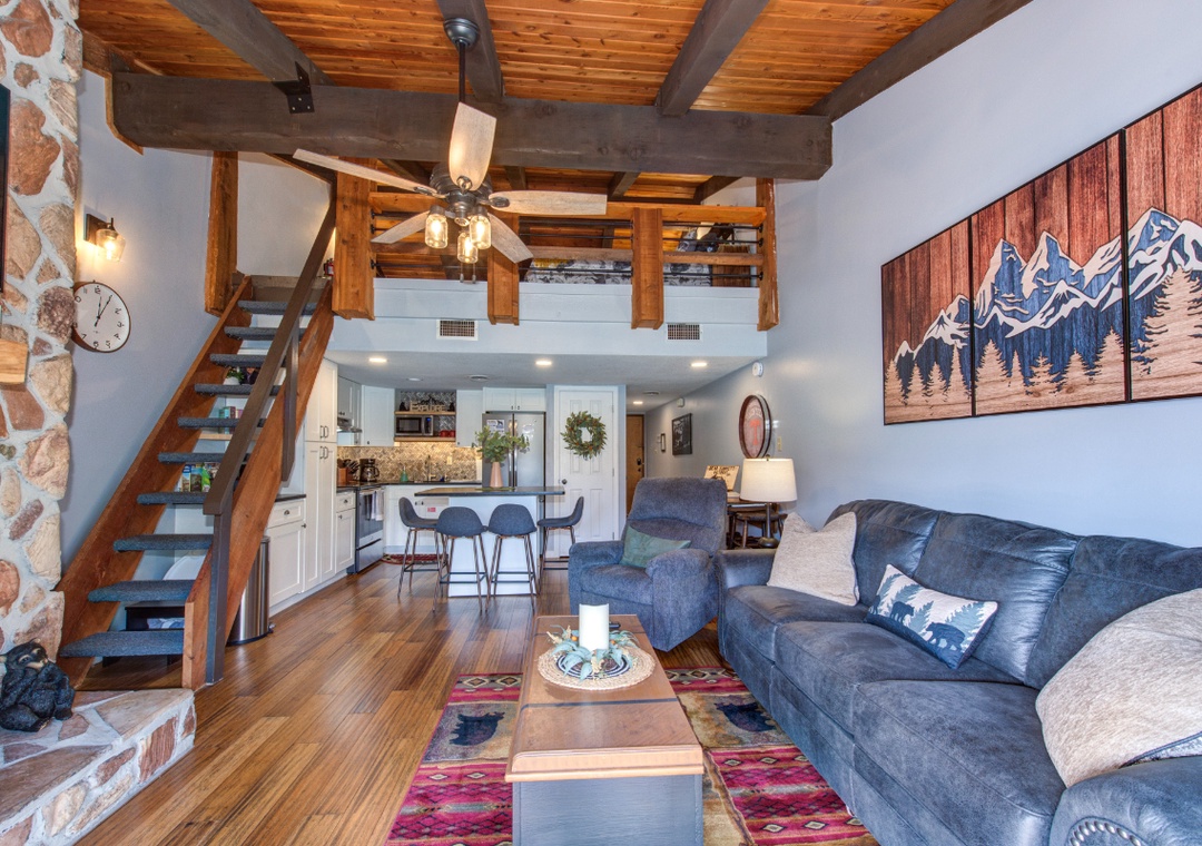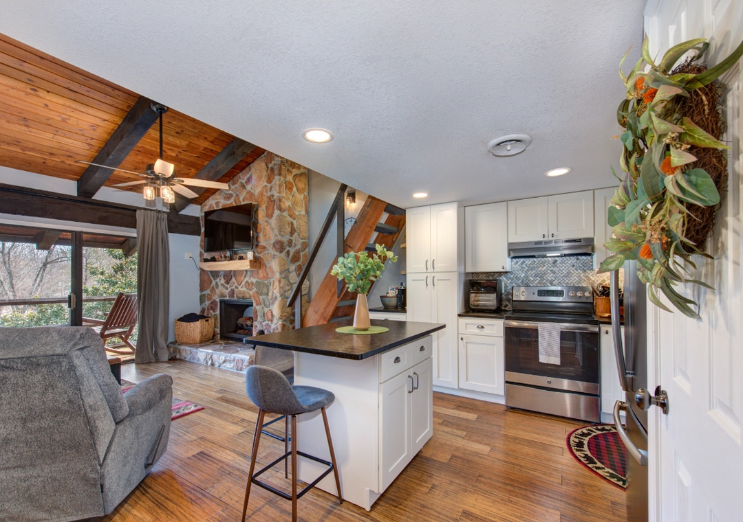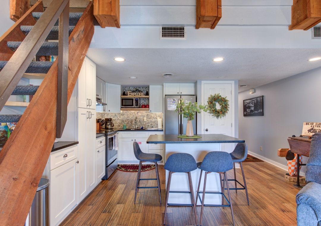 The living room is designed for comfort and connection. Plush seating invites you to kick back and unwind. The electric fireplace paired with a Roku TV adds a soft glow and cozy ambiance while you enjoy family movie marathons, streaming your favorite shows, or simply relaxing after a full day of exploring the Smokies. The open layout allows the living room to flow effortlessly into the kitchen and dining area, creating a space that feels both spacious and intimate. The bedroom on the main level offers a quiet, comfortable retreat designed for restful nights and relaxed mornings. Upstairs, the loft adds another layer of indoor comfort and versatility, making “Bear Summitt Retreat” ideal for families. Free WiFi is also available throughout the property.