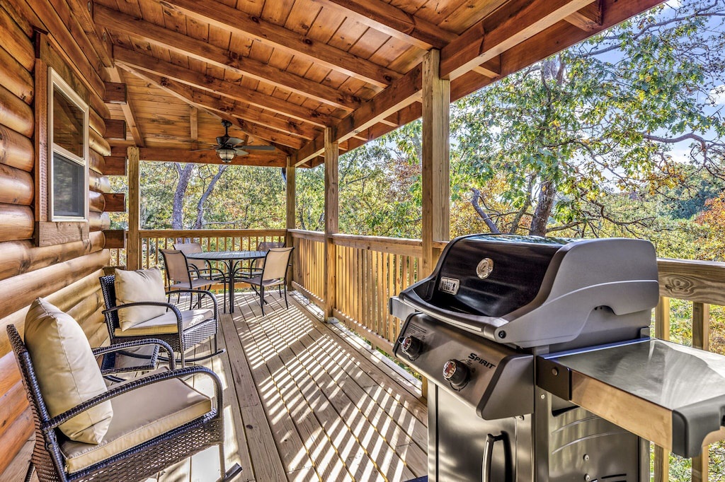 The cabin was just as described. Spacious and tastefully decorated. Very clean. Beds were very comfortable. Kitchen well equipped. Wonderful wrap around porch. Very peaceful to sit outside, play games, grill, eat a meal and enjoy the quiet. Very quick response to any questions that came up during our stay. Would highly recommend and would definitely book this cabin again.- Reviewed On: 10/16/2023