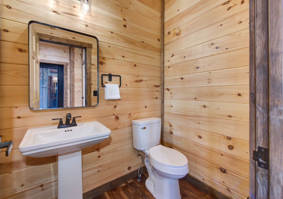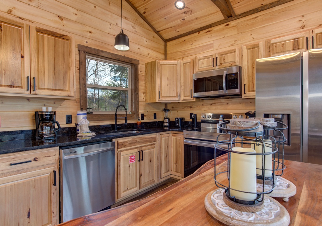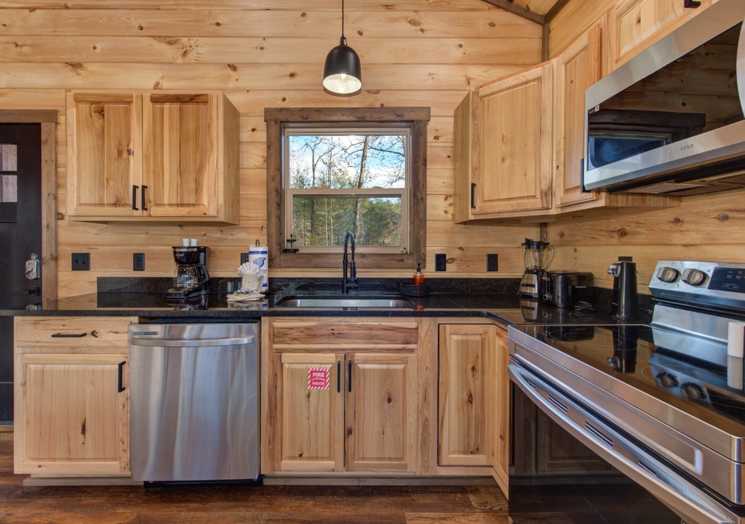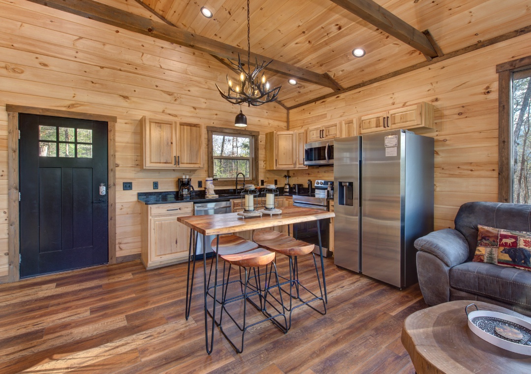 The living room is the heart of the cabin, offering a plush sofa, a large flatscreen TV. The open layout of the main level seamlessly connects the living area to the kitchen and dining space, allowing conversation and connection to flow freely. The fully equipped kitchen and dining area has everything you need to prepare meals during your stay. Downstairs, you’ll find the heated indoor pool, offering the luxury of year-round enjoyment no matter the weather outside. Also located on the lower level, the game room is a favorite for guests of all ages. Free WiFi is also available throughout the property.